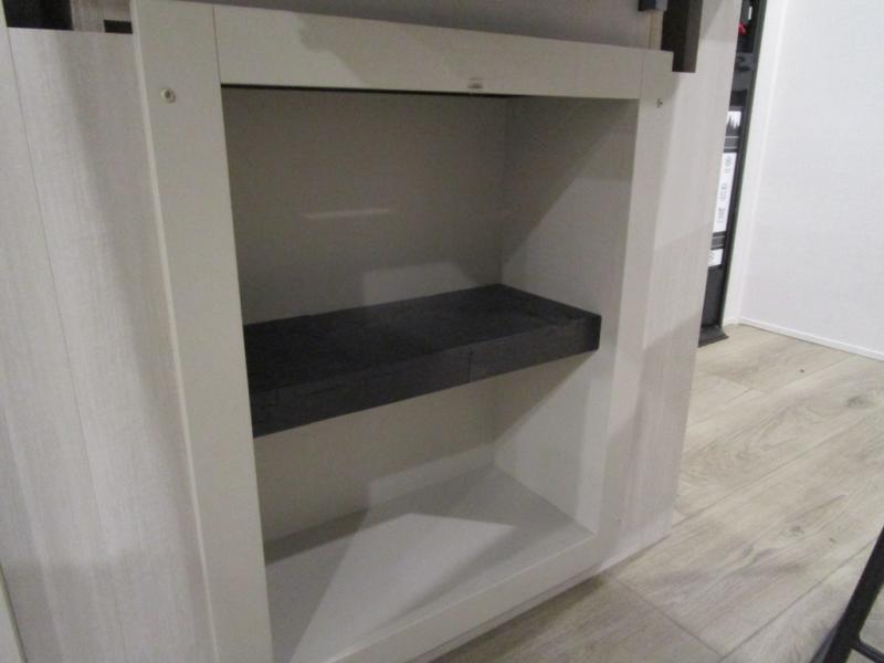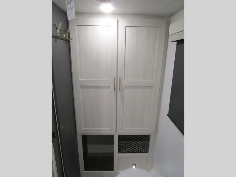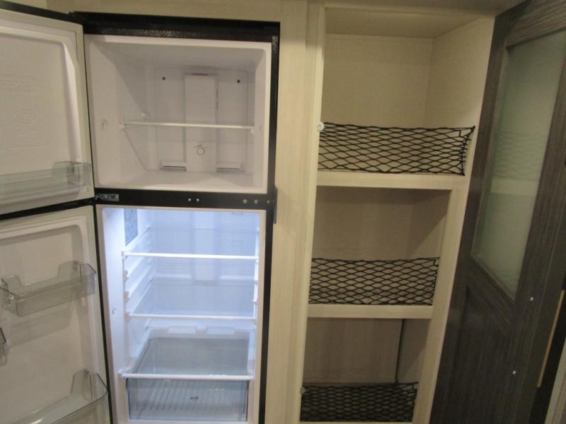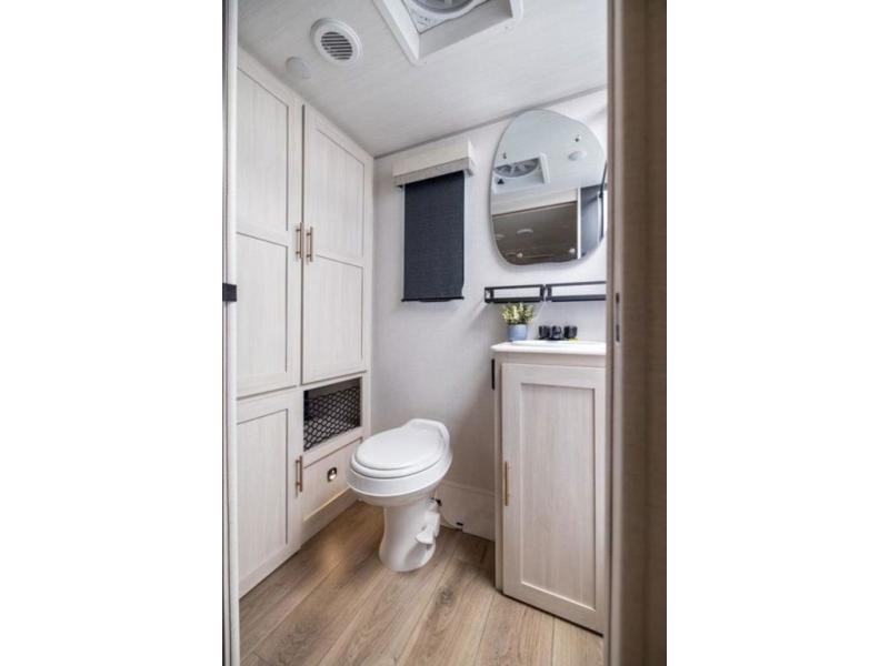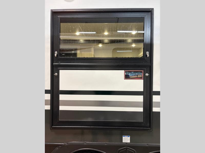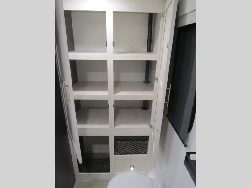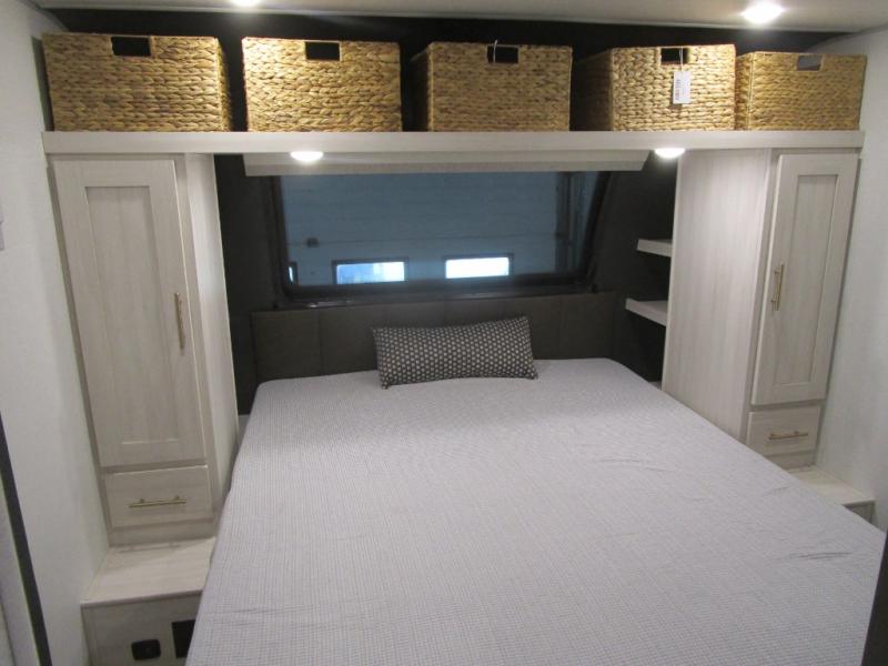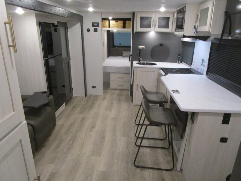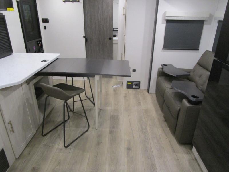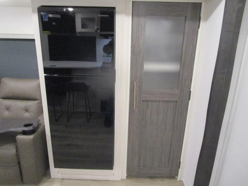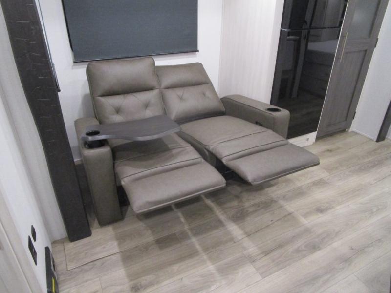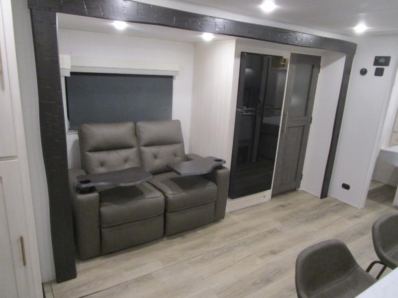 The rear bathroom with a linen closet is for personal care and storage of linens, a front bedroom with a king bed and two wardrobes, creates a serene retreat with ample storage for clothing and personal items, perfect for restful nights. The theater seating provides immersive comfort for relaxation and entertainment, ideal for enjoying movies or unwinding after a day of exploration. Overhead cabinets deliver additional storage for travel essentials and keepsakes. The kitchen area boasts a fridge, a pantry, an air fryer/microwave that combines versatility for quick and healthy meal preparation, a countertop extension, and a flip-up window that enhances ventilation and brings in natural light for a bright kitchen ambiance. You can also enjoy the outdoor living delights by cooking in the incredible outlook kitchen under the protection of the power awning.