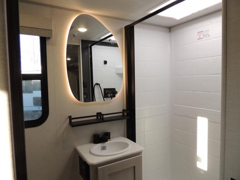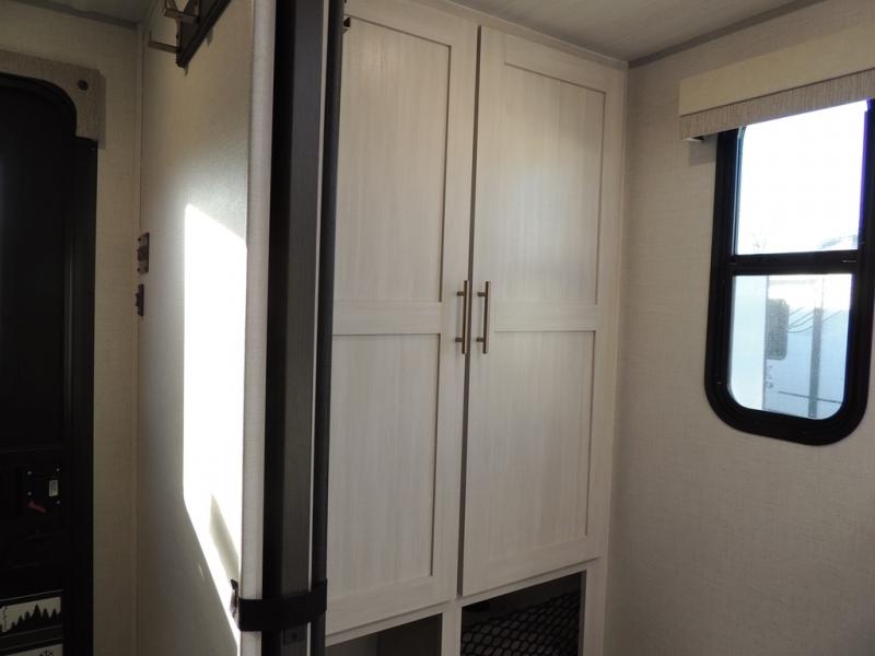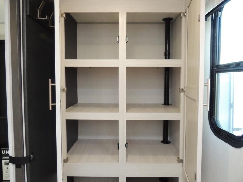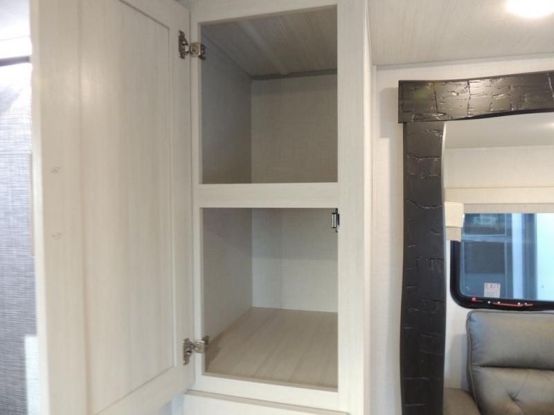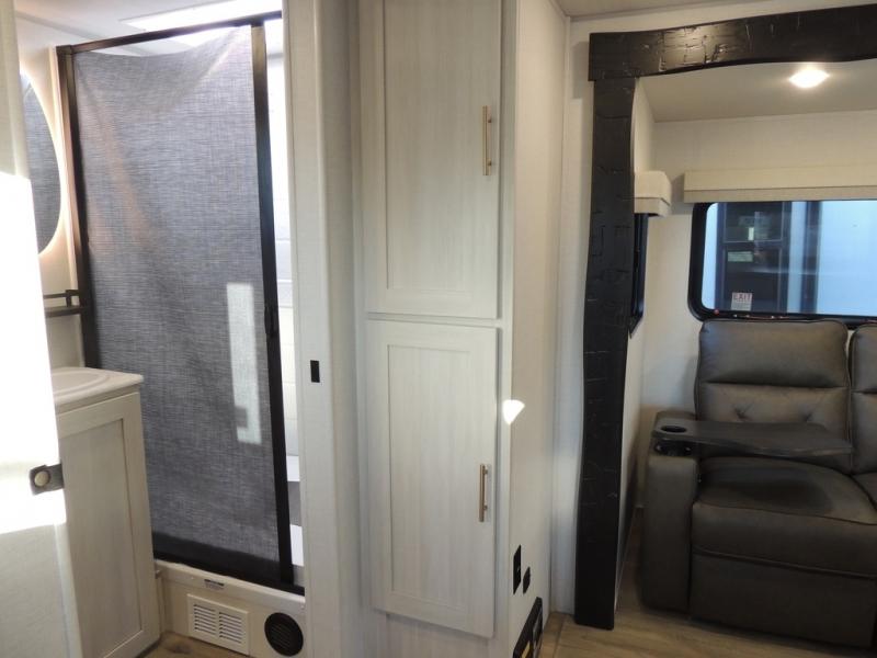 The rear bathroom with a linen closet is for personal care and storage of linens, a front bedroom with a king bed and two wardrobes, creates a serene retreat with ample storage for clothing and personal items, perfect for restful nights. The theater seating provides immersive comfort for relaxation and entertainment, ideal for enjoying movies or unwinding after a day of exploration. Overhead cabinets deliver additional storage for travel essentials and keepsakes. The kitchen area boasts a fridge, a pantry, an air fryer/microwave that combines versatility for quick and healthy meal preparation, a countertop extension, and a flip-up window that enhances ventilation and brings in natural light for a bright kitchen ambiance. You can also enjoy the outdoor living delights by cooking in the incredible outlook kitchen un ther the protection of the power awning.
