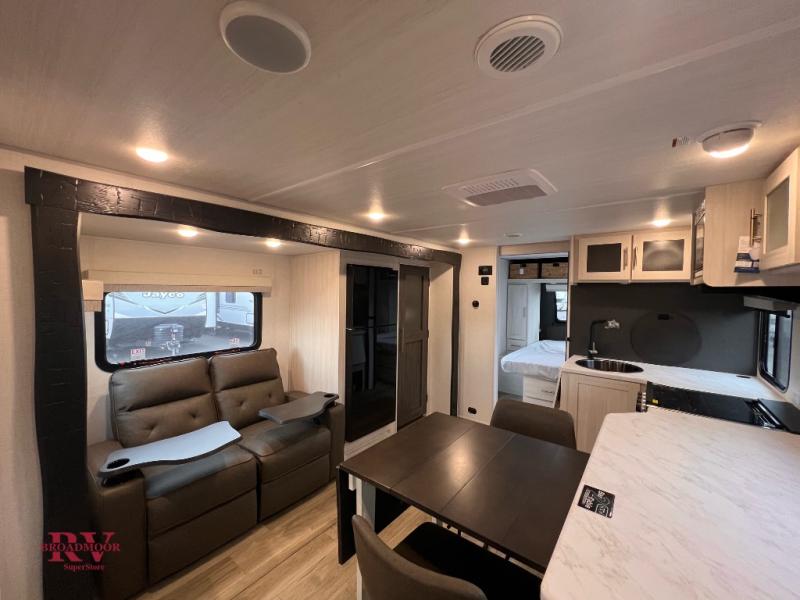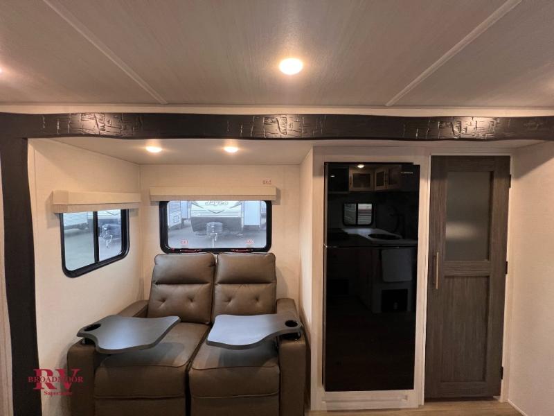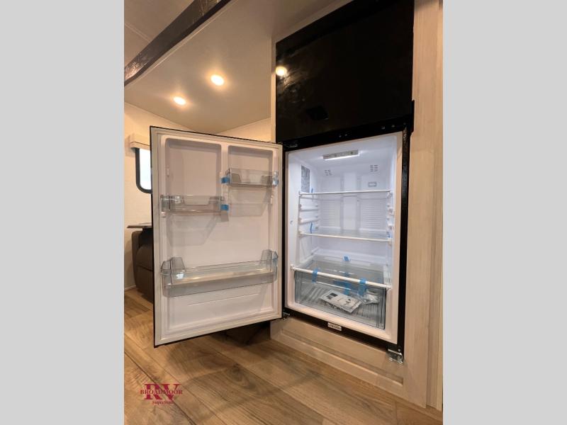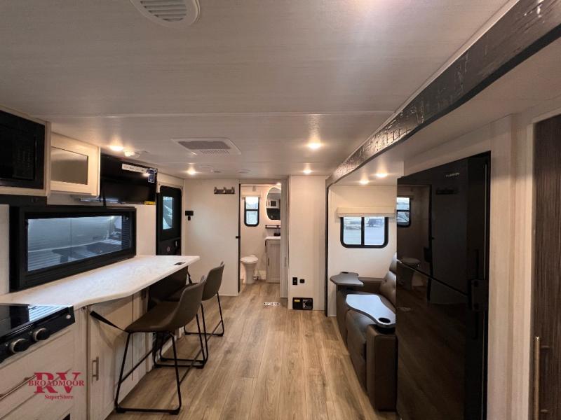 The rear bathroom with a linen closet is for personal care and storage of linens, a front bedroom with a king bed and two wardrobes, creates a serene retreat with ample storage for clothing and personal items, perfect for restful nights. The theater seating provides immersive comfort for relaxation and entertainment, ideal for enjoying movies or unwinding after a day of exploration. Overhead cabinets deliver additional storage for travel essentials and keepsakes. The kitchen area boasts a fridge, a pantry, an air fryer/microwave that combines versatility for quick and healthy meal preparation, a countertop extension, and a flip-up window that enhances ventilation and brings in natural light for a bright kitchen ambiance. You can also enjoy the outdoor living delights by cooking in the incredible outlook kitchen un ther the protection of the power awning.