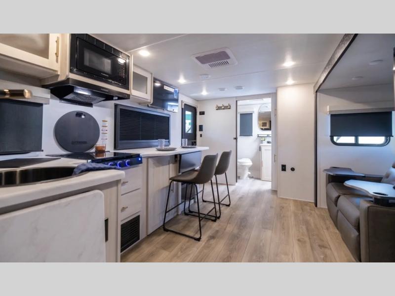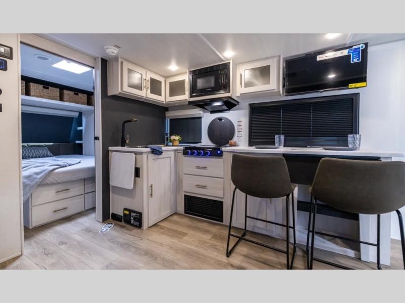 The Forest River Un-Mapped travel trailers deliver an unparalleled travel experience thanks to their incredible features, starting with the aluminum-framed floor with block foam insulation that ensures exceptional structural integrity and thermal efficiency, along with the sealed underbelly with forced heat & radiant foil barrier that provides superior insulation and heat management, and the power tongue jack facilitates easy maneuvering and stabilization of the trailer. Plus, the 30 Amp charge controller with solar inverter prep is ready for integration with solar power systems, catering to eco-conscious travelers seeking off-grid capabilities. Inside, you will find seamless Surf-X kitchen countertops that offer a sleek, durable surface and are easy to maintain for busy travelers. Further, the blackout roller shades will add privacy and light control for restful nights and cozy daytime retreats.