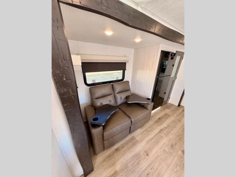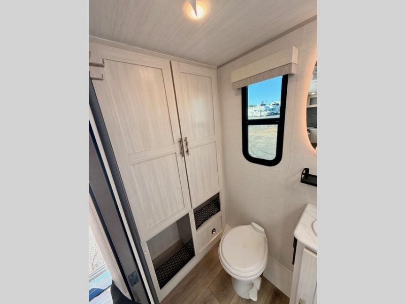 The rear bathroom with a linen closet is for personal care and storage of linens, a front bedroom with a king bed and two wardrobes, creates a serene retreat with ample storage for clothing and personal items, perfect for restful nights. The theater seating provides immersive comfort for relaxation and entertainment, ideal for enjoying movies or unwinding after a day of exploration. Overhead cabinets deliver additional storage for travel essentials and keepsakes. The kitchen area boasts a fridge, a pantry, an air fryer/microwave that combines versatility for quick and healthy meal preparation, a countertop extension, and a flip-up window that enhances ventilation and brings in natural light for a bright kitchen ambiance. You can also enjoy the outdoor living delights by cooking in the incredible outlook kitchen un ther the protection of the power awning.