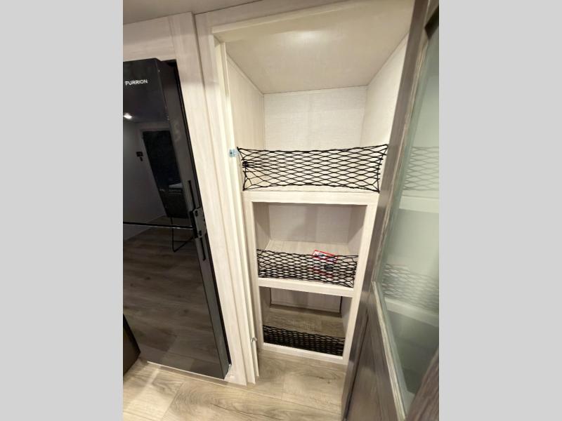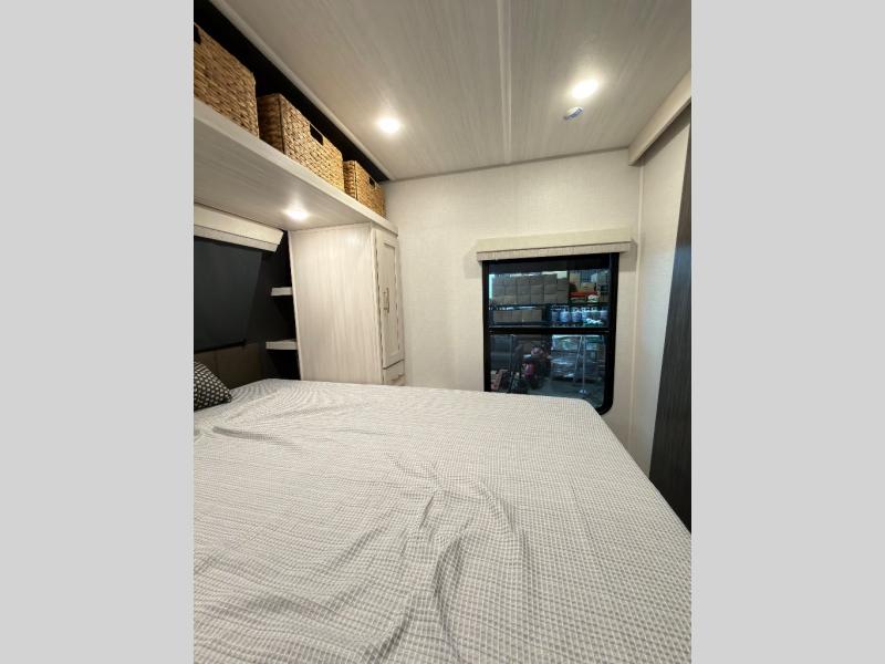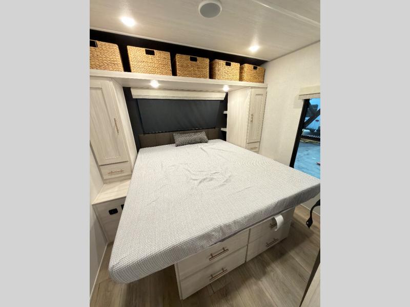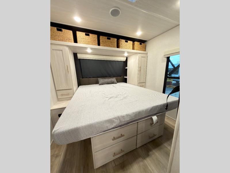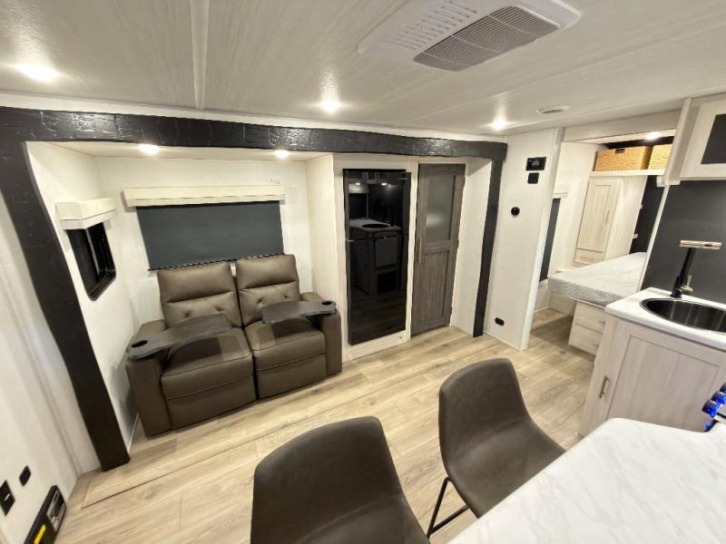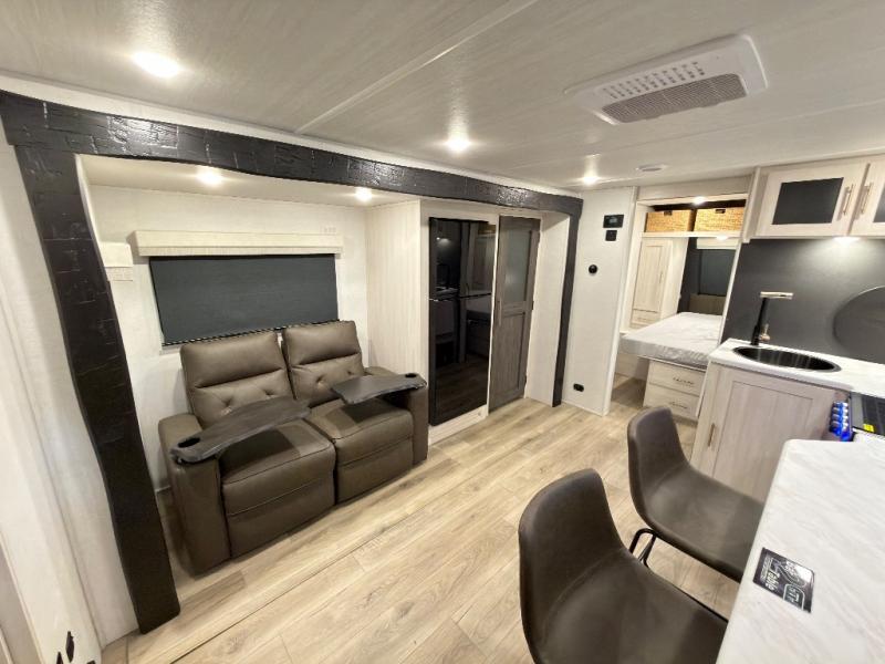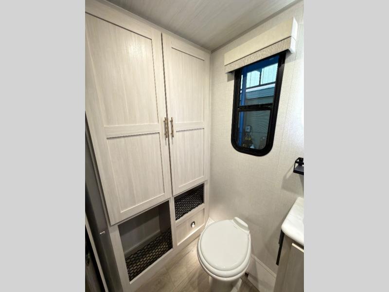 The rear bathroom with a linen closet is for personal care and storage of linens, a front bedroom with a king bed and two wardrobes, creates a serene retreat with ample storage for clothing and personal items, perfect for restful nights. The theater seating provides immersive comfort for relaxation and entertainment, ideal for enjoying movies or unwinding after a day of exploration. Overhead cabinets deliver additional storage for travel essentials and keepsakes. The kitchen area boasts a fridge, a pantry, an air fryer/microwave that combines versatility for quick and healthy meal preparation, a countertop extension, and a flip-up window that enhances ventilation and brings in natural light for a bright kitchen ambiance. You can also enjoy the outdoor living delights by cooking in the incredible outlook kitchen un ther the protection of the power awning.