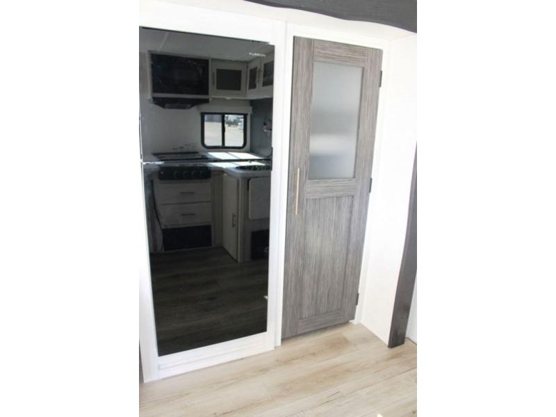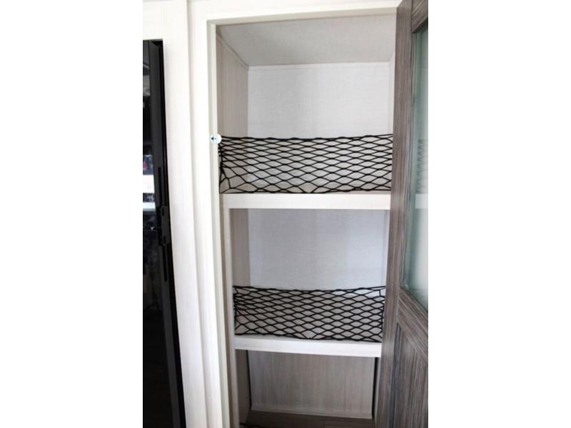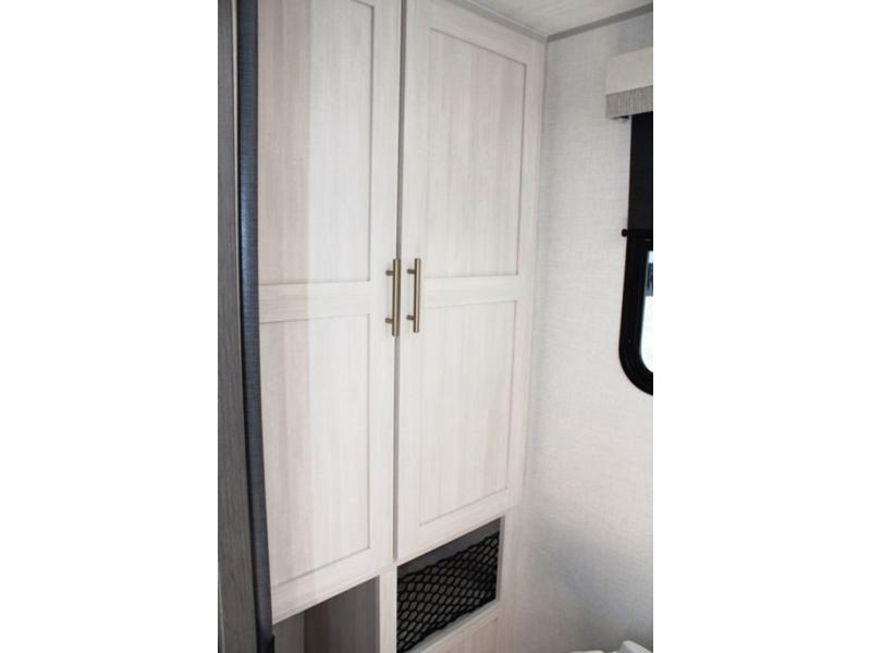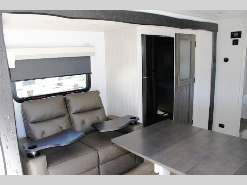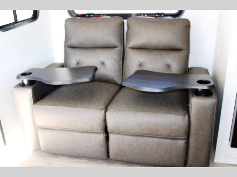 The rear bathroom with a linen closet is for personal care and storage of linens, a front bedroom with a king bed and two wardrobes, creates a serene retreat with ample storage for clothing and personal items, perfect for restful nights. The theater seating provides immersive comfort for relaxation and entertainment, ideal for enjoying movies or unwinding after a day of exploration. Overhead cabinets deliver additional storage for travel essentials and keepsakes. The kitchen area boasts a fridge, a pantry, an air fryer/microwave that combines versatility for quick and healthy meal preparation, a countertop extension, and a flip-up window that enhances ventilation and brings in natural light for a bright kitchen ambiance. You can also enjoy the outdoor living delights by cooking in the incredible outlook kitchen un ther the protection of the power awning.