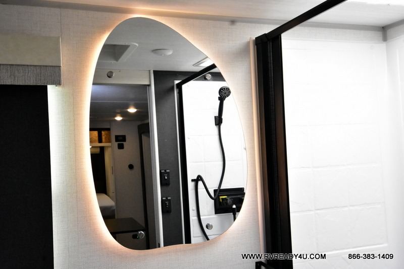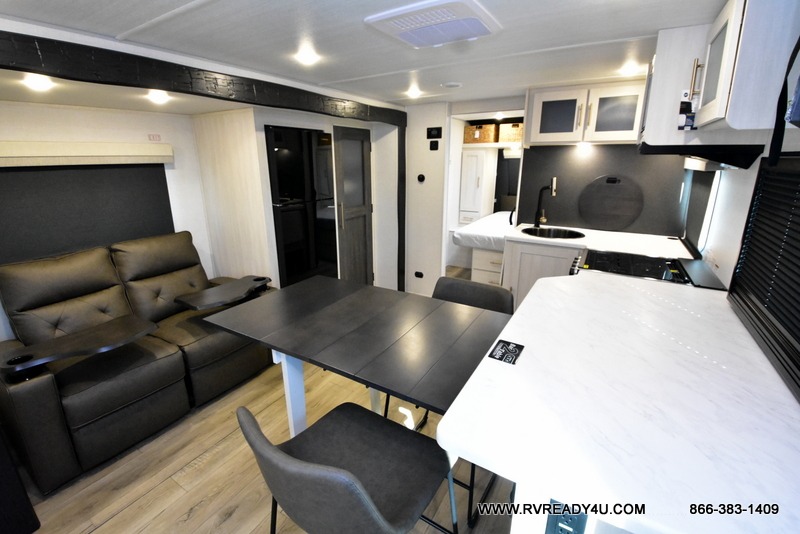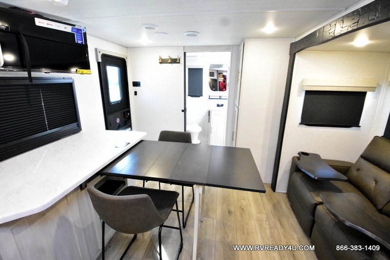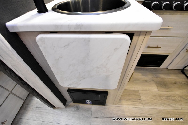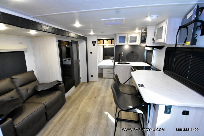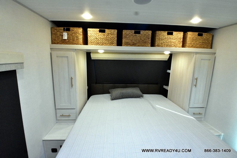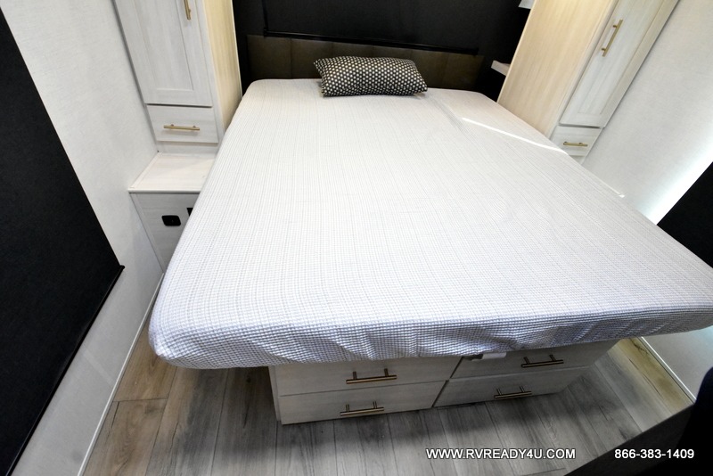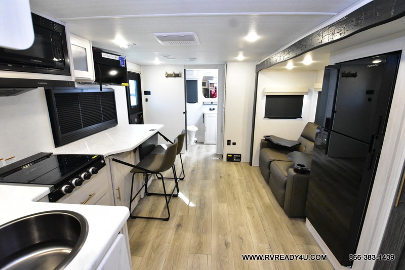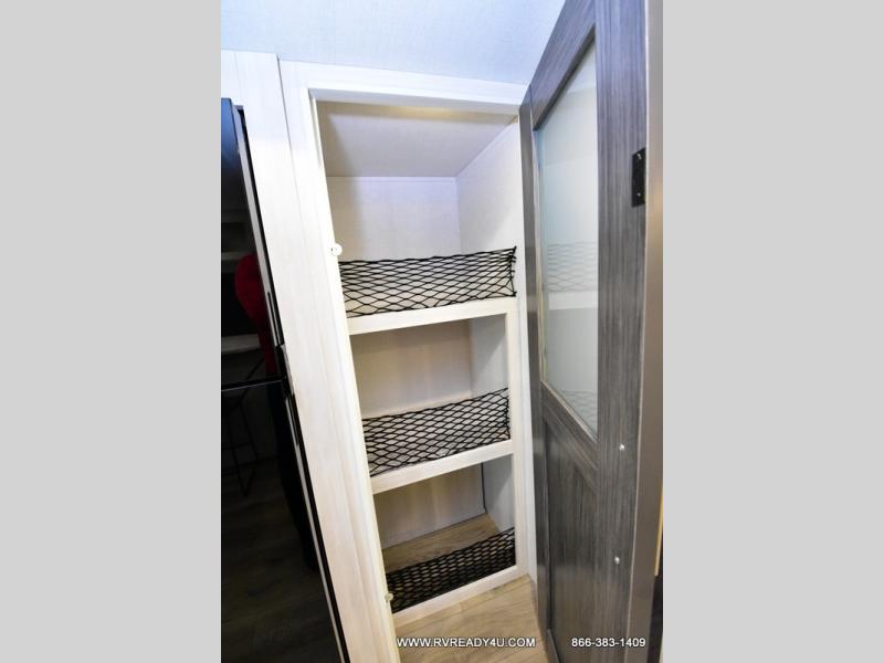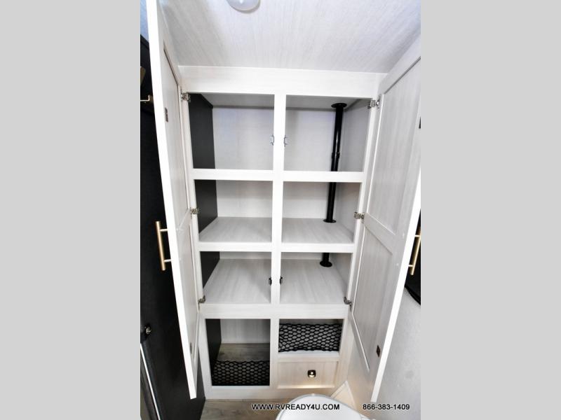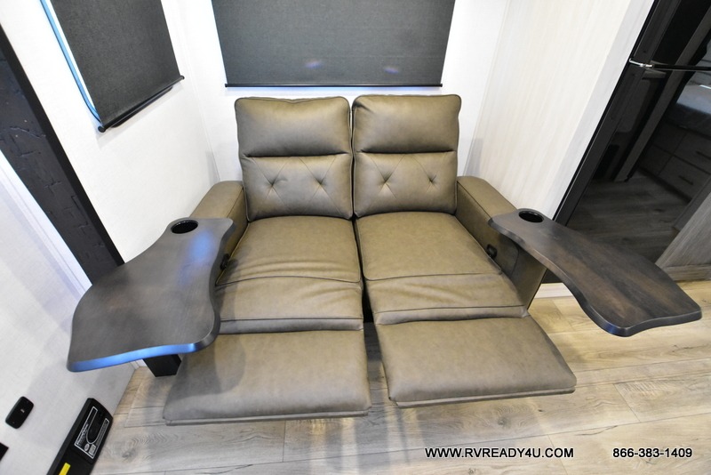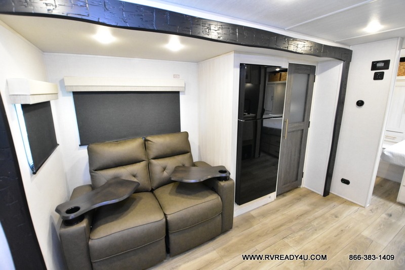 The rear bathroom with a linen closet is for personal care and storage of linens, a front bedroom with a king bed and two wardrobes, creates a serene retreat with ample storage for clothing and personal items, perfect for restful nights. The theater seating provides immersive comfort for relaxation and entertainment, ideal for enjoying movies or unwinding after a day of exploration. Overhead cabinets deliver additional storage for travel essentials and keepsakes. The kitchen area boasts a fridge, a pantry, an air fryer/microwave that combines versatility for quick and healthy meal preparation, a countertop extension, and a flip-up window that enhances ventilation and brings in natural light for a bright kitchen ambiance. You can also enjoy the outdoor living delights by cooking in the incredible outlook kitchen un ther the protection of the power awning.