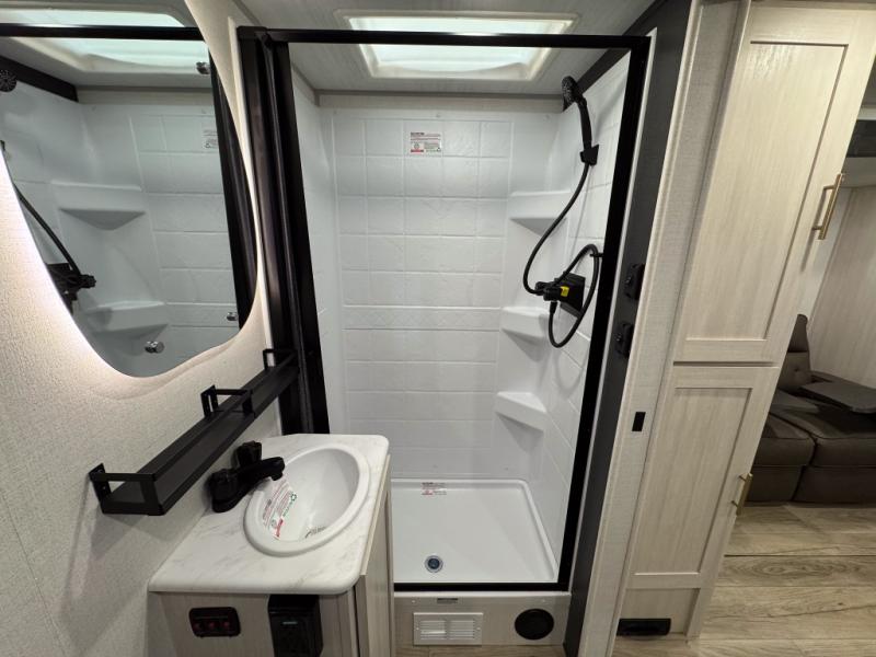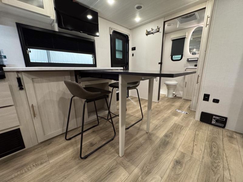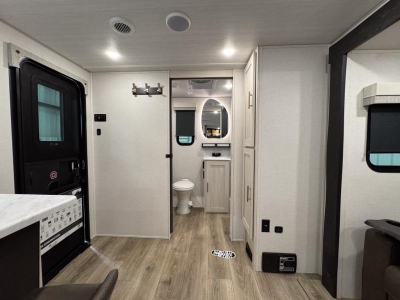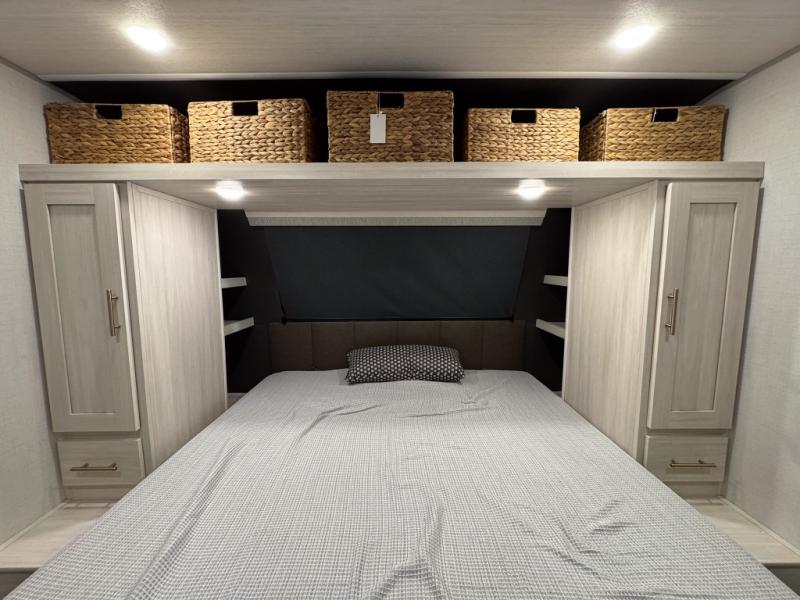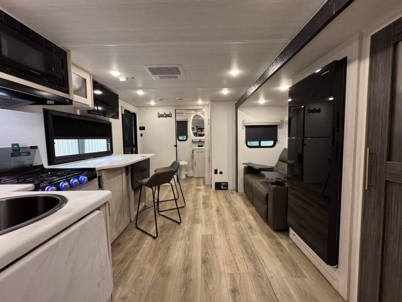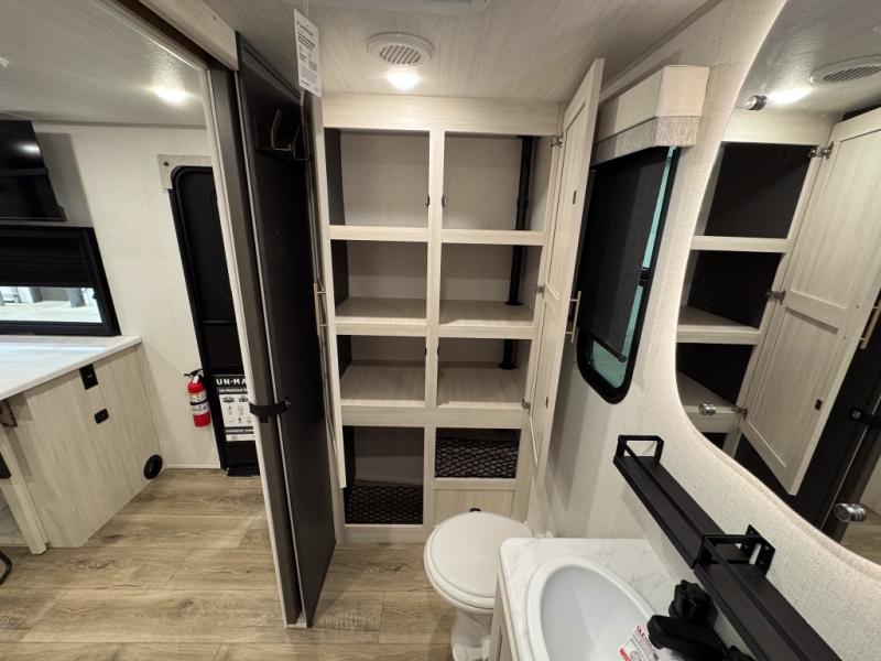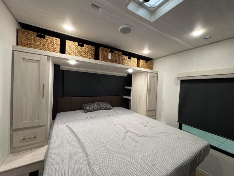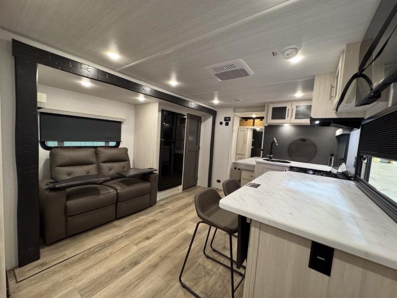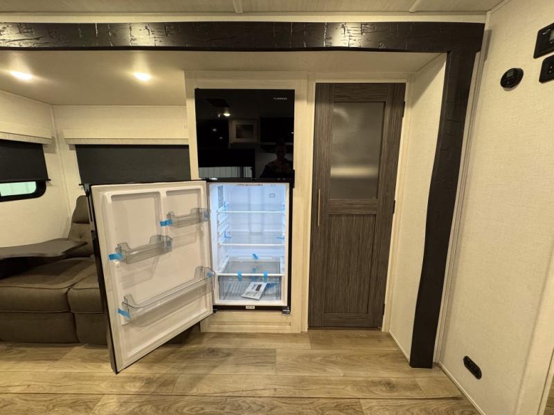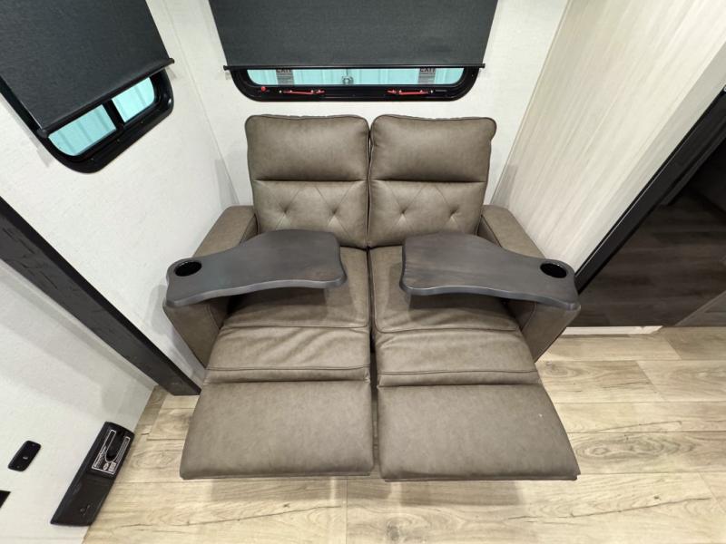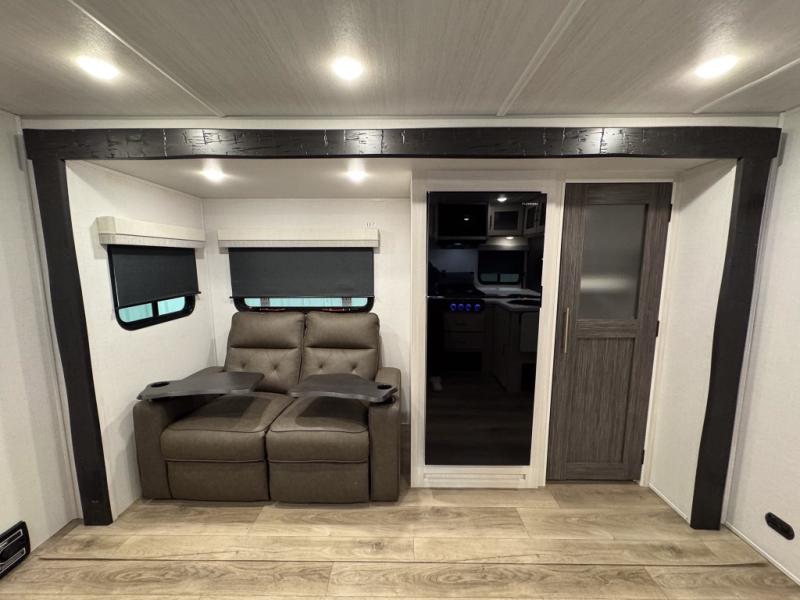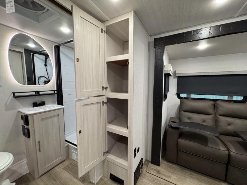 The rear bathroom with a linen closet is for personal care and storage of linens, a front bedroom with a king bed and two wardrobes, creates a serene retreat with ample storage for clothing and personal items, perfect for restful nights. The theater seating provides immersive comfort for relaxation and entertainment, ideal for enjoying movies or unwinding after a day of exploration. Overhead cabinets deliver additional storage for travel essentials and keepsakes. The kitchen area boasts a fridge, a pantry, an air fryer/microwave that combines versatility for quick and healthy meal preparation, a countertop extension, and a flip-up window that enhances ventilation and brings in natural light for a bright kitchen ambiance. You can also enjoy the outdoor living delights by cooking in the incredible outlook kitchen un ther the protection of the power awning.