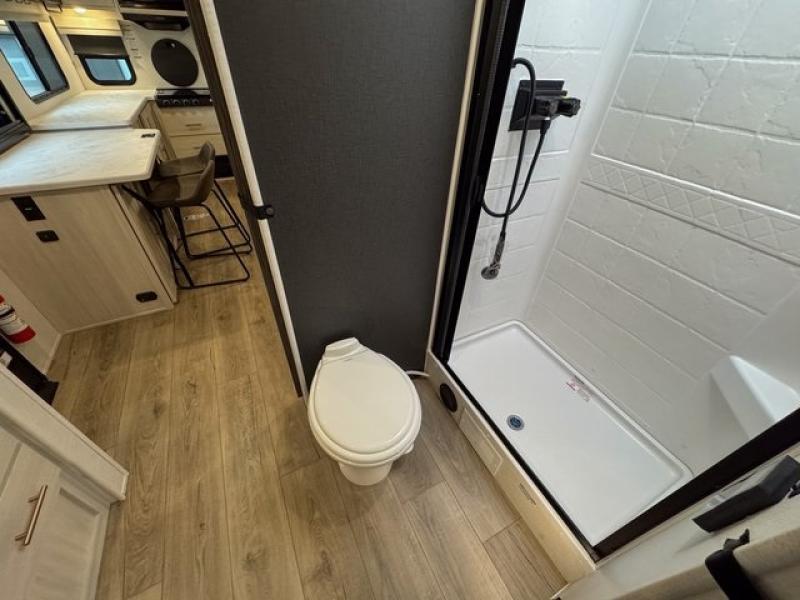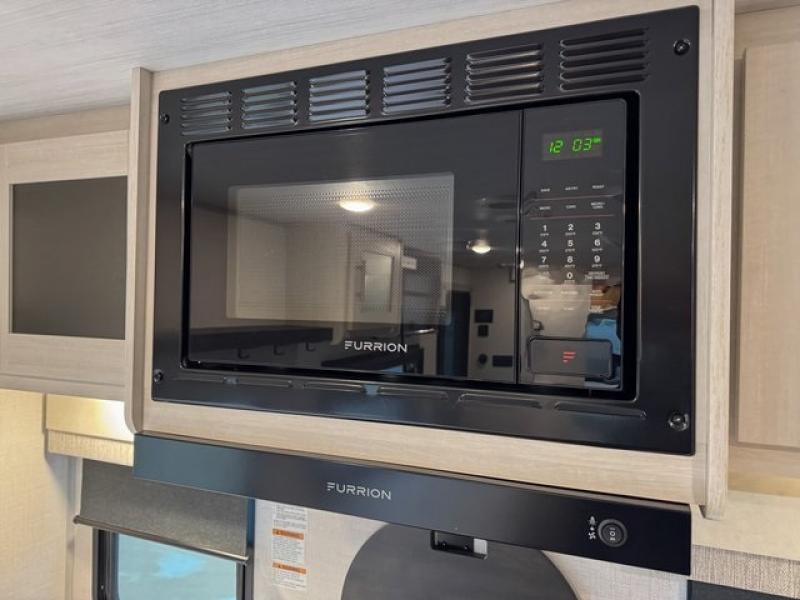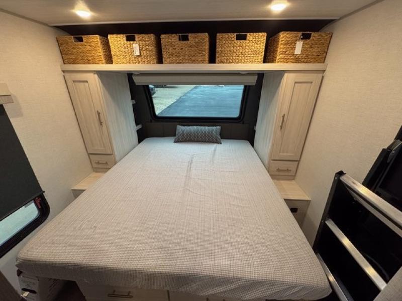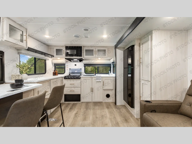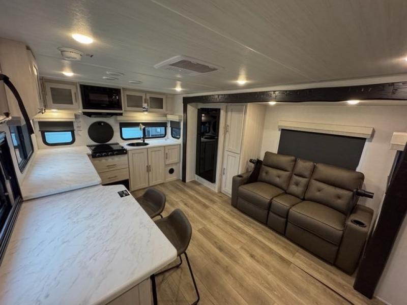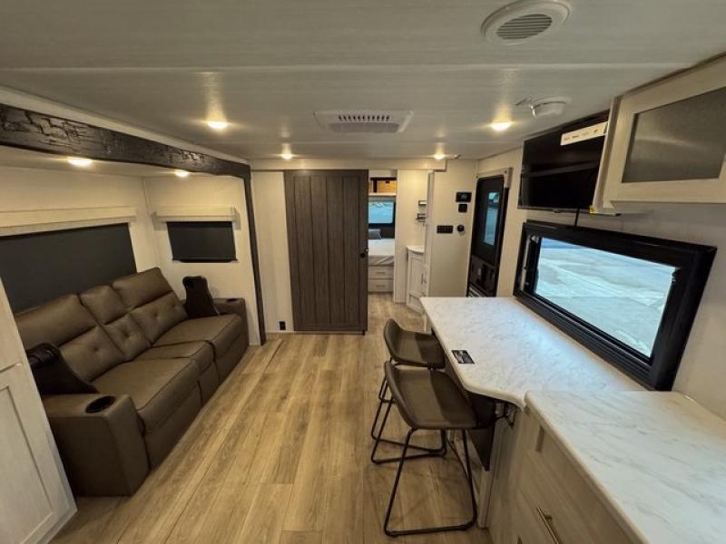 This travel trailer's functional rear kitchen boasts an air fryer/microwave that combines convenience for quick and healthy meal preparation, a shelf, overhead cabinets offering ample storage for culinary supplies and travel items, a fridge, and a pantry that delivers convenient storage for snacks and provisions. Plus, the bar 2 table creates a flexible space for casual dining and socializing, and the flip-up window enhances ventilation and brings in natural light for a bright kitchen ambiance. You can also rest a bit in the theater seating that provides comfortable, cinematic-style seating for relaxation. In the center of this RV, you will find a walk-through bathroom, adding convenience to the unit, and further, you will be mesmerized by the well-appointed front bedroom. Designed for two, this space offers a king-size bed, end tables, and a wardrobe on each side of the bed, featuring ample storage and convenient bedside spaces for comfort and organization.