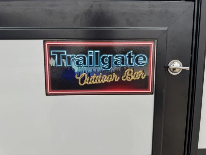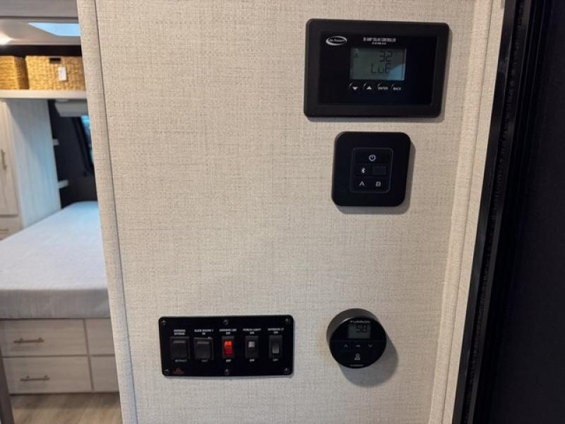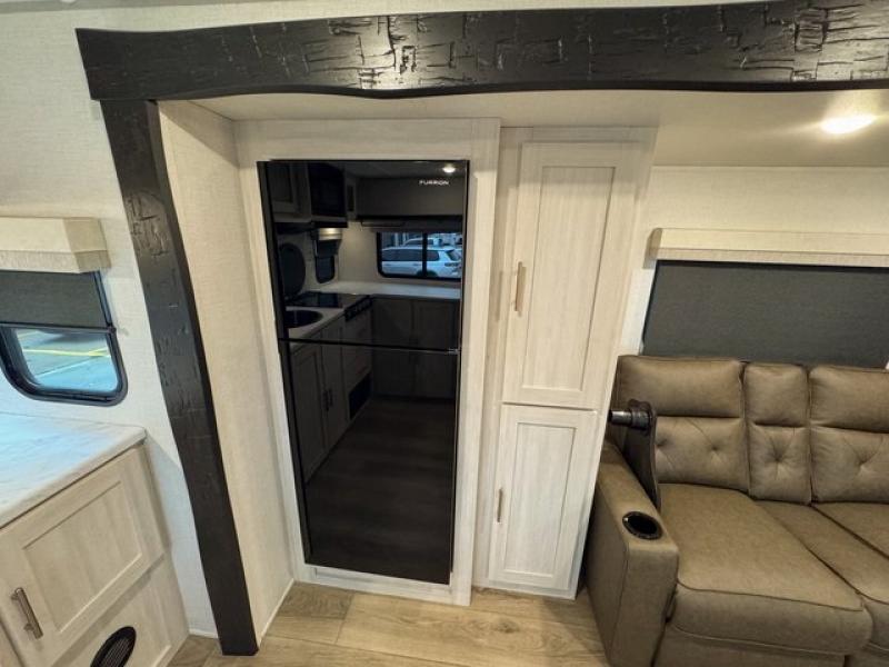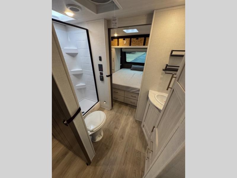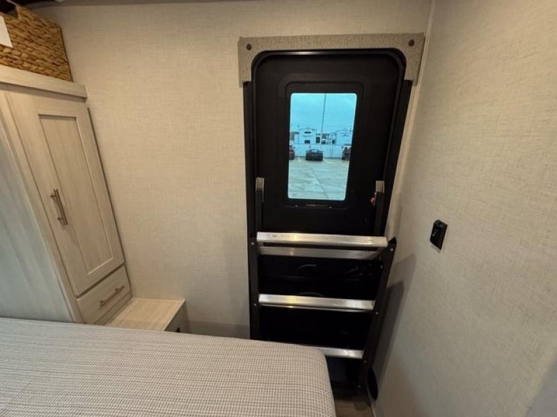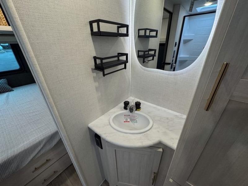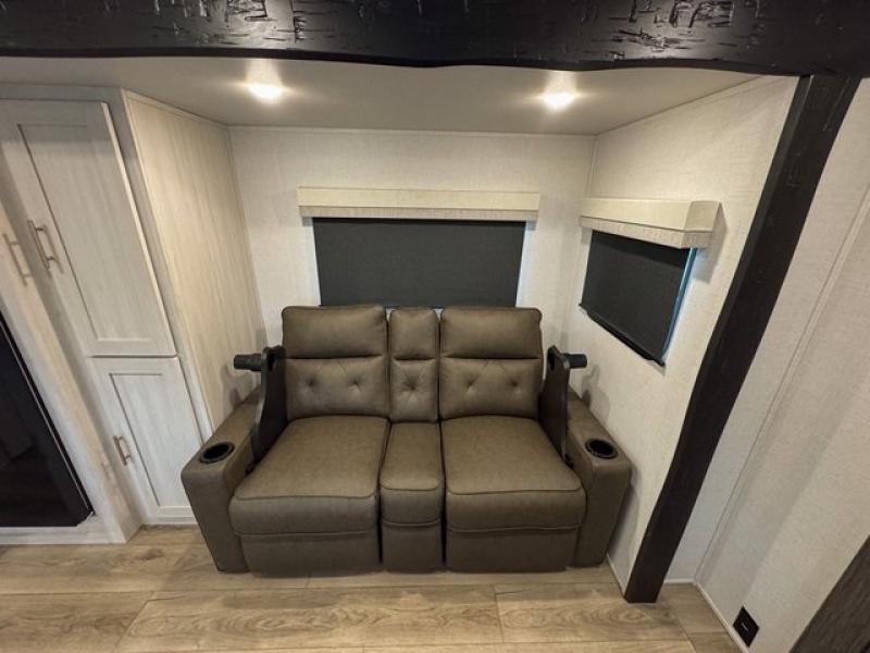 This travel trailer's functional rear kitchen boasts an air fryer/microwave that combines convenience for quick and healthy meal preparation, a shelf, overhead cabinets offering ample storage for culinary supplies and travel items, a fridge, and a pantry that delivers convenient storage for snacks and provisions. Plus, the bar 2 table creates a flexible space for casual dining and socializing, and the flip-up window enhances ventilation and brings in natural light for a bright kitchen ambiance. You can also rest a bit in the theater seating that provides comfortable, cinematic-style seating for relaxation. In the center of this RV, you will find a walk-through bathroom, adding convenience to the unit, and further, you will be mesmerized by the well-appointed front bedroom. Designed for two, this space offers a king-size bed, end tables, and a wardrobe on each side of the bed, featuring ample storage and convenient bedside spaces for comfort and organization.