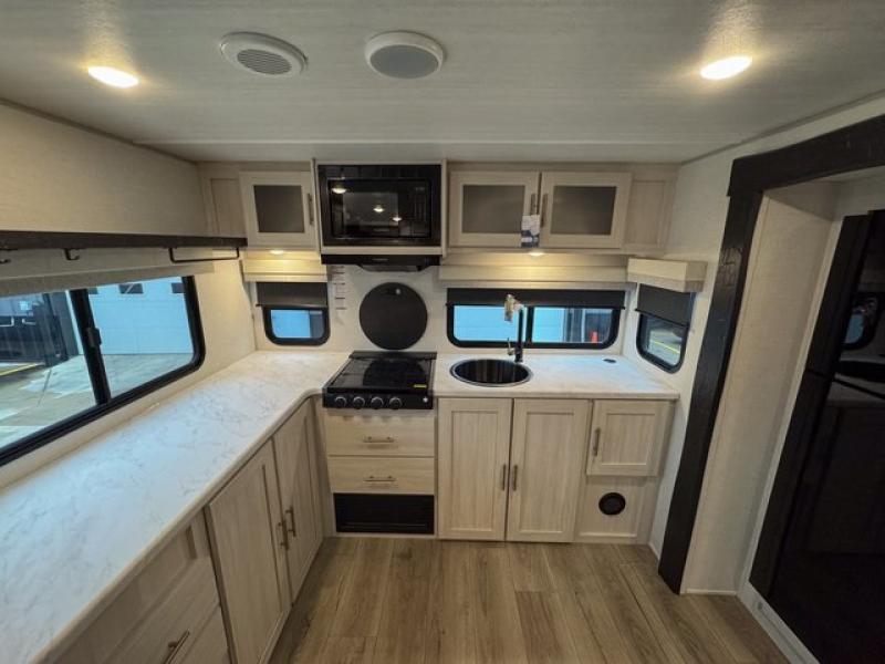 The Forest River Un-Mapped travel trailers deliver an unparalleled travel experience thanks to their incredible features, starting with the aluminum-framed floor with block foam insulation that ensures exceptional structural integrity and thermal efficiency, along with the sealed underbelly with forced heat & radiant foil barrier that provides superior insulation and heat management, and the power tongue jack facilitates easy maneuvering and stabilization of the trailer. Plus, the 30 Amp charge controller with solar inverter prep is ready for integration with solar power systems, catering to eco-conscious travelers seeking off-grid capabilities. Inside, you will find seamless Surf-X kitchen countertops that offer a sleek, durable surface and are easy to maintain for busy travelers. Further, the blackout roller shades will add privacy and light control for restful nights and cozy daytime retreats.