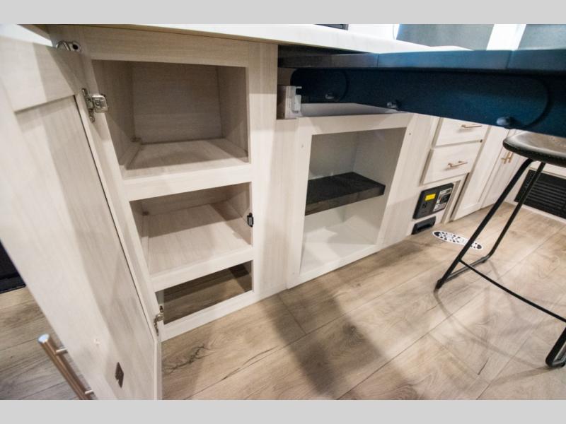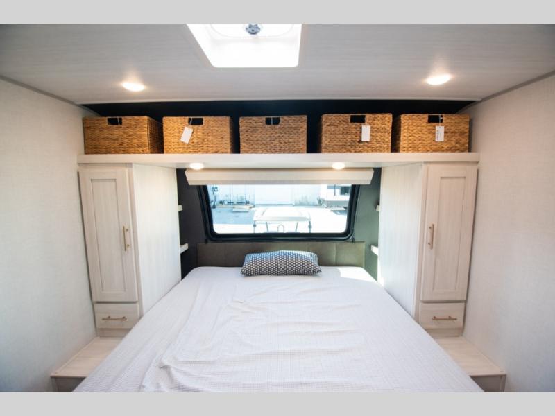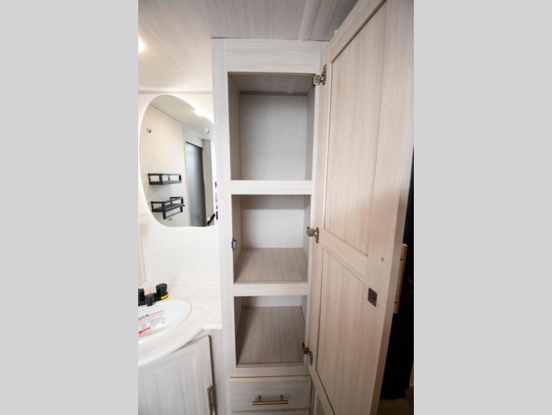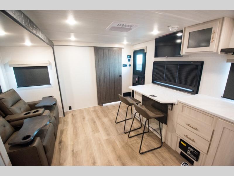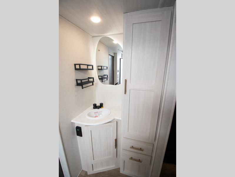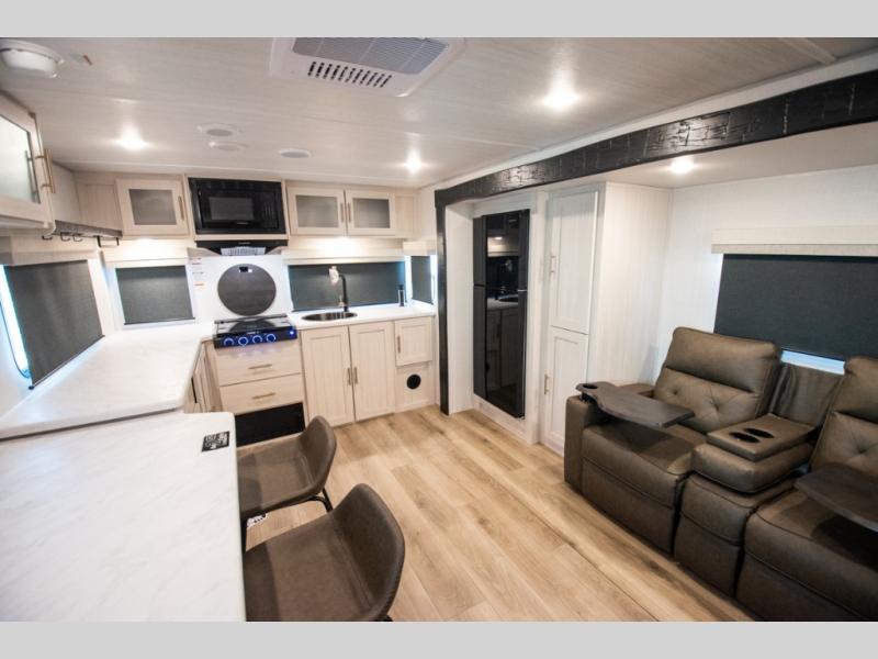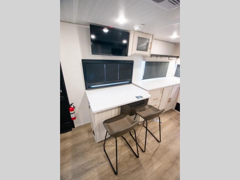 This travel trailer's functional rear kitchen boasts an air fryer/microwave that combines convenience for quick and healthy meal preparation, a shelf, overhead cabinets offering ample storage for culinary supplies and travel items, a fridge, and a pantry that delivers convenient storage for snacks and provisions. Plus, the bar 2 table creates a flexible space for casual dining and socializing, and the flip-up window enhances ventilation and brings in natural light for a bright kitchen ambiance. You can also rest a bit in the theater seating that provides comfortable, cinematic-style seating for relaxation. In the center of this RV, you will find a walk-through bathroom, adding convenience to the unit, and further, you will be mesmerized by the well-appointed front bedroom. Designed for two, this space offers a king-size bed, end tables, and a wardrobe on each side of the bed, featuring ample storage and convenient bedside spaces for comfort and organization.