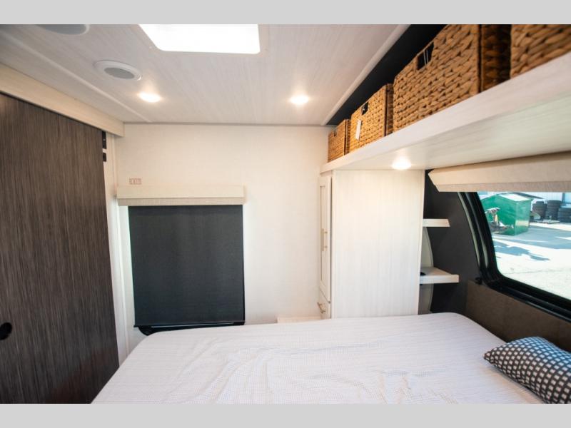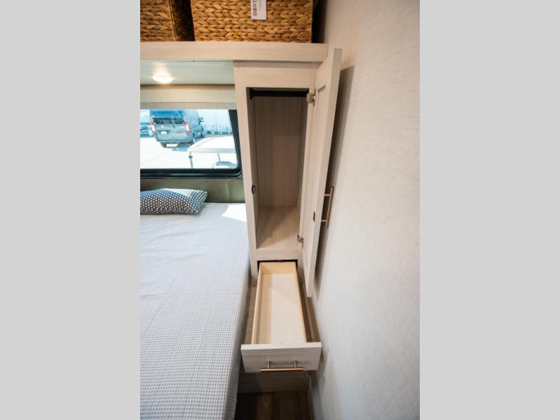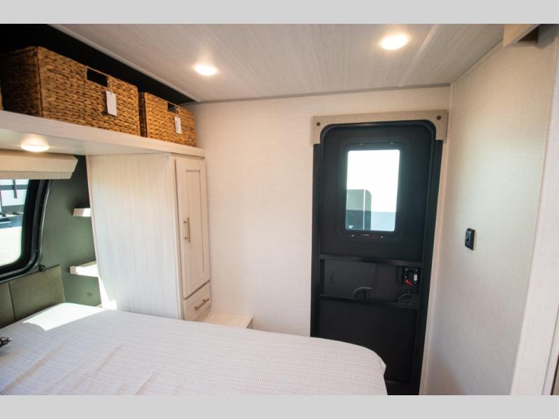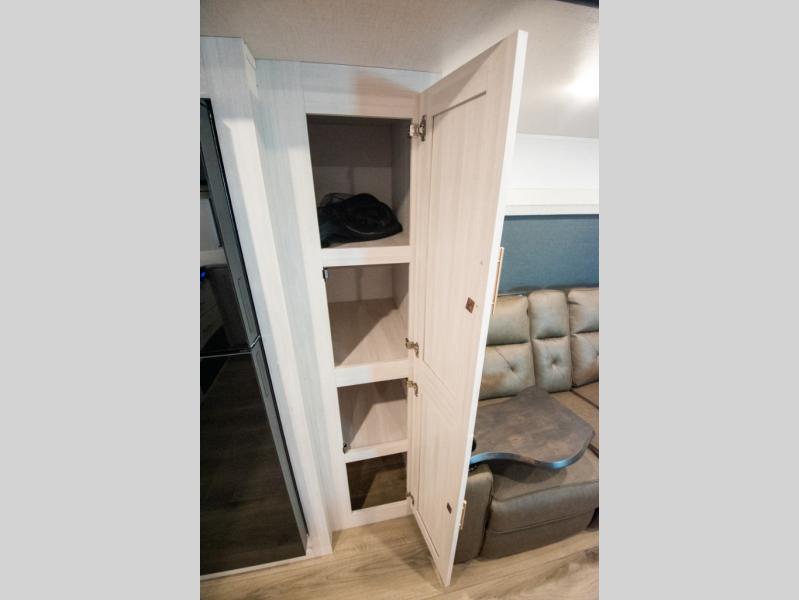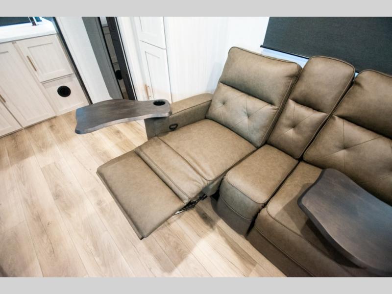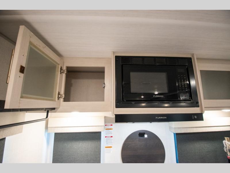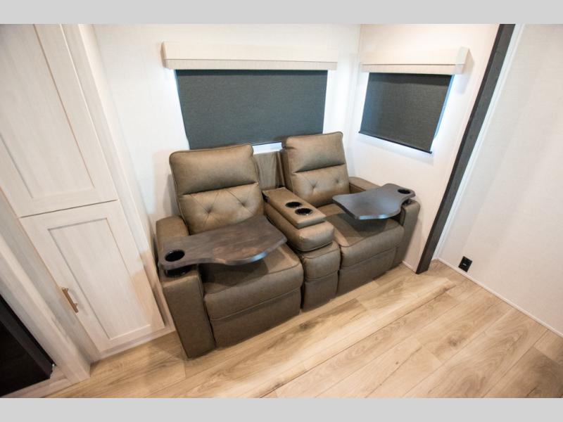 This travel trailer's functional rear kitchen boasts an air fryer/microwave that combines convenience for quick and healthy meal preparation, a shelf, overhead cabinets offering ample storage for culinary supplies and travel items, a fridge, and a pantry that delivers convenient storage for snacks and provisions. Plus, the bar 2 table creates a flexible space for casual dining and socializing, and the flip-up window enhances ventilation and brings in natural light for a bright kitchen ambiance. You can also rest a bit in the theater seating that provides comfortable, cinematic-style seating for relaxation. In the center of this RV, you will find a walk-through bathroom, adding convenience to the unit, and further, you will be mesmerized by the well-appointed front bedroom. Designed for two, this space offers a king-size bed, end tables, and a wardrobe on each side of the bed, featuring ample storage and convenient bedside spaces for comfort and organization.