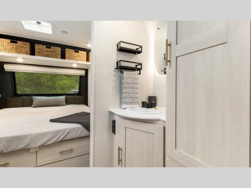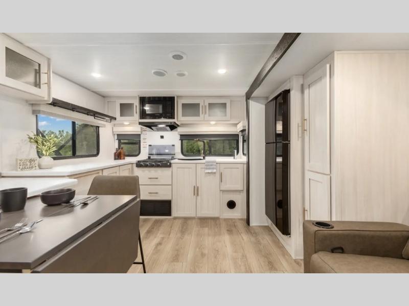 This travel trailer's functional rear kitchen boasts an air fryer/microwave that combines convenience for quick and healthy meal preparation, a shelf, overhead cabinets offering ample storage for culinary supplies and travel items, a fridge, and a pantry that delivers convenient storage for snacks and provisions. Plus, the bar 2 table creates a flexible space for casual dining and socializing, and the flip-up window enhances ventilation and brings in natural light for a bright kitchen ambiance. You can also rest a bit in the theater seating that provides comfortable, cinematic-style seating for relaxation. In the center of this RV, you will find a walk-through bathroom, adding convenience to the unit, and further, you will be mesmerized by the well-appointed front bedroom. Designed for two, this space offers a king-size bed, end tables, and a wardrobe on each side of the bed, featuring ample storage and convenient bedside spaces for comfort and organization.