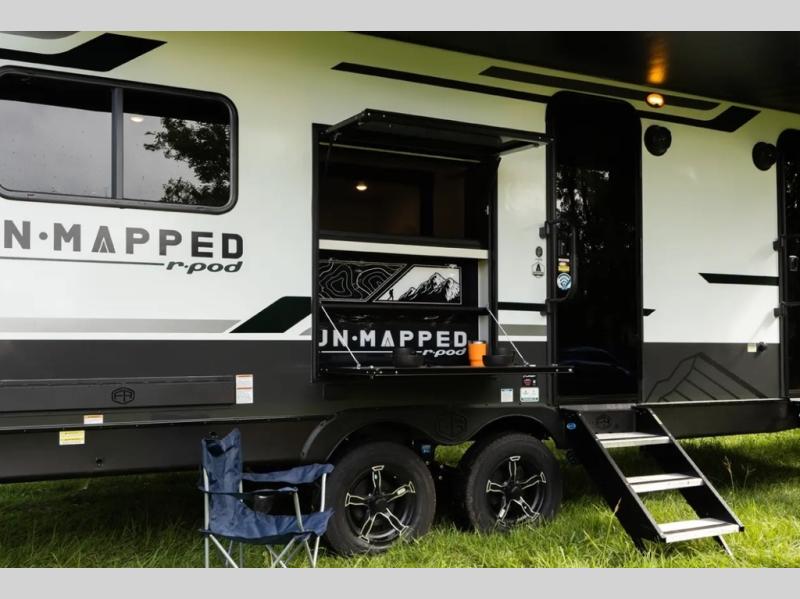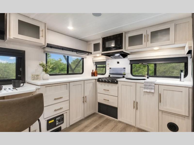 The Forest River Un-Mapped travel trailers deliver an unparalleled travel experience thanks to their incredible features, starting with the aluminum-framed floor with block foam insulation that ensures exceptional structural integrity and thermal efficiency, along with the sealed underbelly with forced heat & radiant foil barrier that provides superior insulation and heat management, and the power tongue jack facilitates easy maneuvering and stabilization of the trailer. Plus, the 30 Amp charge controller with solar inverter prep is ready for integration with solar power systems, catering to eco-conscious travelers seeking off-grid capabilities. Inside, you will find seamless Surf-X kitchen countertops that offer a sleek, durable surface and are easy to maintain for busy travelers. Further, the blackout roller shades will add privacy and light control for restful nights and cozy daytime retreats.