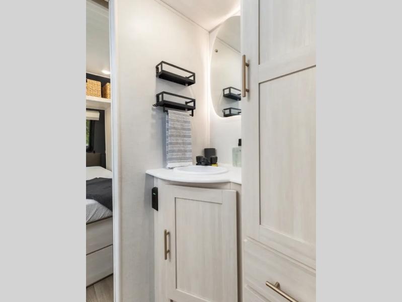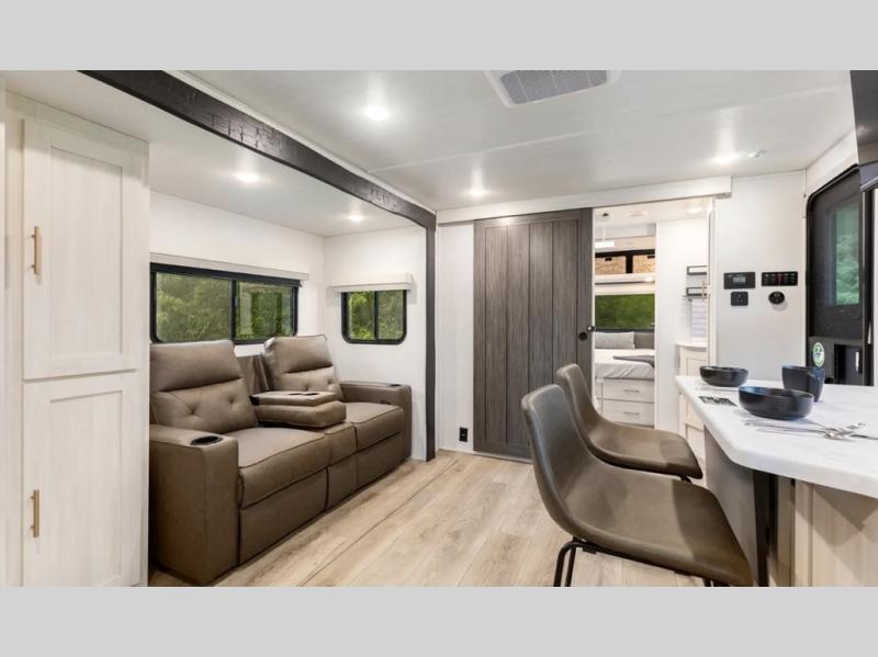 This travel trailer's functional rear kitchen boasts an air fryer/microwave that combines convenience for quick and healthy meal preparation, a shelf, overhead cabinets offering ample storage for culinary supplies and travel items, a fridge, and a pantry that delivers convenient storage for snacks and provisions. Plus, the bar 2 table creates a flexible space for casual dining and socializing, and the flip-up window enhances ventilation and brings in natural light for a bright kitchen ambiance. You can also rest a bit in the theater seating that provides comfortable, cinematic-style seating for relaxation. In the center of this RV, you will find a walk-through bathroom, adding convenience to the unit, and further, you will be mesmerized by the well-appointed front bedroom. Designed for two, this space offers a king-size bed, end tables, and a wardrobe on each side of the bed, featuring ample storage and convenient bedside spaces for comfort and organization.