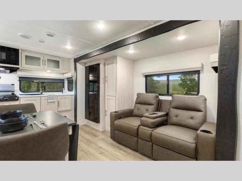 This travel trailer's functional rear kitchen boasts an air fryer/microwave that combines convenience for quick and healthy meal preparation, a shelf, overhead cabinets offering ample storage for culinary supplies and travel items, a fridge, and a pantry that delivers convenient storage for snacks and provisions. Plus, the bar 2 table creates a flexible space for casual dining and socializing, and the flip-up window enhances ventilation and brings in natural light for a bright kitchen ambiance. You can also rest a bit in the theater seating that provides comfortable, cinematic-style seating for relaxation. In the center of this RV, you will find a walk-through bathroom, adding convenience to the unit, and further, you will be mesmerized by the well-appointed front bedroom. Designed for two, this space offers a king-size bed, end tables, and a wardrobe on each side of the bed, featuring ample storage and convenient bedside spaces for comfort and organization.