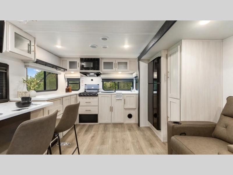 This travel trailer's functional rear kitchen boasts an air fryer/microwave that combines convenience for quick and healthy meal preparation, a shelf, overhead cabinets offering ample storage for culinary supplies and travel items, a fridge, and a pantry that delivers convenient storage for snacks and provisions. Plus, the bar 2 table creates a flexible space for casual dining and socializing, and the flip-up window enhances ventilation and brings in natural light for a bright kitchen ambiance. You can also rest a bit in the theater seating that provides comfortable, cinematic-style seating for relaxation. In the center of this RV, you will find a walk-through bathroom, adding convenience to the unit, and further, you will be mesmerized by the well-appointed front bedroom. Designed for two, this space offers a king-size bed, end tables, and a wardrobe on each side of the bed, featuring ample storage and convenient bedside spaces for comfort and organization.