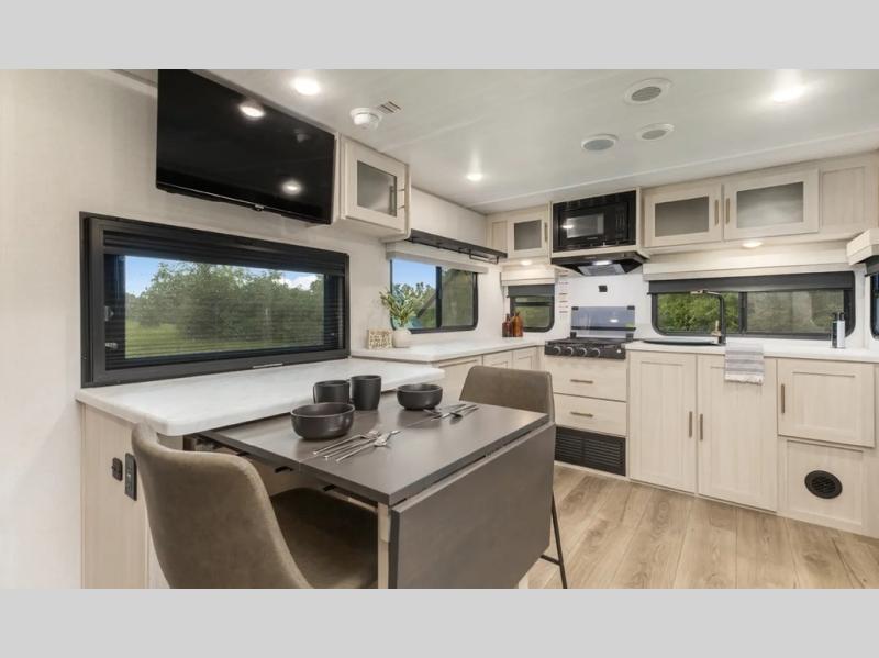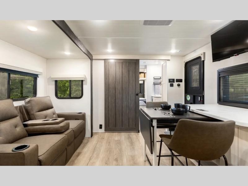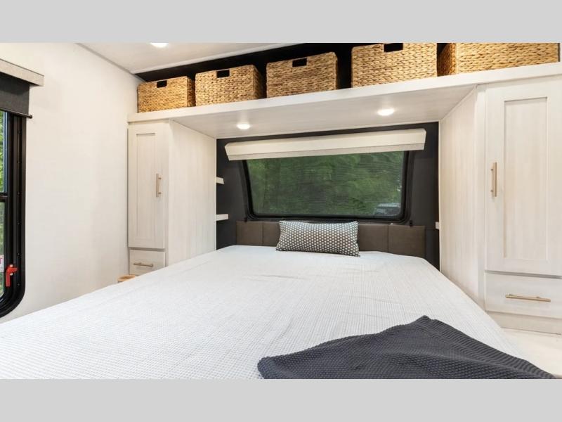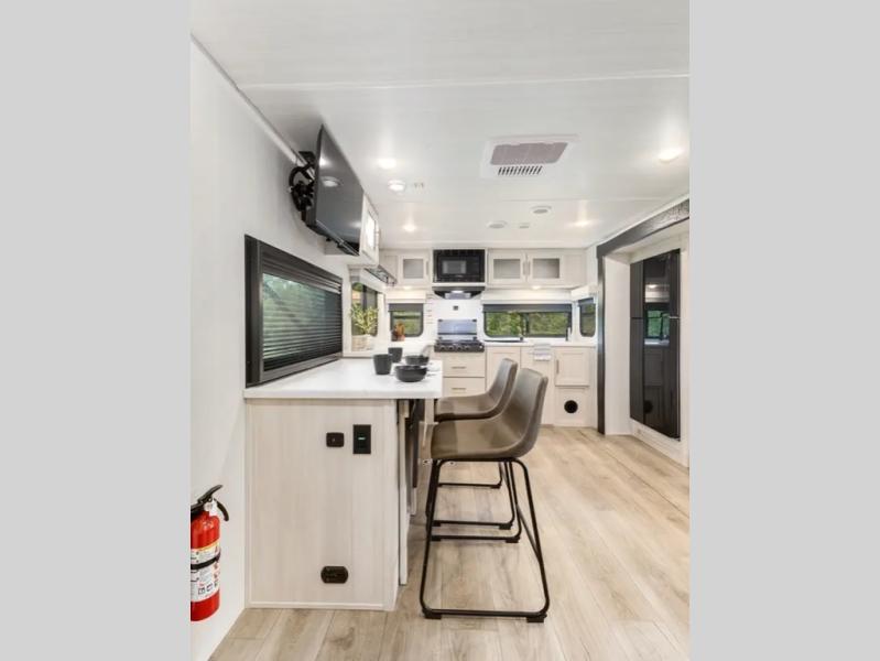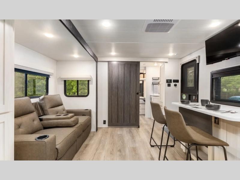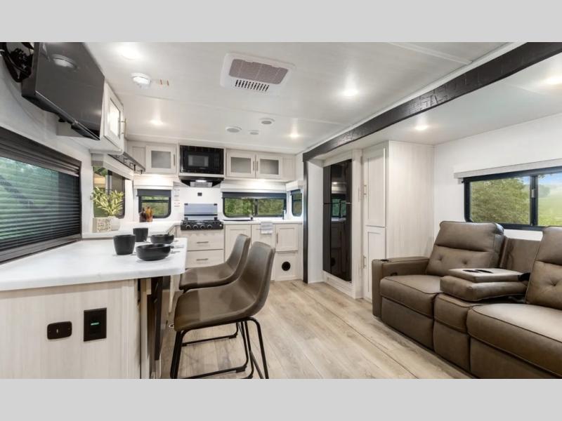 This travel trailer's functional rear kitchen boasts an air fryer/microwave that combines convenience for quick and healthy meal preparation, a shelf, overhead cabinets offering ample storage for culinary supplies and travel items, a fridge, and a pantry that delivers convenient storage for snacks and provisions. Plus, the bar 2 table creates a flexible space for casual dining and socializing, and the flip-up window enhances ventilation and brings in natural light for a bright kitchen ambiance. You can also rest a bit in the theater seating that provides comfortable, cinematic-style seating for relaxation. In the center of this RV, you will find a walk-through bathroom, adding convenience to the unit, and further, you will be mesmerized by the well-appointed front bedroom. Designed for two, this space offers a king-size bed, end tables, and a wardrobe on each side of the bed, featuring ample storage and convenient bedside spaces for comfort and organization.