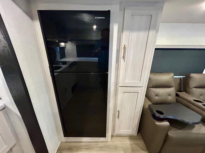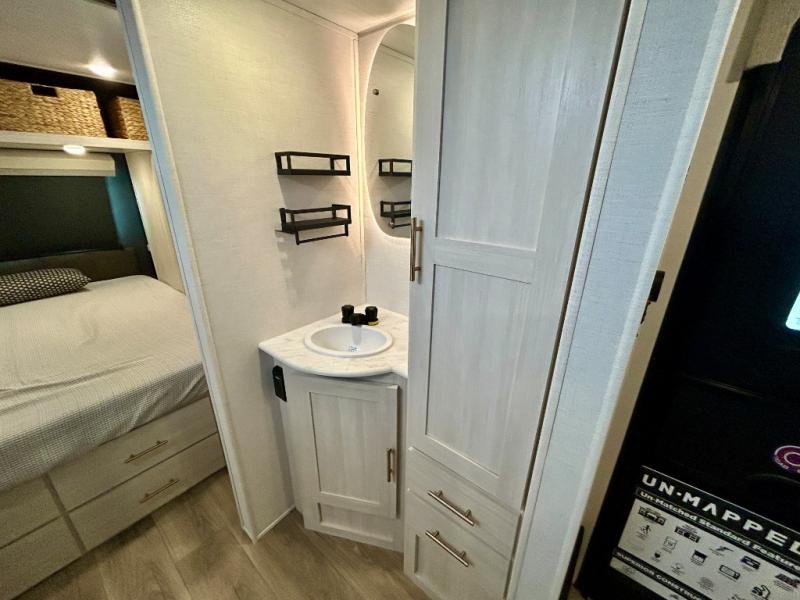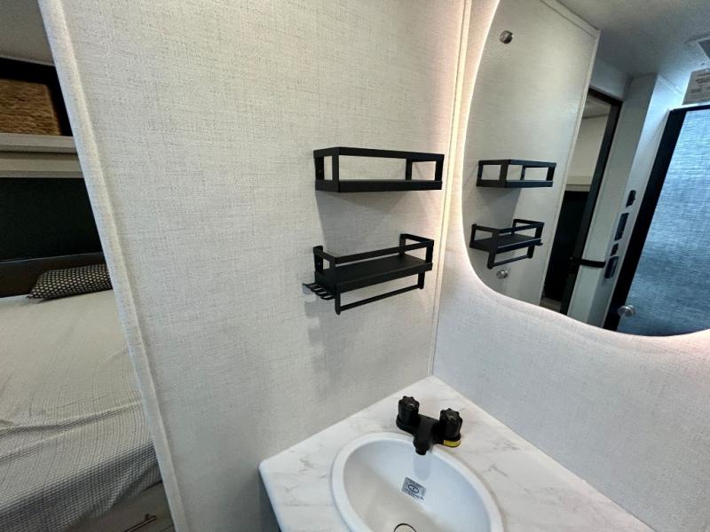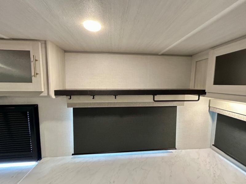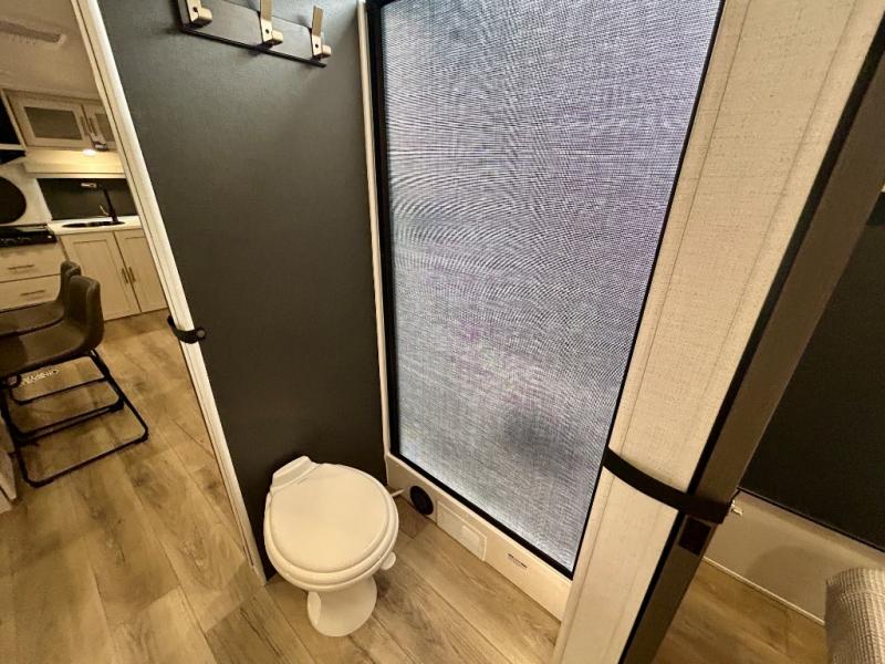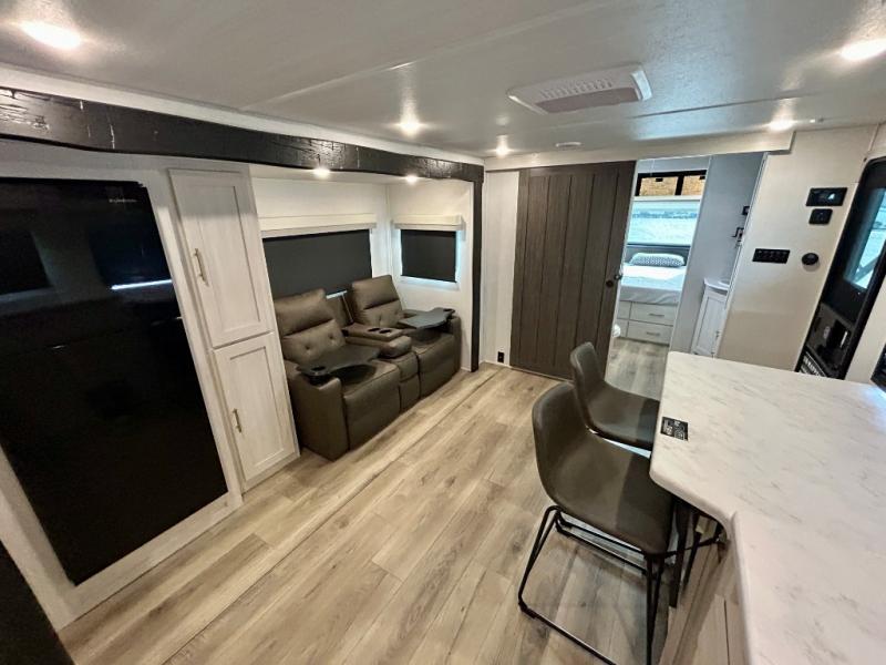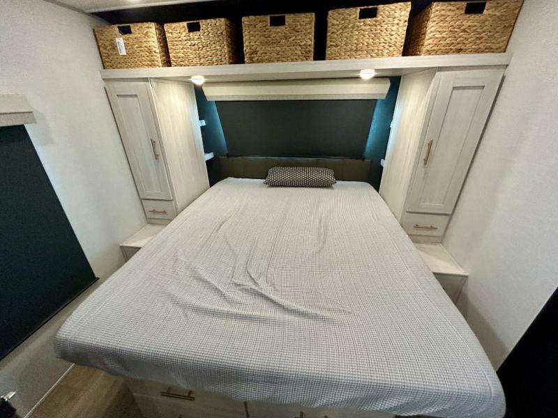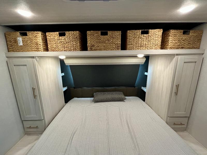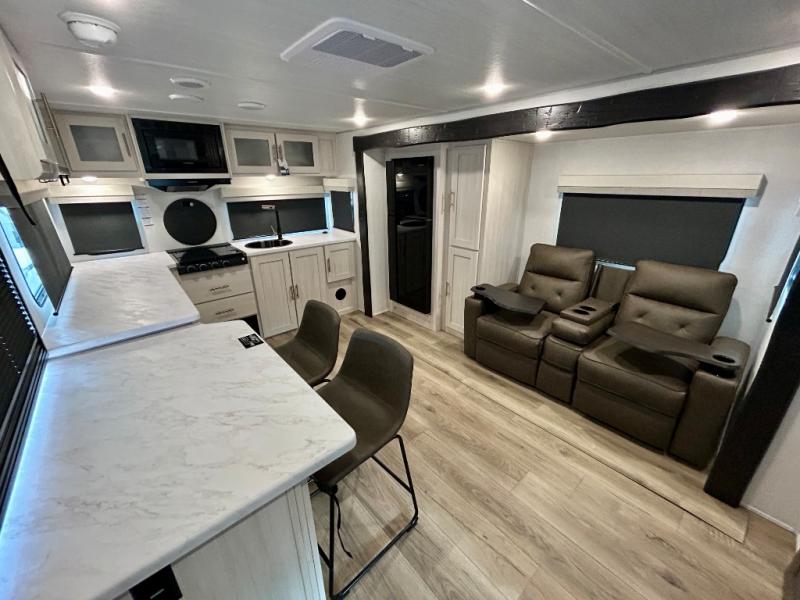 This travel trailer's functional rear kitchen boasts an air fryer/microwave that combines convenience for quick and healthy meal preparation, a shelf, overhead cabinets offering ample storage for culinary supplies and travel items, a fridge, and a pantry that delivers convenient storage for snacks and provisions. Plus, the bar 2 table creates a flexible space for casual dining and socializing, and the flip-up window enhances ventilation and brings in natural light for a bright kitchen ambiance. You can also rest a bit in the theater seating that provides comfortable, cinematic-style seating for relaxation. In the center of this RV, you will find a walk-through bathroom, adding convenience to the unit, and further, you will be mesmerized by the well-appointed front bedroom. Designed for two, this space offers a king-size bed, end tables, and a wardrobe on each side of the bed, featuring ample storage and convenient bedside spaces for comfort and organization.