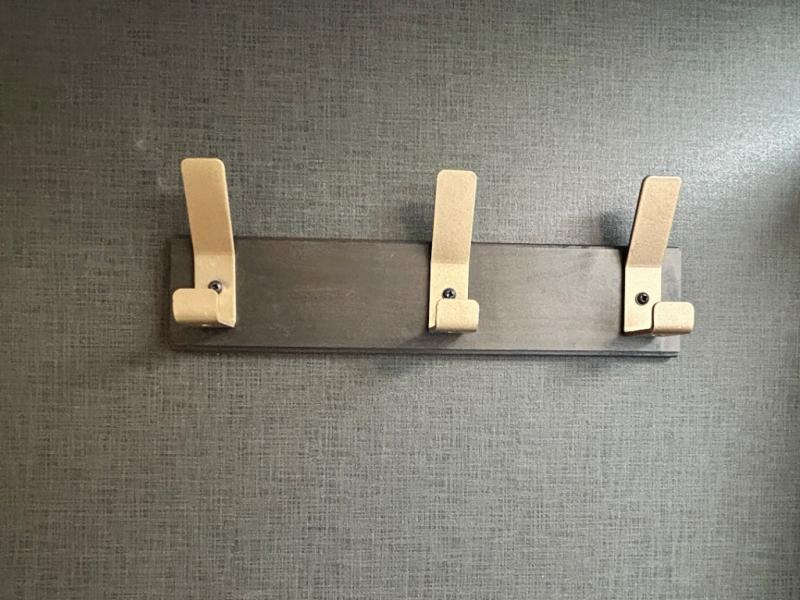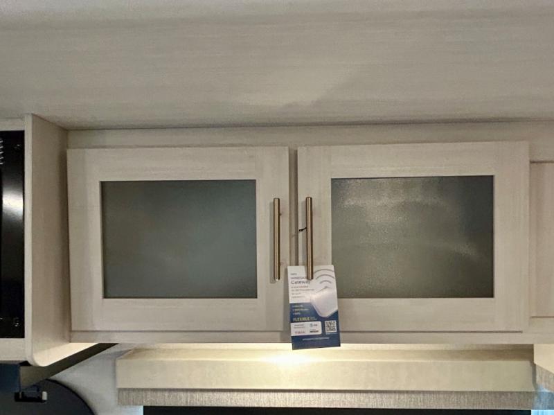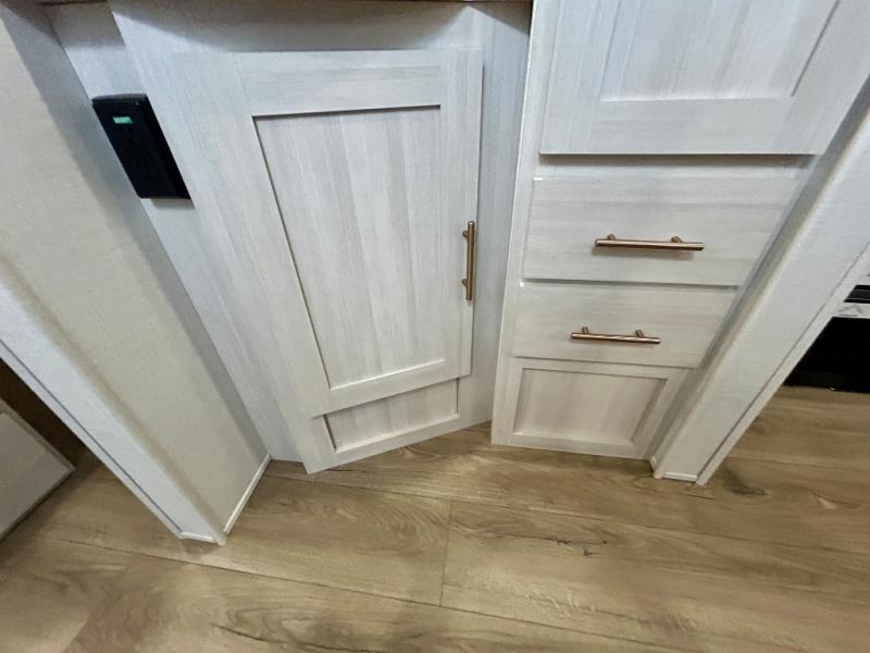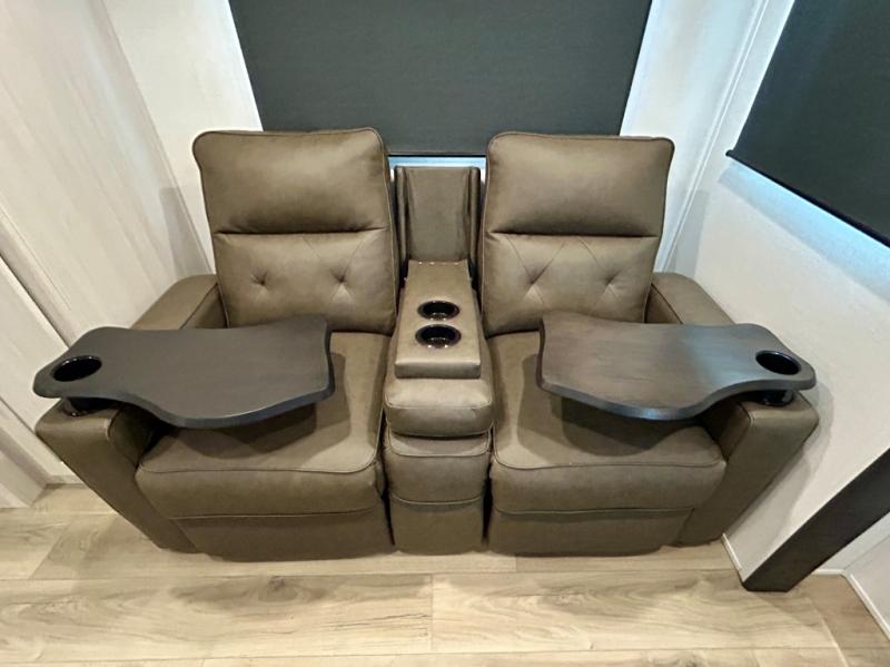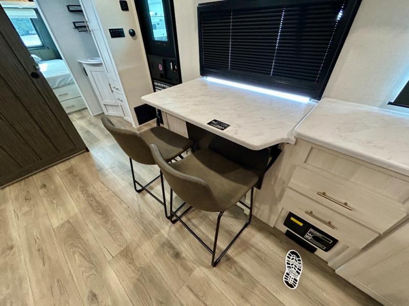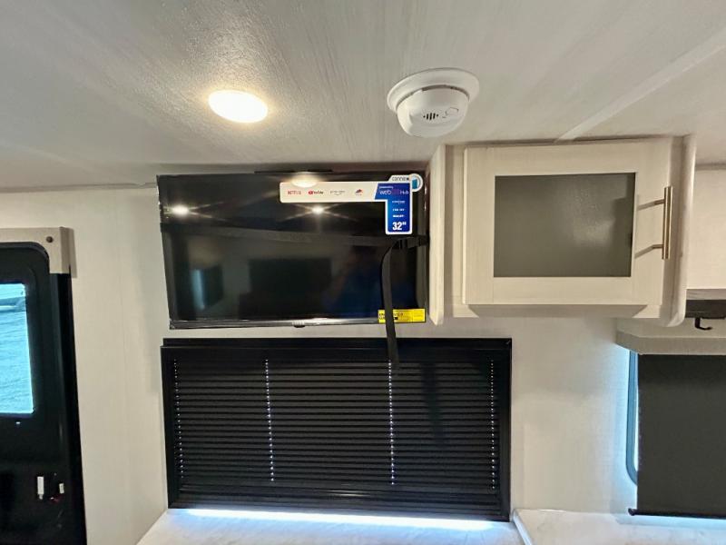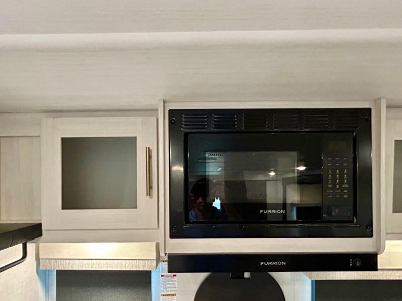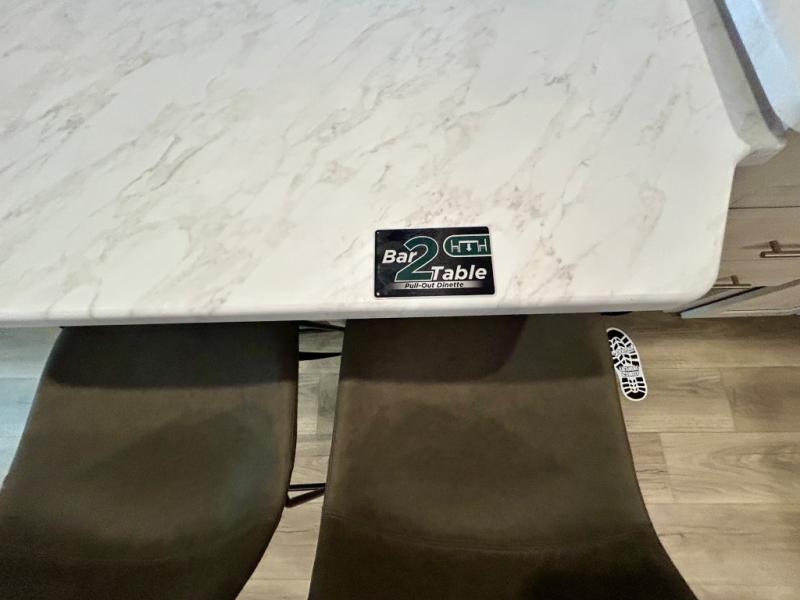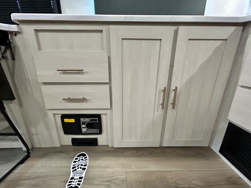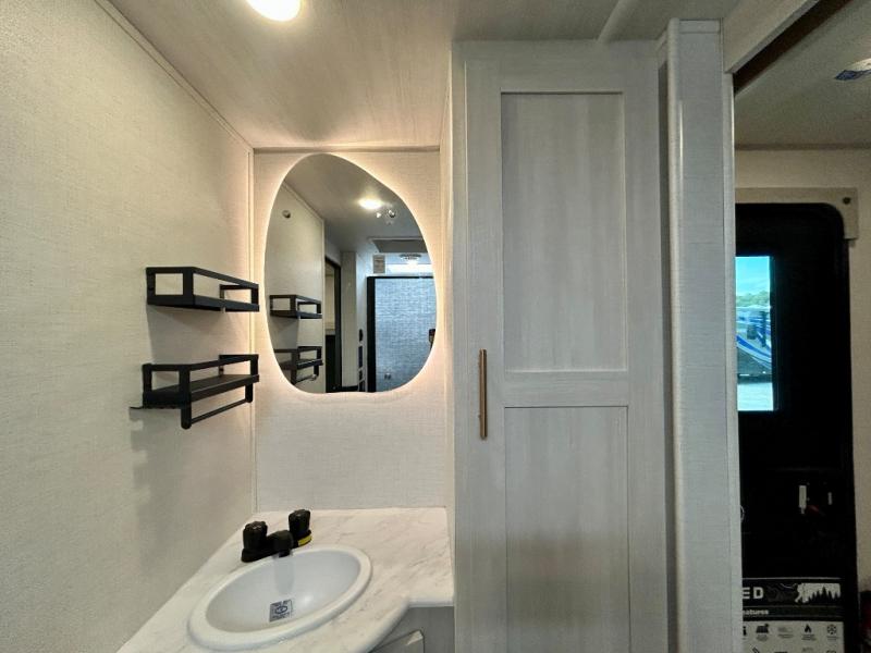 This travel trailer's functional rear kitchen boasts an air fryer/microwave that combines convenience for quick and healthy meal preparation, a shelf, overhead cabinets offering ample storage for culinary supplies and travel items, a fridge, and a pantry that delivers convenient storage for snacks and provisions. Plus, the bar 2 table creates a flexible space for casual dining and socializing, and the flip-up window enhances ventilation and brings in natural light for a bright kitchen ambiance. You can also rest a bit in the theater seating that provides comfortable, cinematic-style seating for relaxation. In the center of this RV, you will find a walk-through bathroom, adding convenience to the unit, and further, you will be mesmerized by the well-appointed front bedroom. Designed for two, this space offers a king-size bed, end tables, and a wardrobe on each side of the bed, featuring ample storage and convenient bedside spaces for comfort and organization.