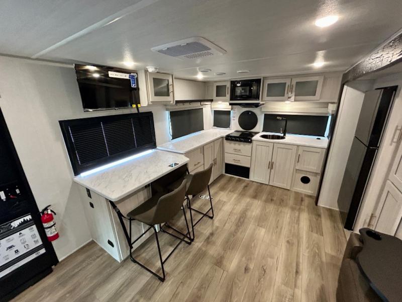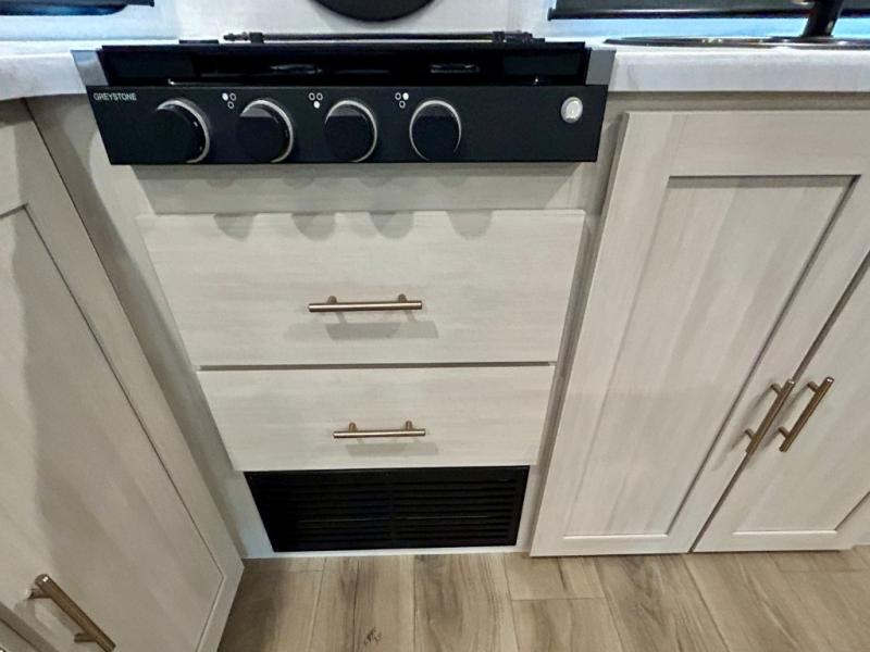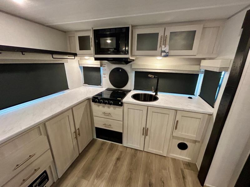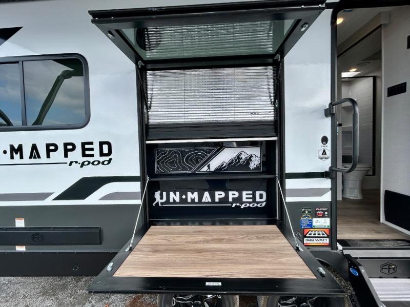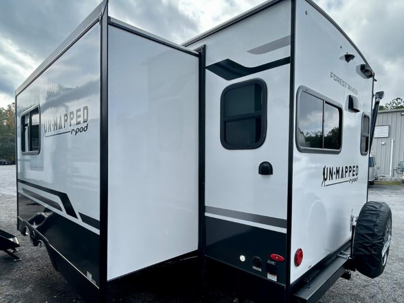 The Forest River Un-Mapped travel trailers deliver an unparalleled travel experience thanks to their incredible features, starting with the aluminum-framed floor with block foam insulation that ensures exceptional structural integrity and thermal efficiency, along with the sealed underbelly with forced heat & radiant foil barrier that provides superior insulation and heat management, and the power tongue jack facilitates easy maneuvering and stabilization of the trailer. Plus, the 30 Amp charge controller with solar inverter prep is ready for integration with solar power systems, catering to eco-conscious travelers seeking off-grid capabilities. Inside, you will find seamless Surf-X kitchen countertops that offer a sleek, durable surface and are easy to maintain for busy travelers. Further, the blackout roller shades will add privacy and light control for restful nights and cozy daytime retreats.
