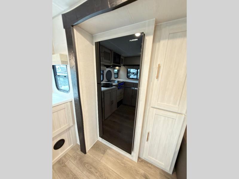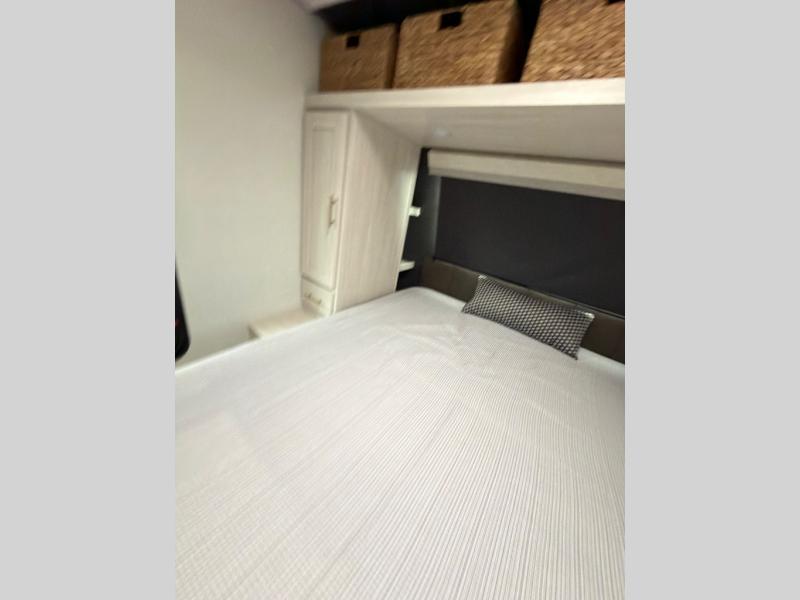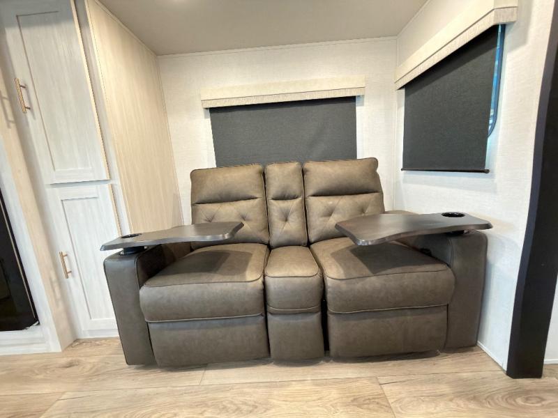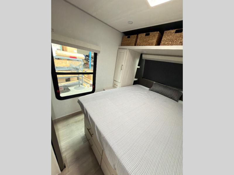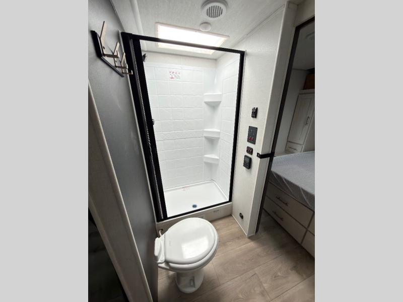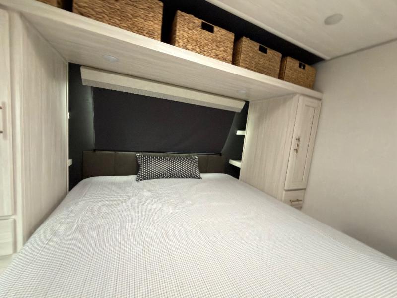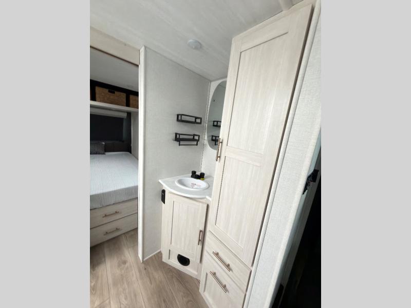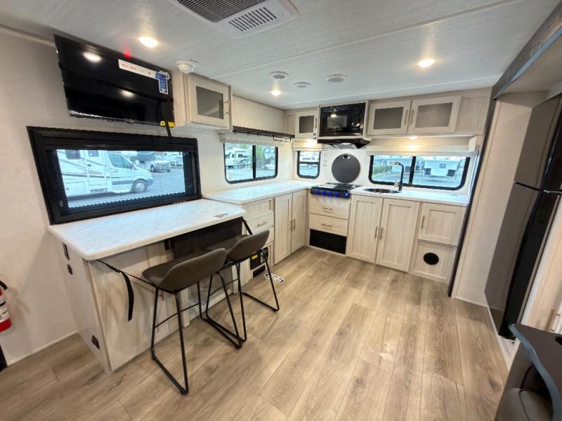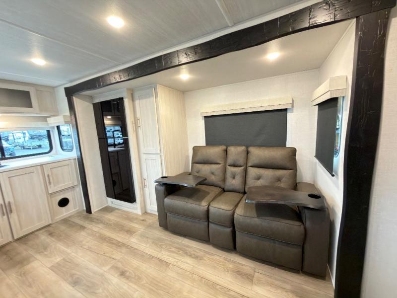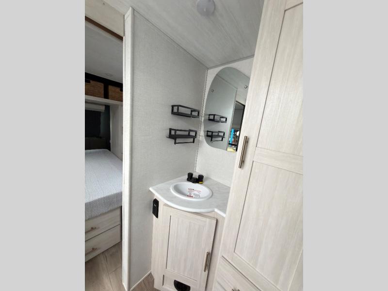 This travel trailer's functional rear kitchen boasts an air fryer/microwave that combines convenience for quick and healthy meal preparation, a shelf, overhead cabinets offering ample storage for culinary supplies and travel items, a fridge, and a pantry that delivers convenient storage for snacks and provisions. Plus, the bar 2 table creates a flexible space for casual dining and socializing, and the flip-up window enhances ventilation and brings in natural light for a bright kitchen ambiance. You can also rest a bit in the theater seating that provides comfortable, cinematic-style seating for relaxation. In the center of this RV, you will find a walk-through bathroom, adding convenience to the unit, and further, you will be mesmerized by the well-appointed front bedroom. Designed for two, this space offers a king-size bed, end tables, and a wardrobe on each side of the bed, featuring ample storage and convenient bedside spaces for comfort and organization.
