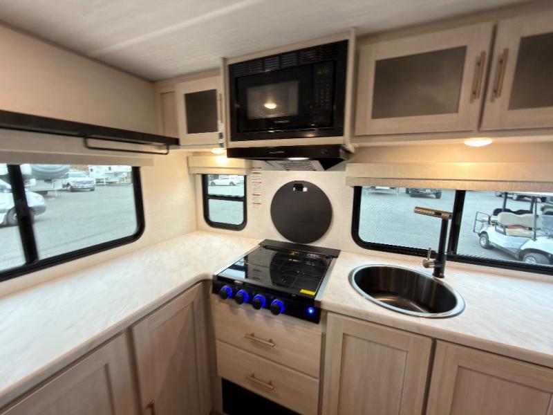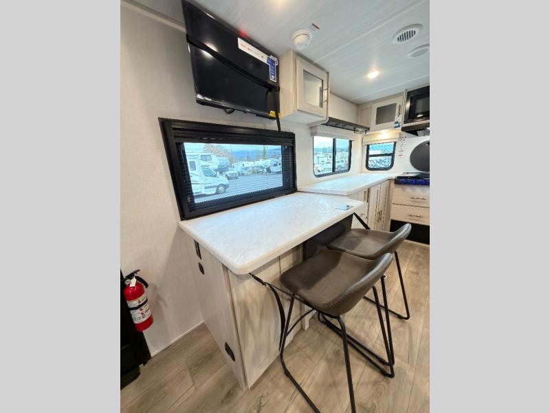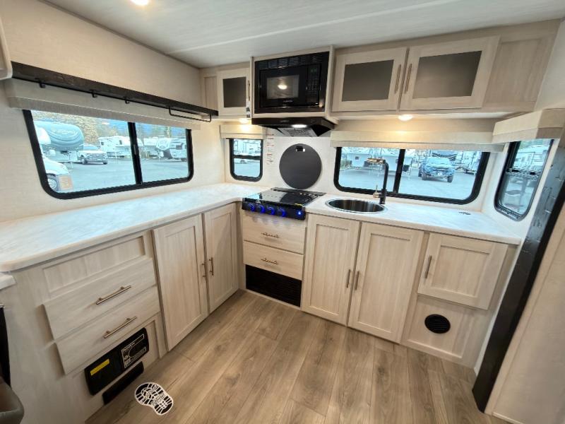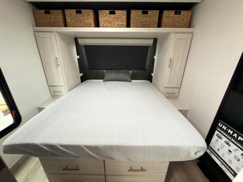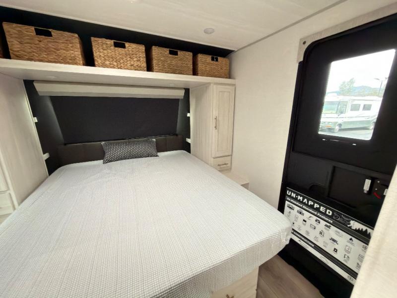 The Forest River Un-Mapped travel trailers deliver an unparalleled travel experience thanks to their incredible features, starting with the aluminum-framed floor with block foam insulation that ensures exceptional structural integrity and thermal efficiency, along with the sealed underbelly with forced heat & radiant foil barrier that provides superior insulation and heat management, and the power tongue jack facilitates easy maneuvering and stabilization of the trailer. Plus, the 30 Amp charge controller with solar inverter prep is ready for integration with solar power systems, catering to eco-conscious travelers seeking off-grid capabilities. Inside, you will find seamless Surf-X kitchen countertops that offer a sleek, durable surface and are easy to maintain for busy travelers. Further, the blackout roller shades will add privacy and light control for restful nights and cozy daytime retreats.