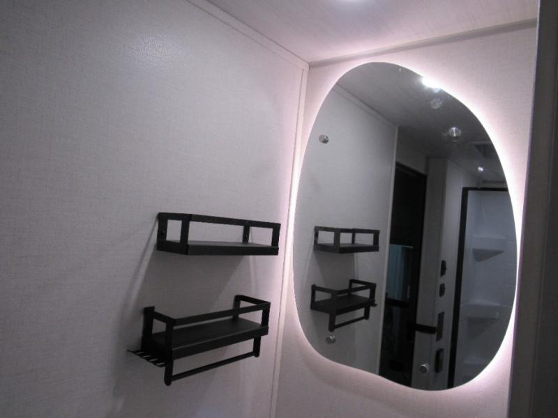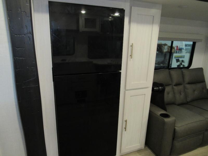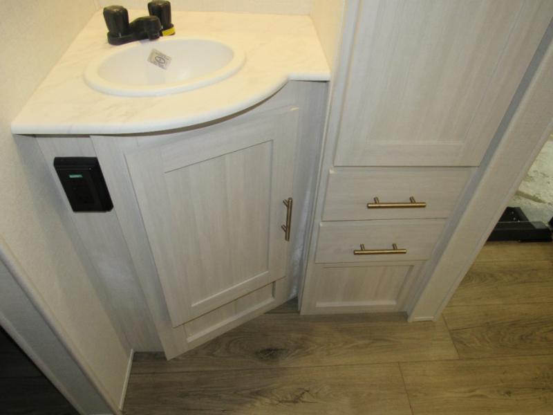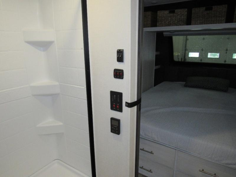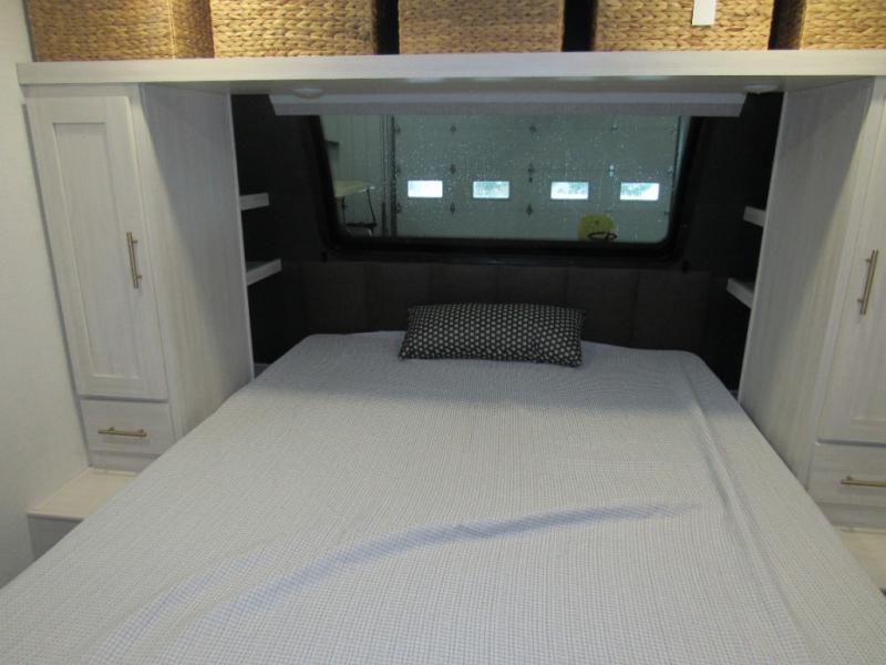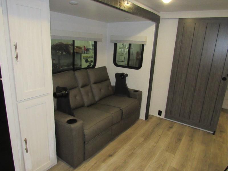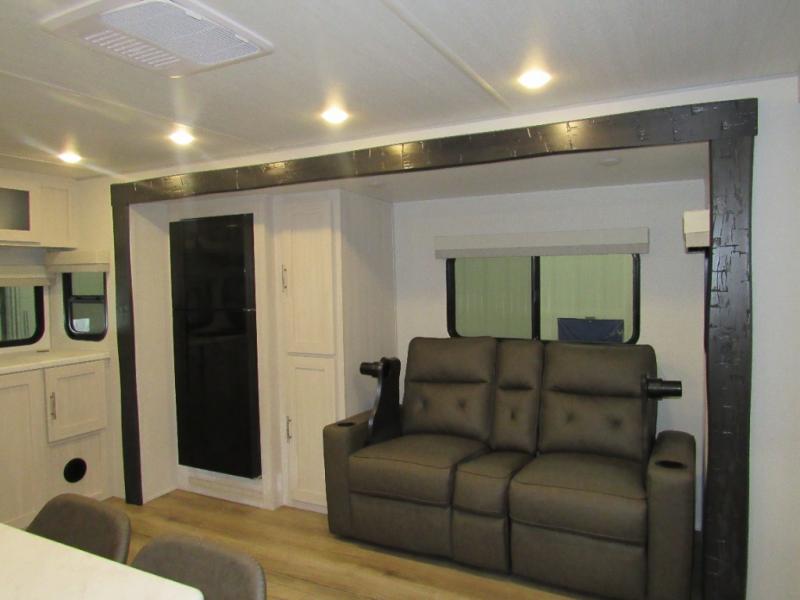 This travel trailer's functional rear kitchen boasts an air fryer/microwave that combines convenience for quick and healthy meal preparation, a shelf, overhead cabinets offering ample storage for culinary supplies and travel items, a fridge, and a pantry that delivers convenient storage for snacks and provisions. Plus, the bar 2 table creates a flexible space for casual dining and socializing, and the flip-up window enhances ventilation and brings in natural light for a bright kitchen ambiance. You can also rest a bit in the theater seating that provides comfortable, cinematic-style seating for relaxation. In the center of this RV, you will find a walk-through bathroom, adding convenience to the unit, and further, you will be mesmerized by the well-appointed front bedroom. Designed for two, this space offers a king-size bed, end tables, and a wardrobe on each side of the bed, featuring ample storage and convenient bedside spaces for comfort and organization.