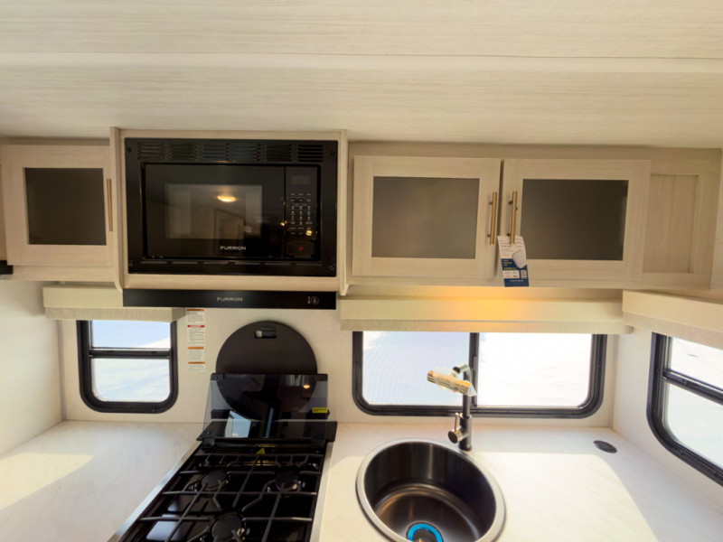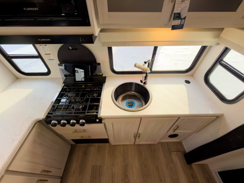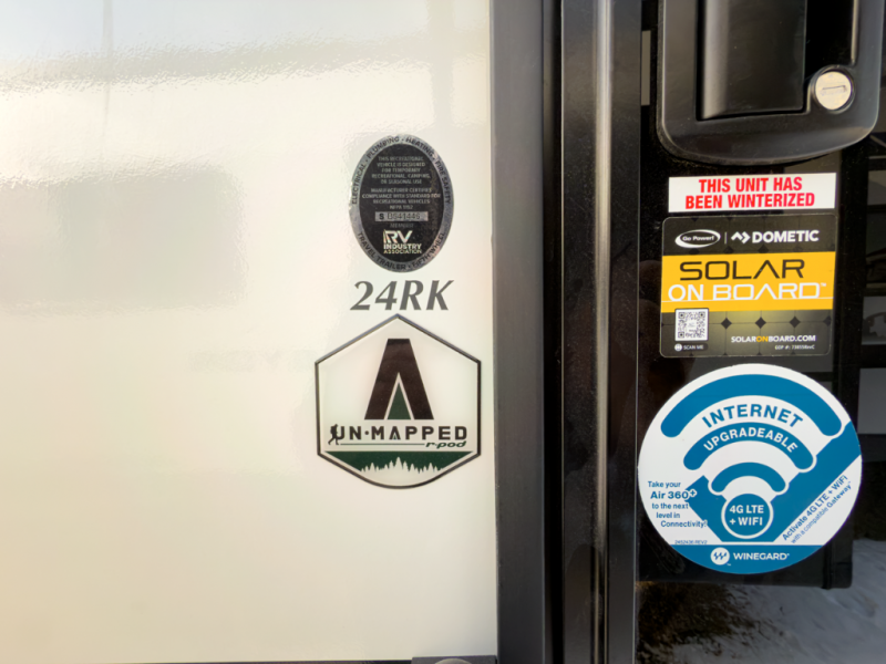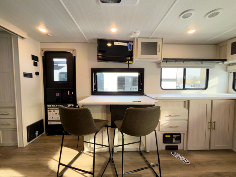 The Un•Mapped 24RK blends R-Pod’s lightweight towing ease with a flexible interior layout. The rear kitchen, TrailGate outdoor bar, and Bar2Table dinette add real versatility whether you’re cooking inside or out.