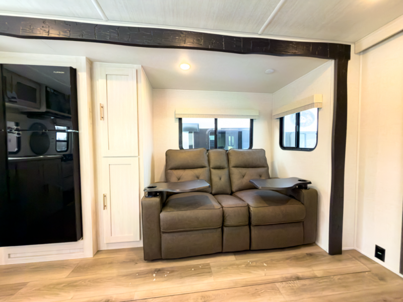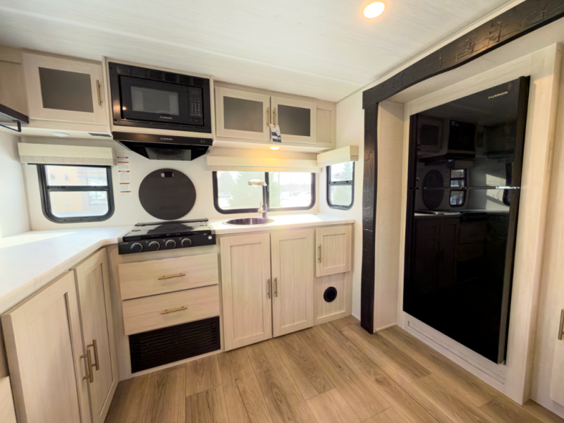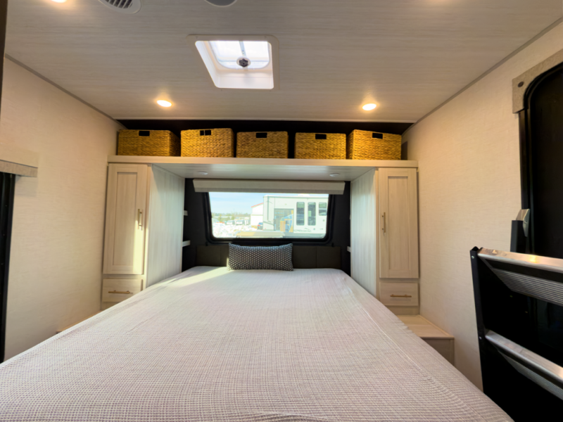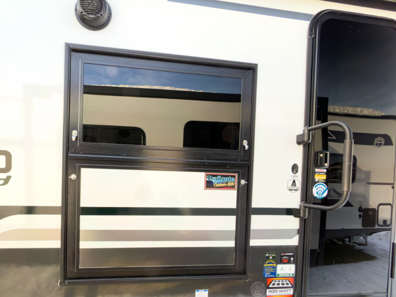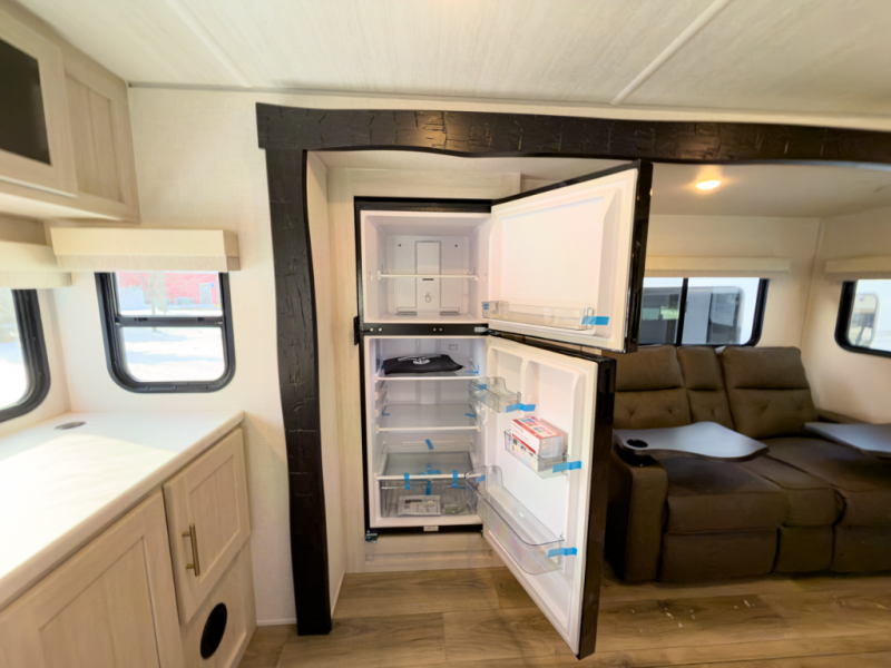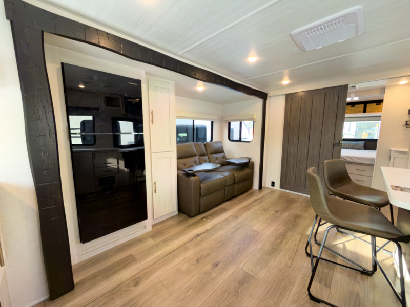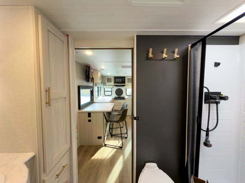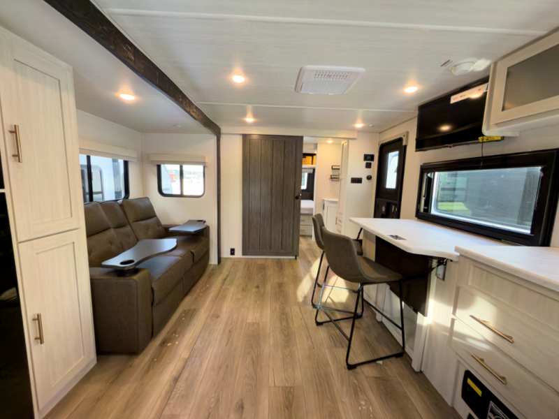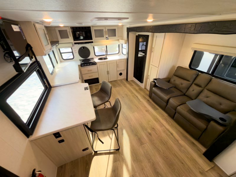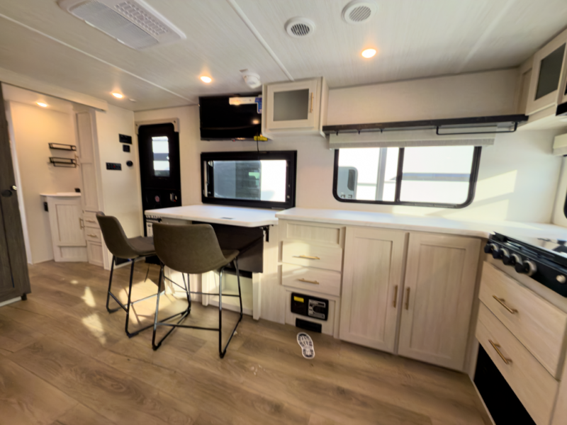A: This 24RK delivers a rear kitchen with Bar2Table dinette, king-size bed, tankless hot water, and 21' awning — all in a manageable 28' 11" package.