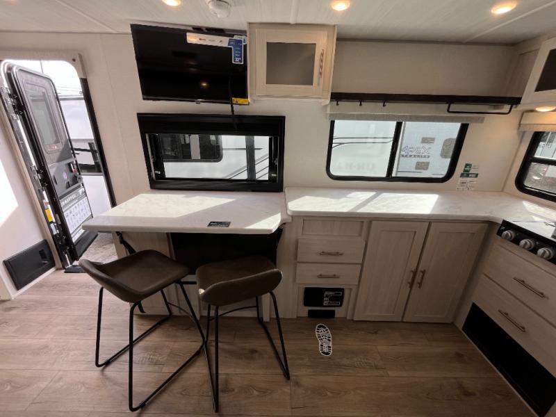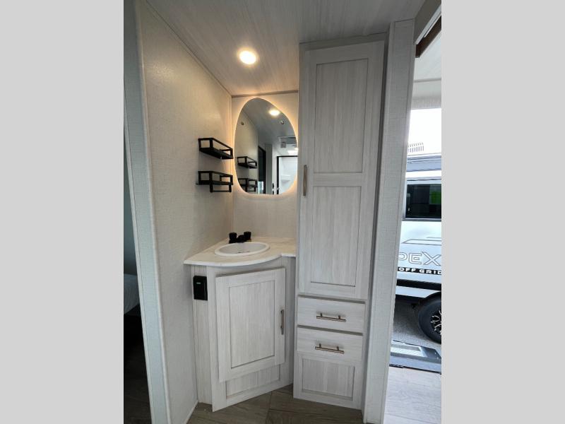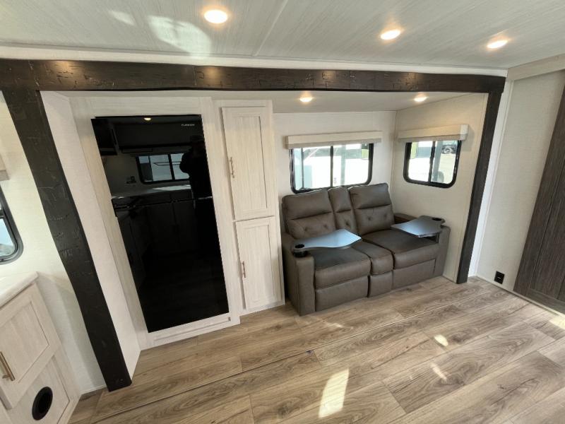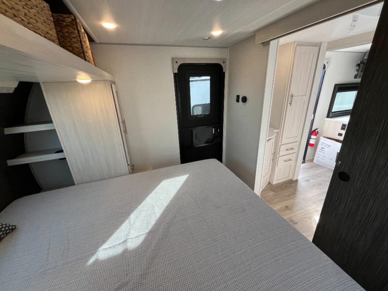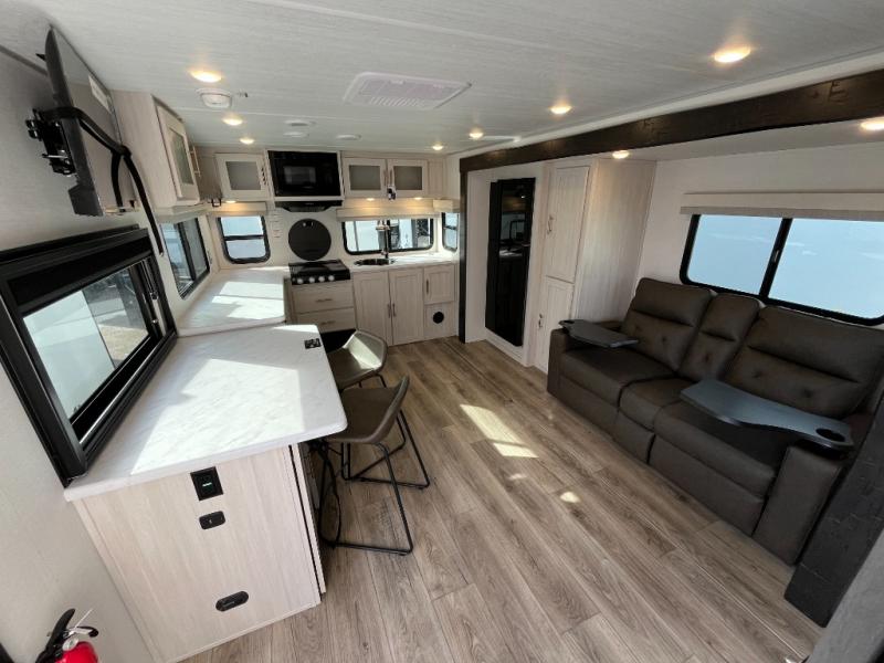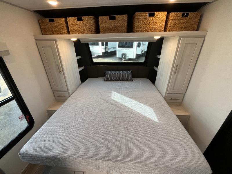 This travel trailer's functional rear kitchen boasts an air fryer/microwave that combines convenience for quick and healthy meal preparation, a shelf, overhead cabinets offering ample storage for culinary supplies and travel items, a fridge, and a pantry that delivers convenient storage for snacks and provisions. Plus, the bar 2 table creates a flexible space for casual dining and socializing, and the flip-up window enhances ventilation and brings in natural light for a bright kitchen ambiance. You can also rest a bit in the theater seating that provides comfortable, cinematic-style seating for relaxation. In the center of this RV, you will find a walk-through bathroom, adding convenience to the unit, and further, you will be mesmerized by the well-appointed front bedroom. Designed for two, this space offers a king-size bed, end tables, and a wardrobe on each side of the bed, featuring ample storage and convenient bedside spaces for comfort and organization.