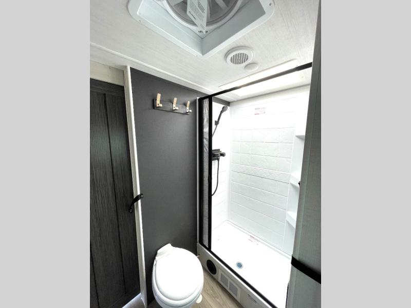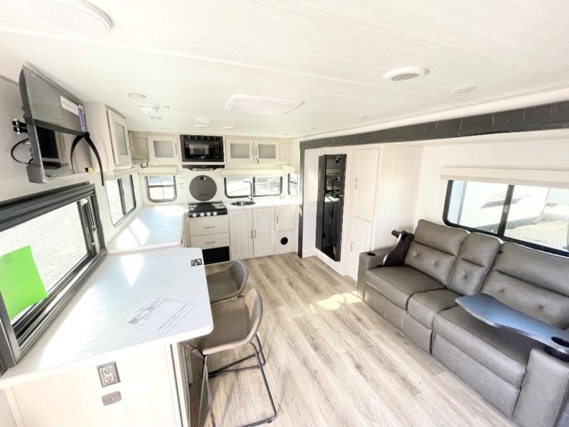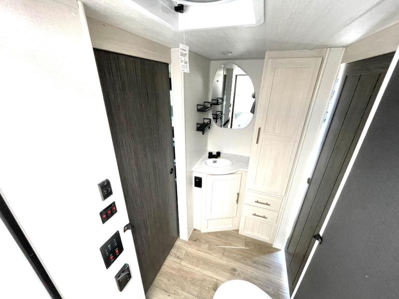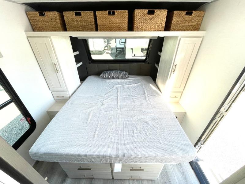 This travel trailer's functional rear kitchen boasts an air fryer/microwave that combines convenience for quick and healthy meal preparation, a shelf, overhead cabinets offering ample storage for culinary supplies and travel items, a fridge, and a pantry that delivers convenient storage for snacks and provisions. Plus, the bar 2 table creates a flexible space for casual dining and socializing, and the flip-up window enhances ventilation and brings in natural light for a bright kitchen ambiance. You can also rest a bit in the theater seating that provides comfortable, cinematic-style seating for relaxation. In the center of this RV, you will find a walk-through bathroom, adding convenience to the unit, and further, you will be mesmerized by the well-appointed front bedroom. Designed for two, this space offers a king-size bed, end tables, and a wardrobe on each side of the bed, featuring ample storage and convenient bedside spaces for comfort and organization.