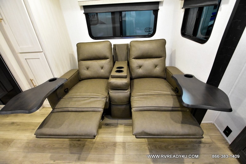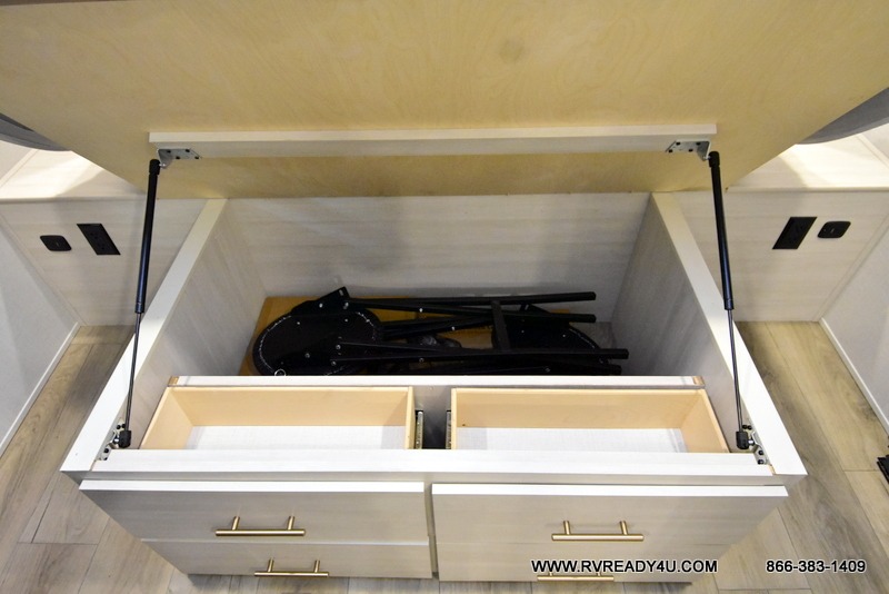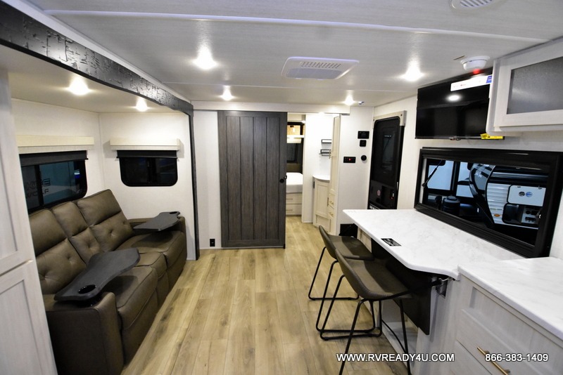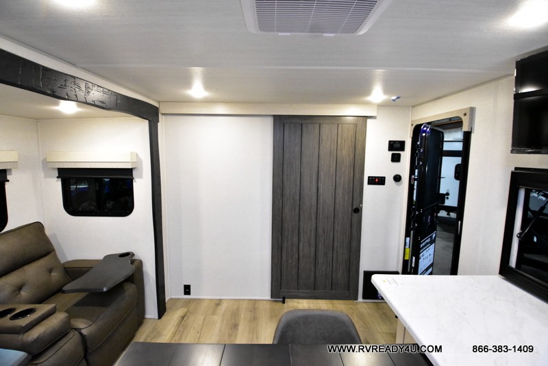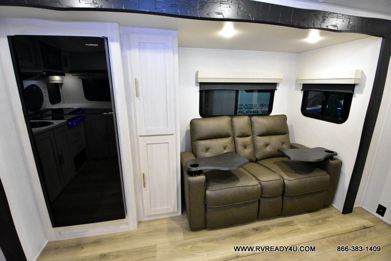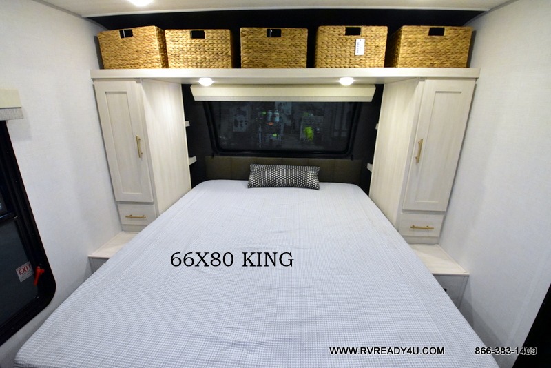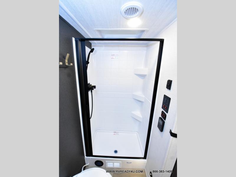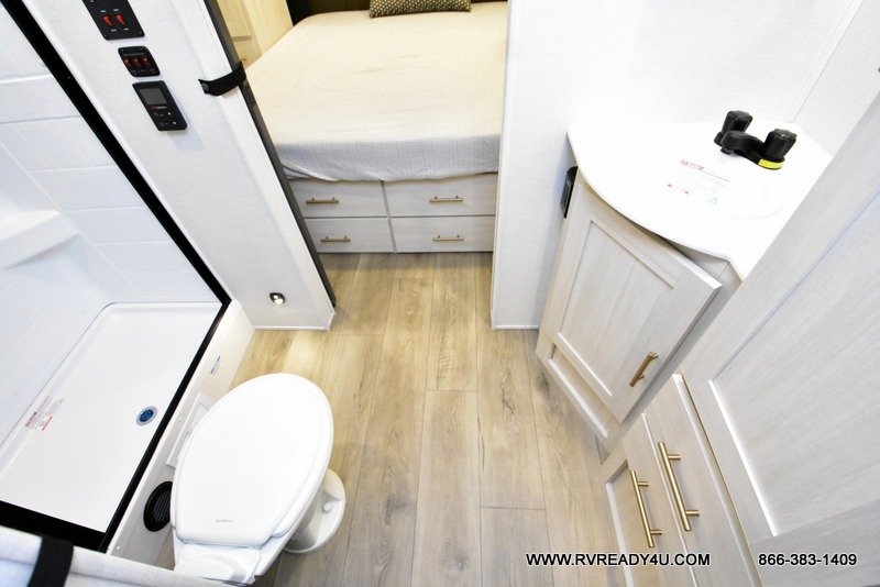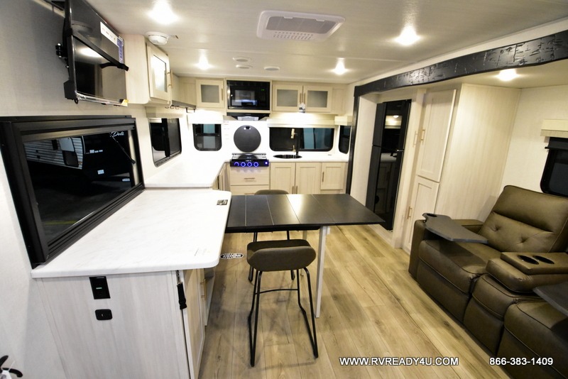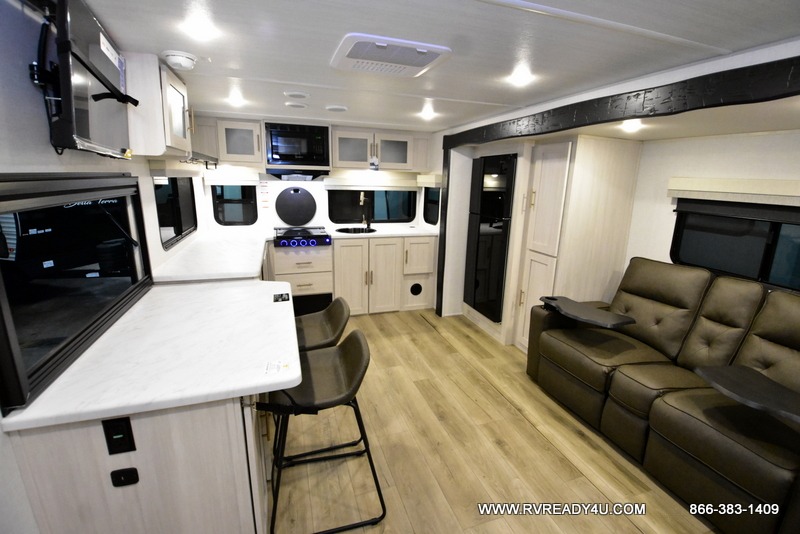 This travel trailer's functional rear kitchen boasts an air fryer/microwave that combines convenience for quick and healthy meal preparation, a shelf, overhead cabinets offering ample storage for culinary supplies and travel items, a fridge, and a pantry that delivers convenient storage for snacks and provisions. Plus, the bar 2 table creates a flexible space for casual dining and socializing, and the flip-up window enhances ventilation and brings in natural light for a bright kitchen ambiance. You can also rest a bit in the theater seating that provides comfortable, cinematic-style seating for relaxation. In the center of this RV, you will find a walk-through bathroom, adding convenience to the unit, and further, you will be mesmerized by the well-appointed front bedroom. Designed for two, this space offers a king-size bed, end tables, and a wardrobe on each side of the bed, featuring ample storage and convenient bedside spaces for comfort and organization.