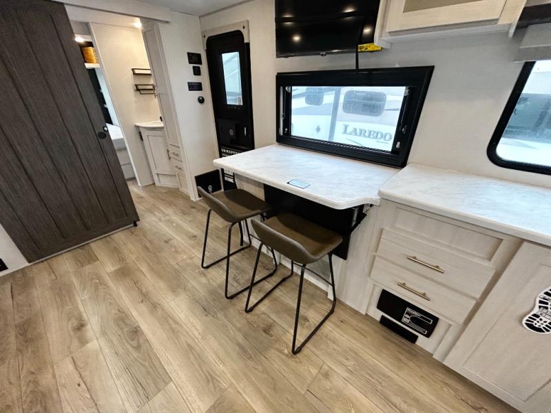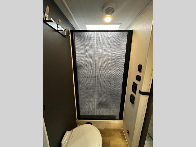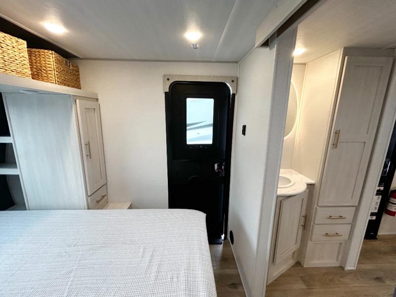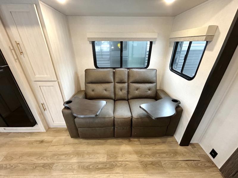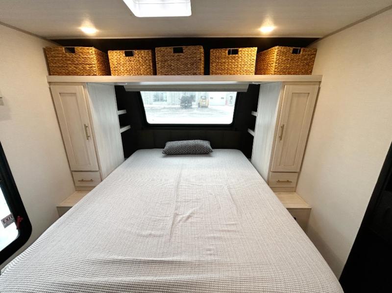 This travel trailer's functional rear kitchen boasts an air fryer/microwave that combines convenience for quick and healthy meal preparation, a shelf, overhead cabinets offering ample storage for culinary supplies and travel items, a fridge, and a pantry that delivers convenient storage for snacks and provisions. Plus, the bar 2 table creates a flexible space for casual dining and socializing, and the flip-up window enhances ventilation and brings in natural light for a bright kitchen ambiance. You can also rest a bit in the theater seating that provides comfortable, cinematic-style seating for relaxation. In the center of this RV, you will find a walk-through bathroom, adding convenience to the unit, and further, you will be mesmerized by the well-appointed front bedroom. Designed for two, this space offers a king-size bed, end tables, and a wardrobe on each side of the bed, featuring ample storage and convenient bedside spaces for comfort and organization.