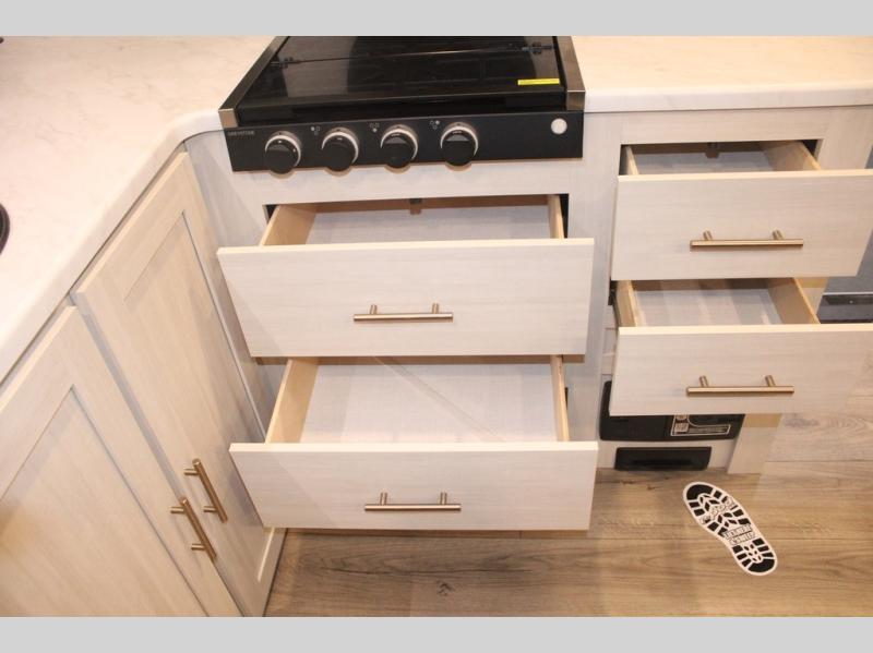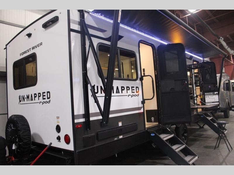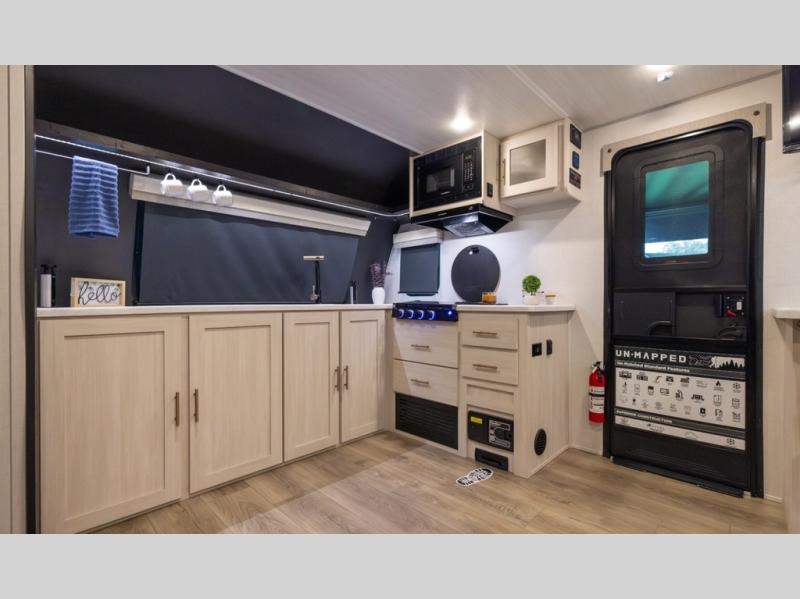 The Forest River Un-Mapped travel trailers deliver an unparalleled travel experience thanks to their incredible features, starting with the aluminum-framed floor with block foam insulation that ensures exceptional structural integrity and thermal efficiency, along with the sealed underbelly with forced heat & radiant foil barrier that provides superior insulation and heat management, and the power tongue jack facilitates easy maneuvering and stabilization of the trailer. Plus, the 30 Amp charge controller with solar inverter prep is ready for integration with solar power systems, catering to eco-conscious travelers seeking off-grid capabilities. Inside, you will find seamless Surf-X kitchen countertops that offer a sleek, durable surface and are easy to maintain for busy travelers. Further, the blackout roller shades will add privacy and light control for restful nights and cozy daytime retreats.
