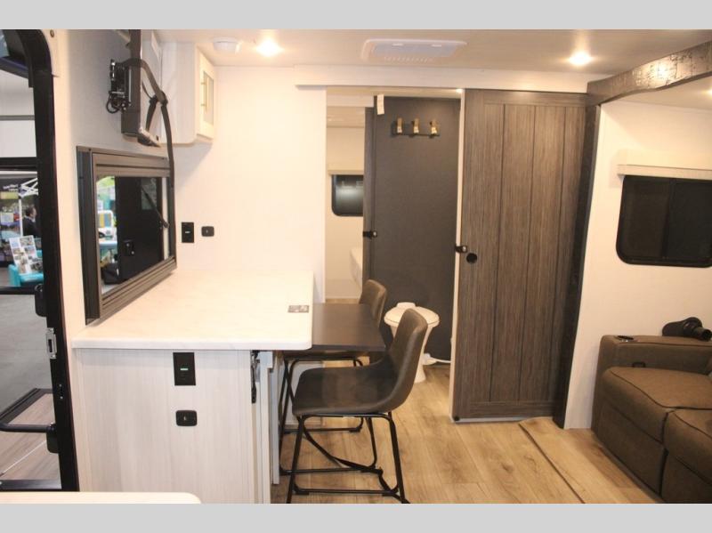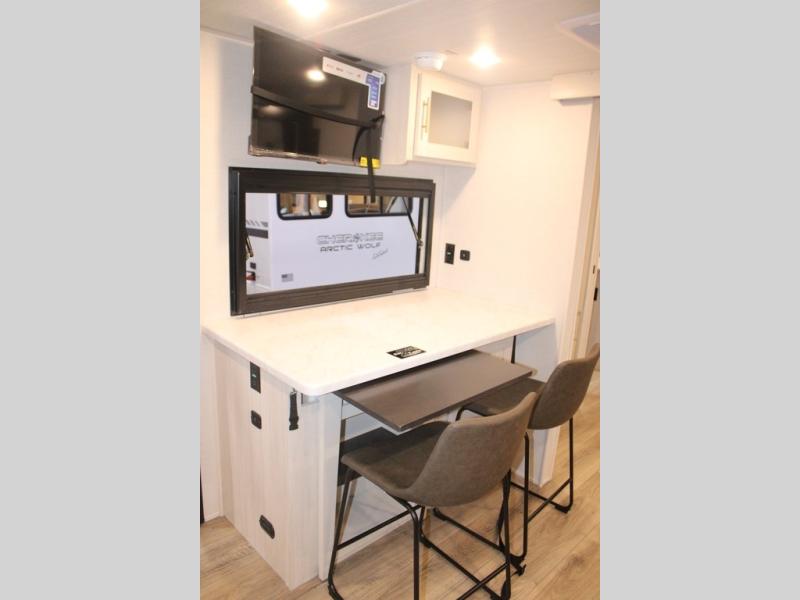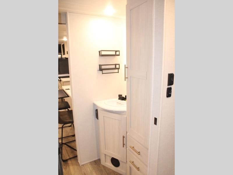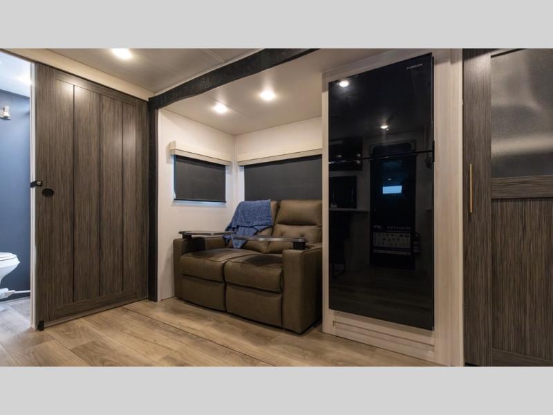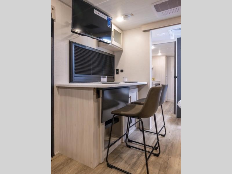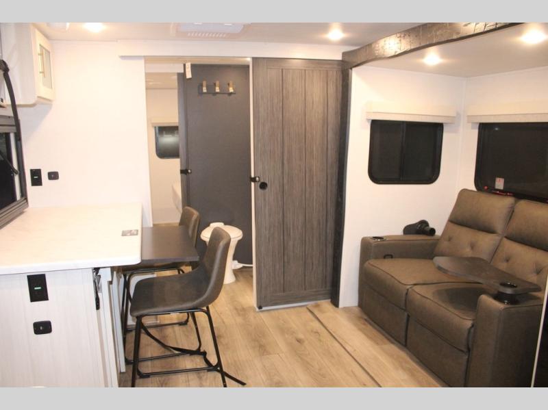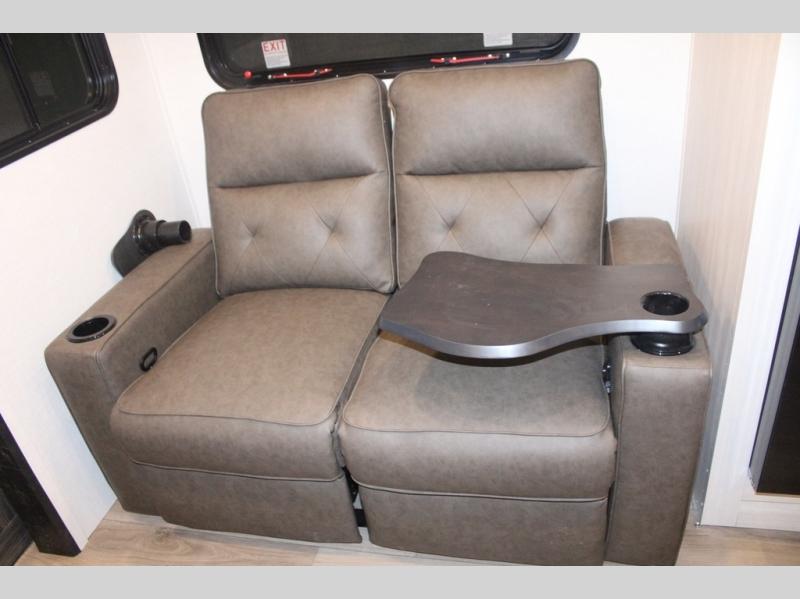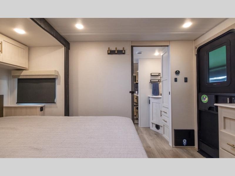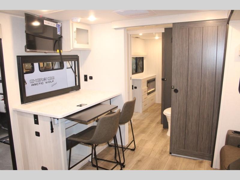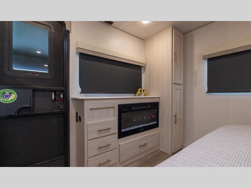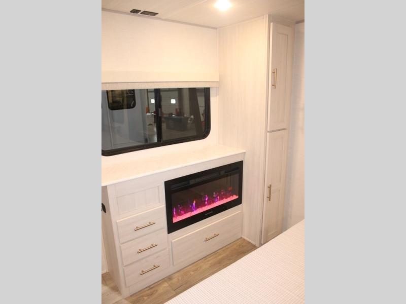 You and your partner will love the serene rear bedroom, featuring a custom king bed, which offers a sumptuous retreat for restful nights. The linen closet provides ample storage for bedding and personal items; the dresser delivers convenient storage for clothing, and the fireplace creates a cozy, inviting ambiance perfect for relaxation and unwinding after a day of adventure. Stay fresh with the walk-through designed bathroom that ensures easy accessibility and flow, plus the linen closet offers additional storage for linens and toiletries. You can rest in the theater seating, or take breakfast in the bar 2 table while enjoying great ventilation provided by the flip-up window. Finally, at the front of this unit, you will find a spacious kitchen that boasts a fridge for fresh beverages and food along the way, an air fryer/microwave, and a pantry for storing any snacks might be craving on the road!