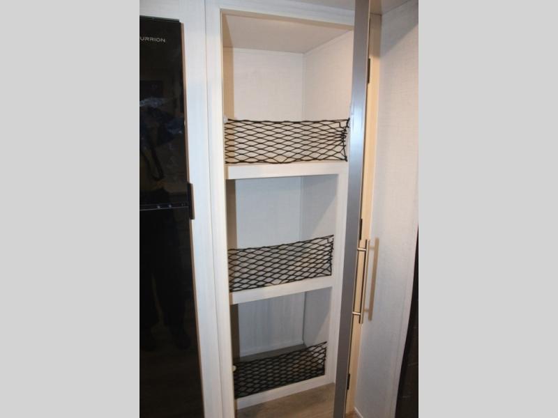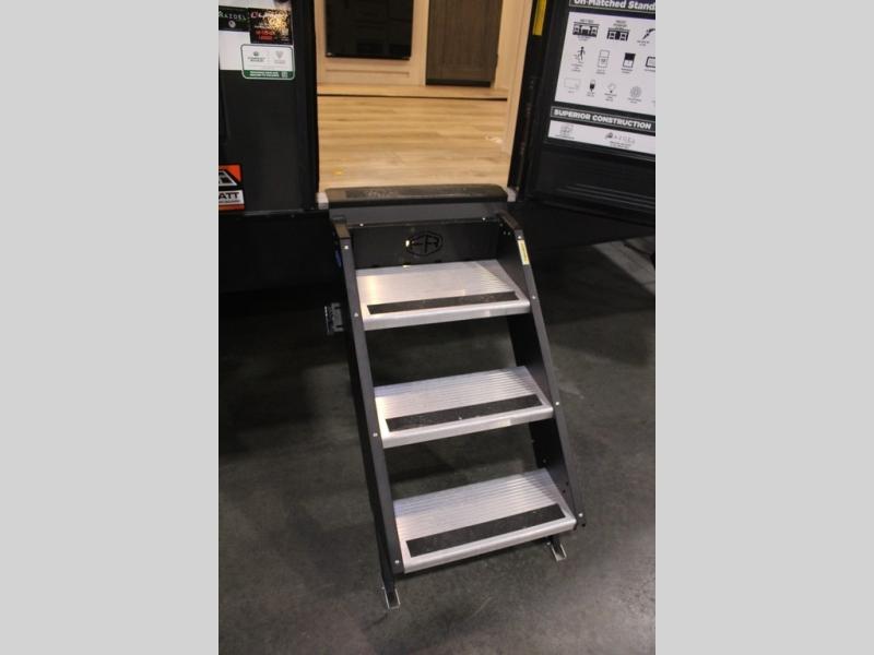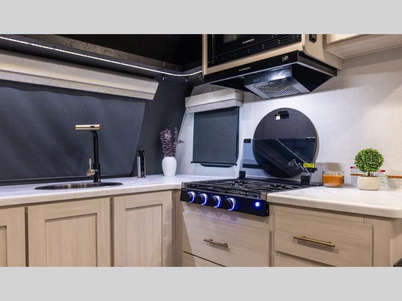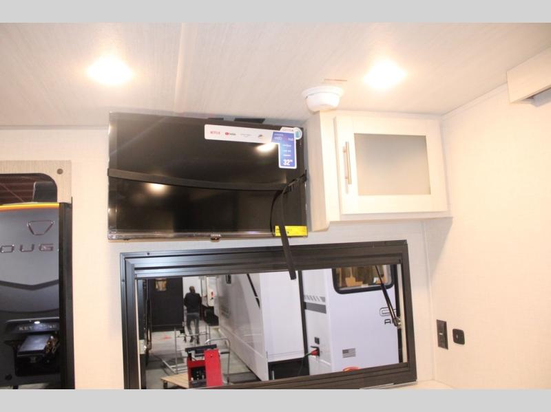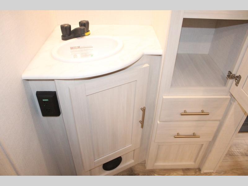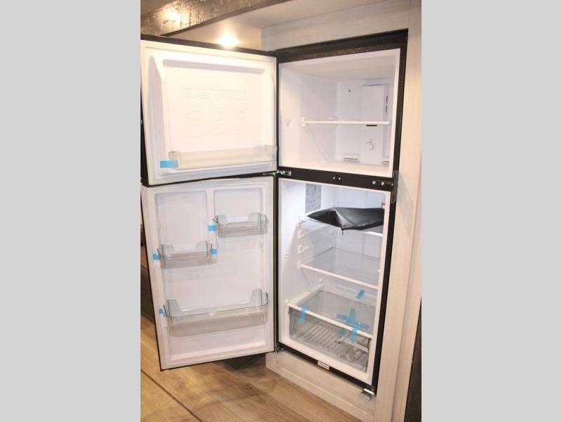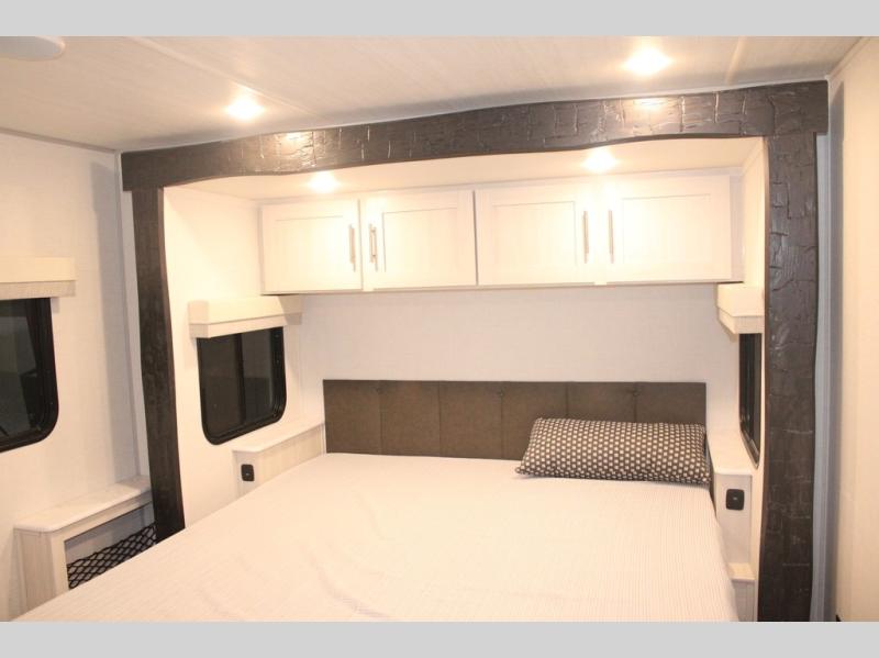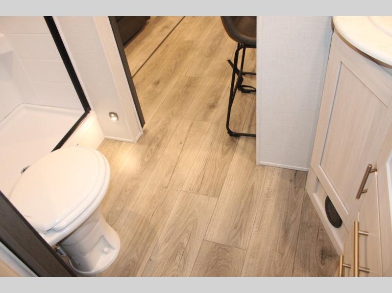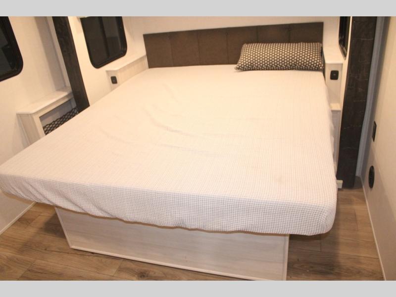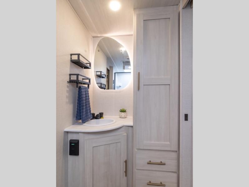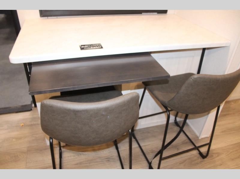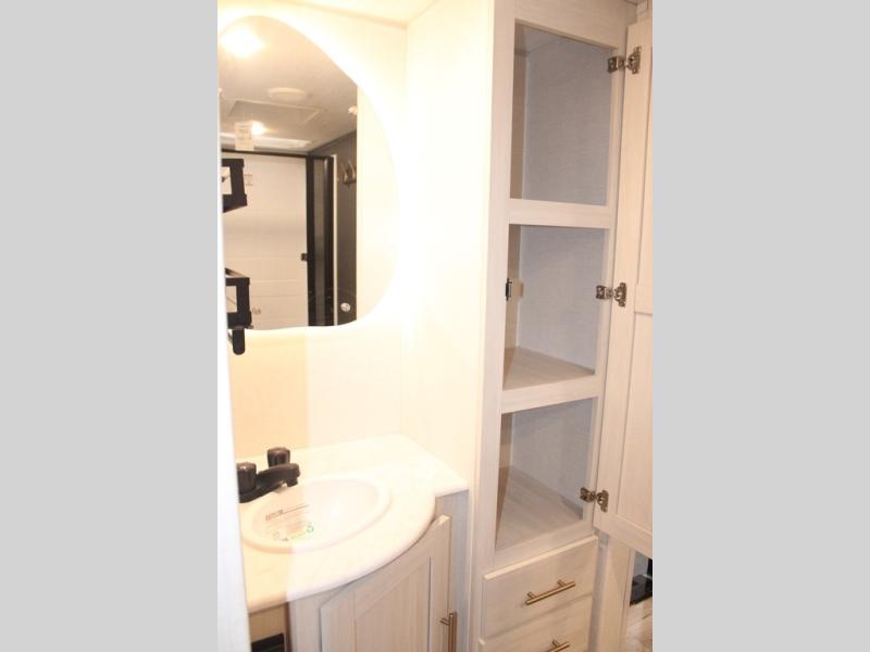 You and your partner will love the serene rear bedroom, featuring a custom king bed, which offers a sumptuous retreat for restful nights. The linen closet provides ample storage for bedding and personal items; the dresser delivers convenient storage for clothing, and the fireplace creates a cozy, inviting ambiance perfect for relaxation and unwinding after a day of adventure. Stay fresh with the walk-through designed bathroom that ensures easy accessibility and flow, plus the linen closet offers additional storage for linens and toiletries. You can rest in the theater seating, or take breakfast in the bar 2 table while enjoying great ventilation provided by the flip-up window. Finally, at the front of this unit, you will find a spacious kitchen that boasts a fridge for fresh beverages and food along the way, an air fryer/microwave, and a pantry for storing any snacks might be craving on the road!