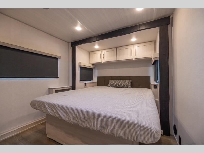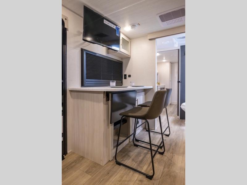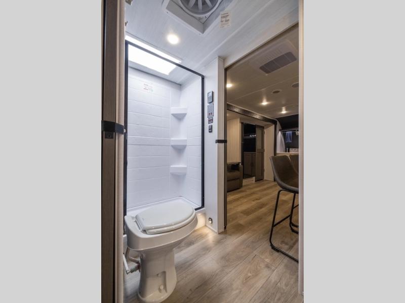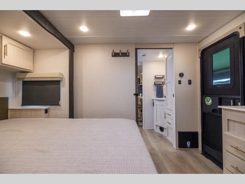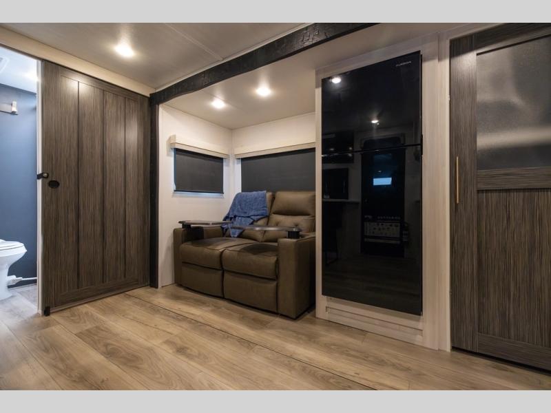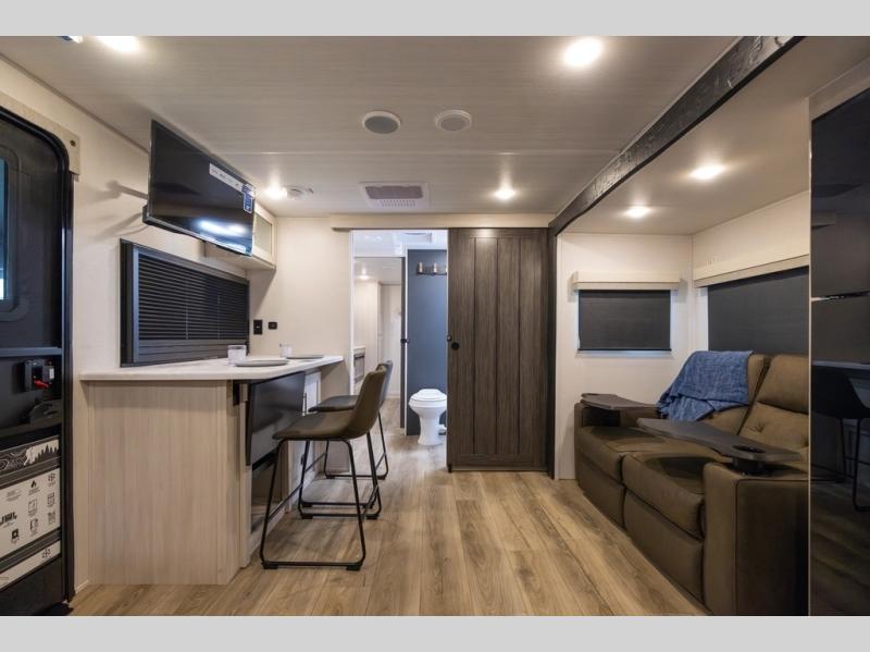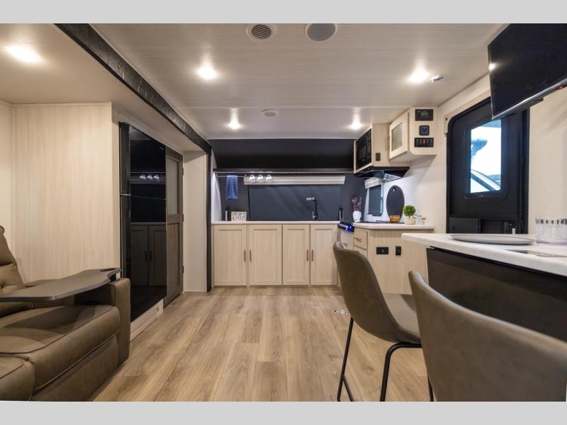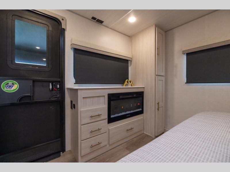 You and your partner will love the serene rear bedroom, featuring a custom king bed, which offers a sumptuous retreat for restful nights. The linen closet provides ample storage for bedding and personal items; the dresser delivers convenient storage for clothing, and the fireplace creates a cozy, inviting ambiance perfect for relaxation and unwinding after a day of adventure. Stay fresh with the walk-through designed bathroom that ensures easy accessibility and flow, plus the linen closet offers additional storage for linens and toiletries. You can rest in the theater seating, or take breakfast in the bar 2 table while enjoying great ventilation provided by the flip-up window. Finally, at the front of this unit, you will find a spacious kitchen that boasts a fridge for fresh beverages and food along the way, an air fryer/microwave, and a pantry for storing any snacks might be craving on the road!
