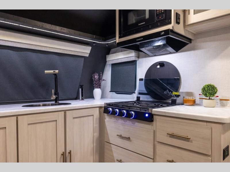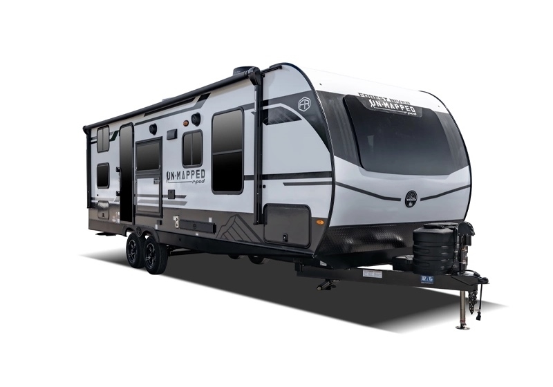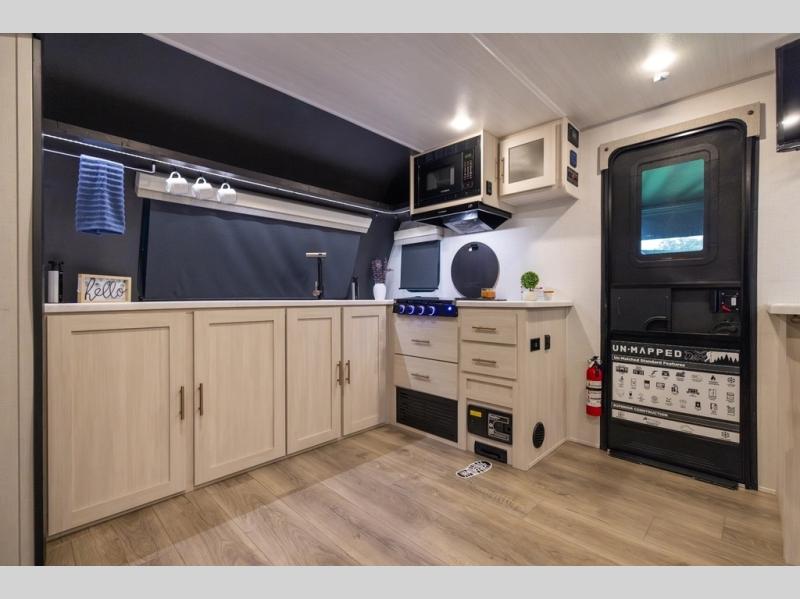 The Forest River Un-Mapped travel trailers deliver an unparalleled travel experience thanks to their incredible features, starting with the aluminum-framed floor with block foam insulation that ensures exceptional structural integrity and thermal efficiency, along with the sealed underbelly with forced heat & radiant foil barrier that provides superior insulation and heat management, and the power tongue jack facilitates easy maneuvering and stabilization of the trailer. Plus, the 30 Amp charge controller with solar inverter prep is ready for integration with solar power systems, catering to eco-conscious travelers seeking off-grid capabilities. Inside, you will find seamless Surf-X kitchen countertops that offer a sleek, durable surface and are easy to maintain for busy travelers. Further, the blackout roller shades will add privacy and light control for restful nights and cozy daytime retreats.