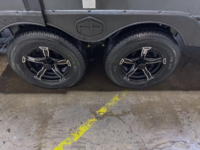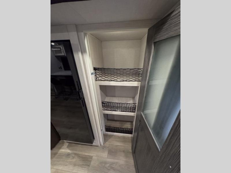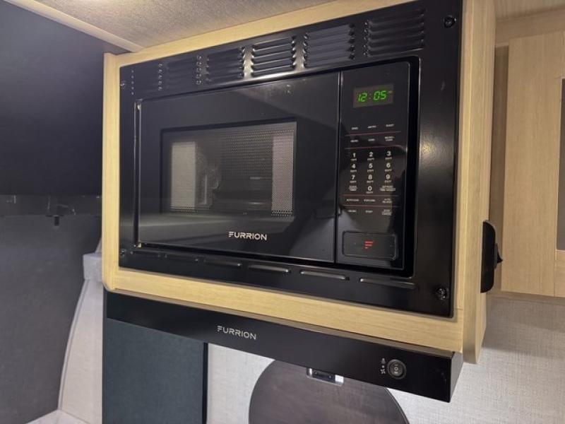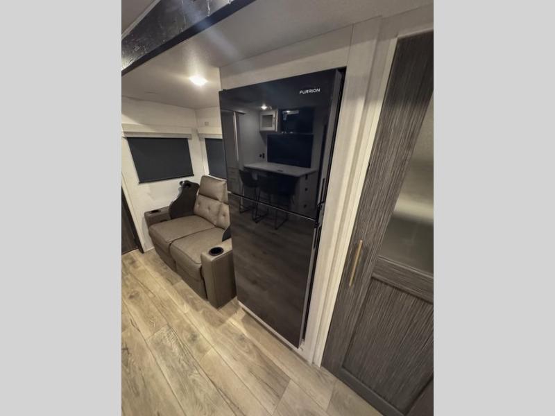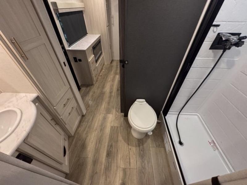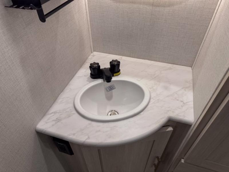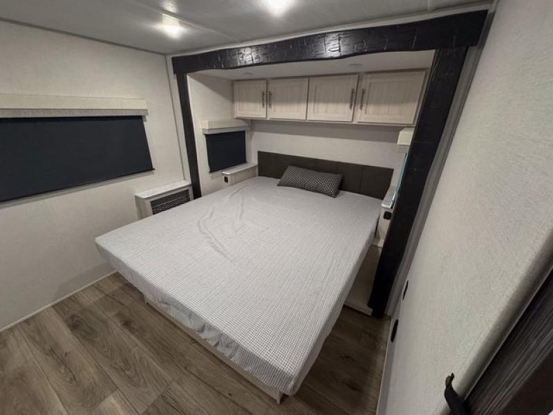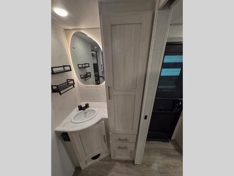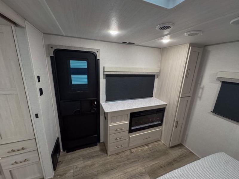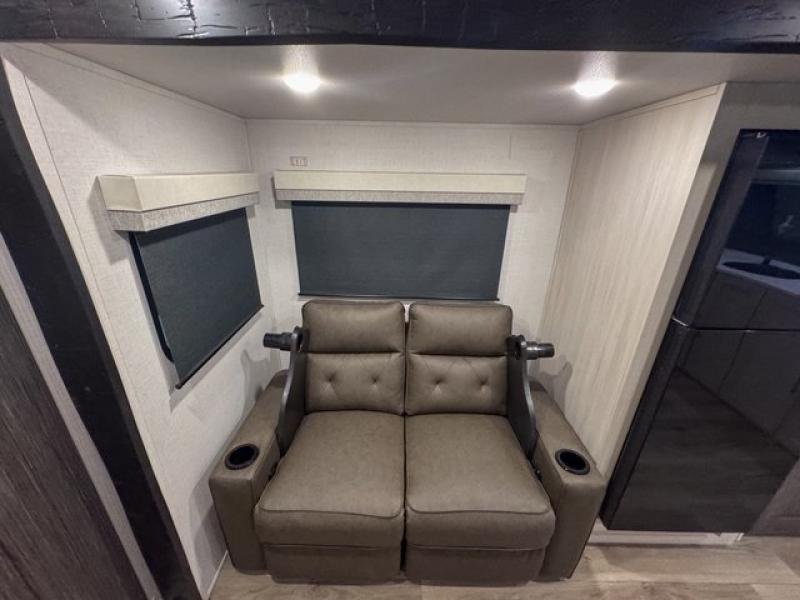 You and your partner will love the serene rear bedroom, featuring a custom king bed, which offers a sumptuous retreat for restful nights. The linen closet provides ample storage for bedding and personal items; the dresser delivers convenient storage for clothing, and the fireplace creates a cozy, inviting ambiance perfect for relaxation and unwinding after a day of adventure. Stay fresh with the walk-through designed bathroom that ensures easy accessibility and flow, plus the linen closet offers additional storage for linens and toiletries. You can rest in the theater seating, or take breakfast in the bar 2 table while enjoying great ventilation provided by the flip-up window. Finally, at the front of this unit, you will find a spacious kitchen that boasts a fridge for fresh beverages and food along the way, an air fryer/microwave, and a pantry for storing any snacks might be craving on the road!