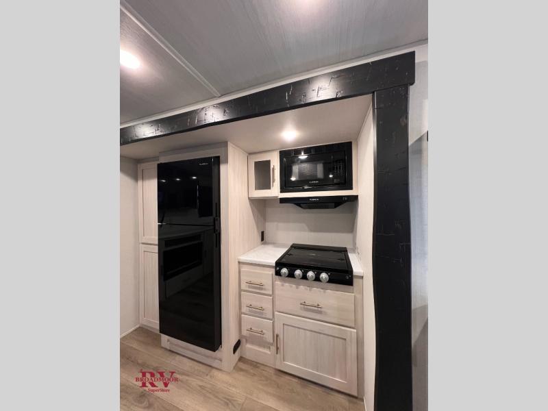 The inviting and sophisticated living area has a cutting-edge entertainment center that provides a focal point for relaxation and enjoyment, perfect for streaming favorite series or high-definition movies. The sofa offers comfortable seating for unwinding and socializing in a warm ambiance. Plus, the pull-out ottoman adds versatile seating and extra comfort for guests or moments of deep relaxation. In the kitchen area, you will have a spacious refrigerator, a pantry, a bar countertop with two chairs, overhead cabinets for better organization, and an air fryer/microwave that fuses functionality for quick and healthy meal preparation. The convenient walk-through bathroom will be your best ally when you want to take a shower after a long day in the mountains, and the front bedroom will be a great, serene retreat to have a good night's sleep.