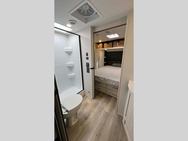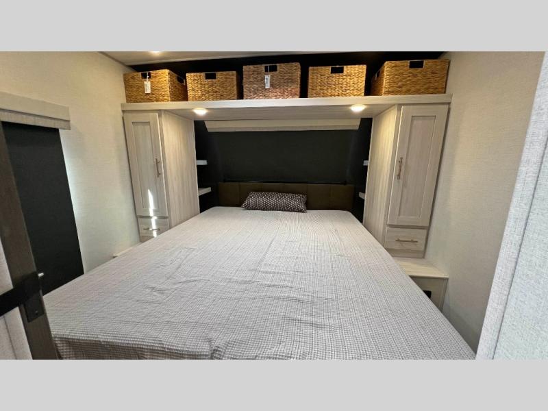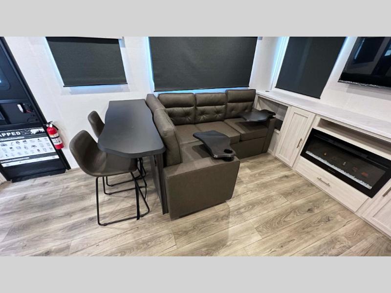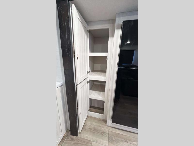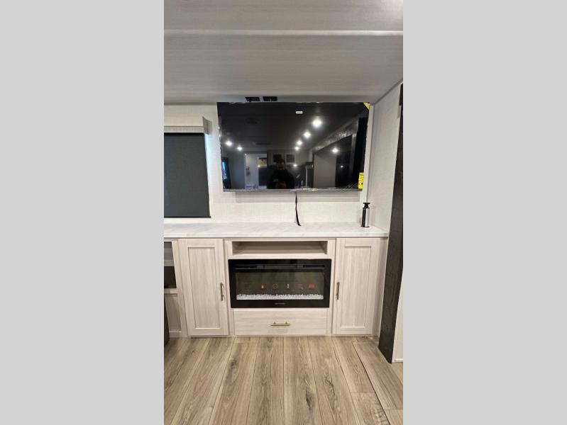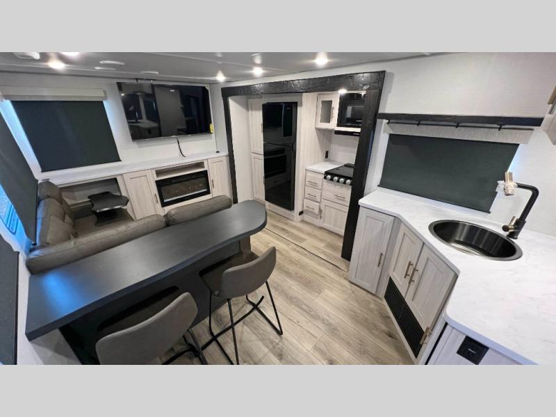 The inviting and sophisticated living area has a cutting-edge entertainment center that provides a focal point for relaxation and enjoyment, perfect for streaming favorite series or high-definition movies. The sofa offers comfortable seating for unwinding and socializing in a warm ambiance. Plus, the pull-out ottoman adds versatile seating and extra comfort for guests or moments of deep relaxation. In the kitchen area, you will have a spacious refrigerator, a pantry, a bar countertop with two chairs, overhead cabinets for better organization, and an air fryer/microwave that fuses functionality for quick and healthy meal preparation. The convenient walk-through bathroom will be your best ally when you want to take a shower after a long day in the mountains, and the front bedroom will be a great, serene retreat to have a good night's sleep.
