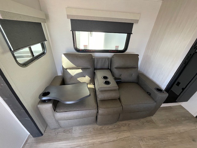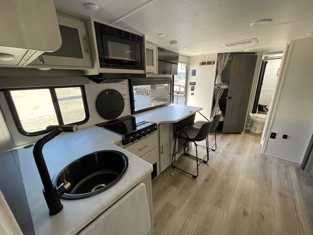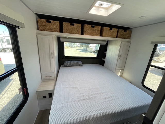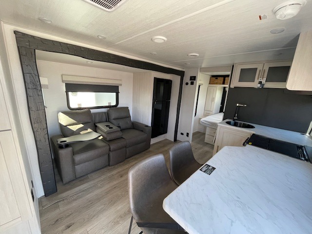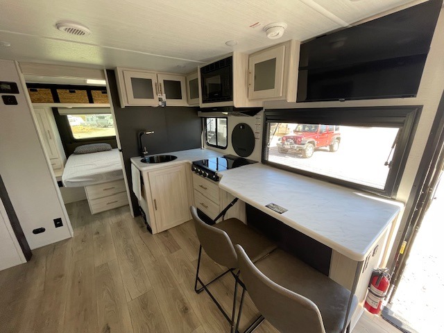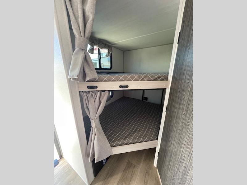 Discover ultimate comfort and functionality in travel with this incredible travel trailer. The full bathroom is a practical and functional space for personal care, ensuring comfort on every journey. Double bunk beds are ideal for families or travelers seeking additional cozy sleeping options. You can cook like a Michelin-star chef with the complete kitchen that comes with a pantry, fridge, an air fryer/microwave, and a countertop extension that adds extra space for culinary prep and serving meals with ease. Further, the dreamy primary bedroom features a custom king bed with wardrobes and end tables on each side of the bed, offering storage and practical spaces for optimal comfort and accessibility.