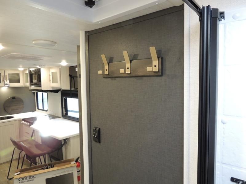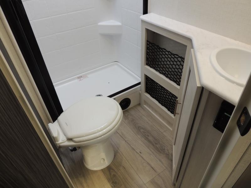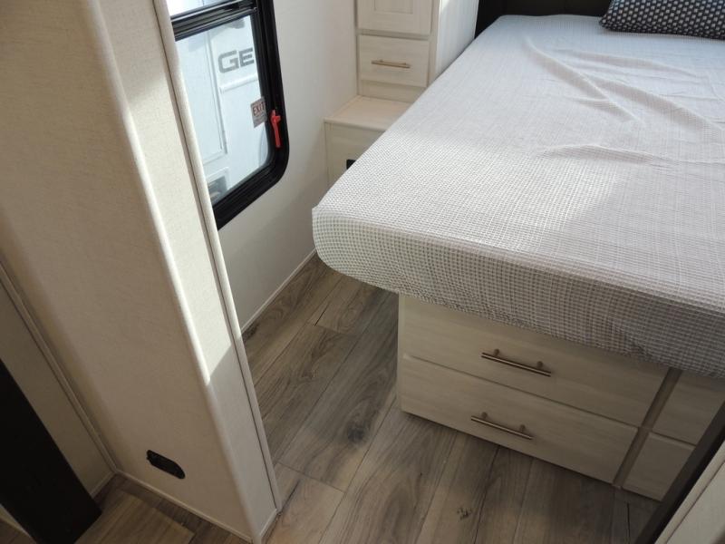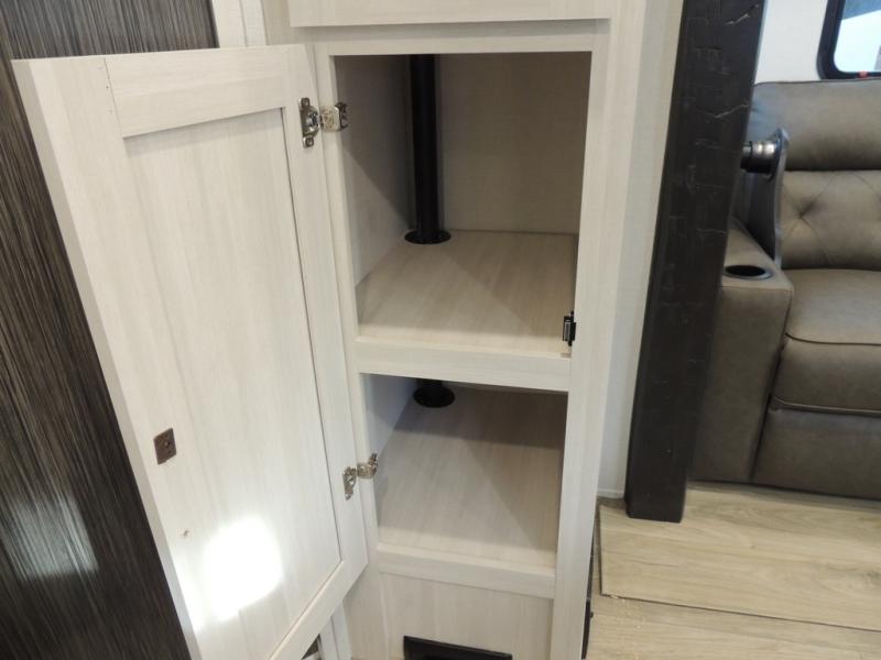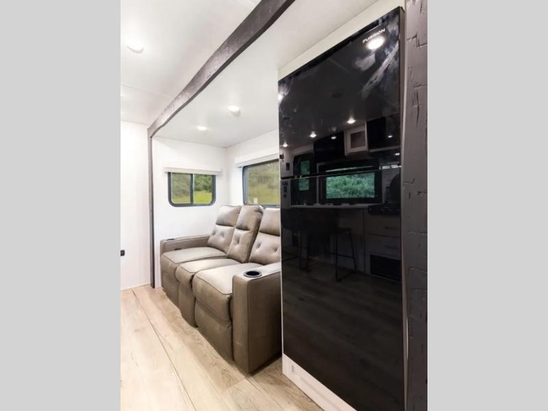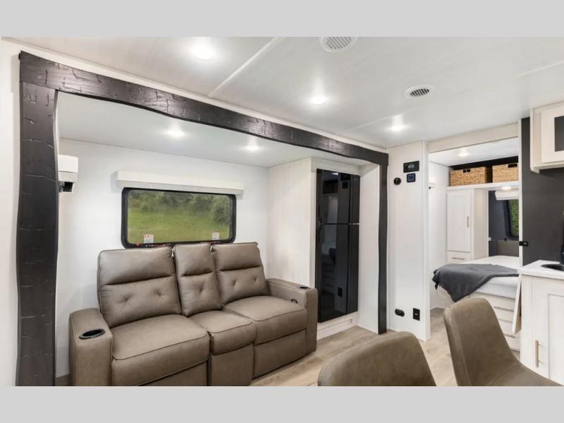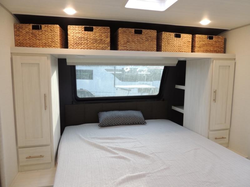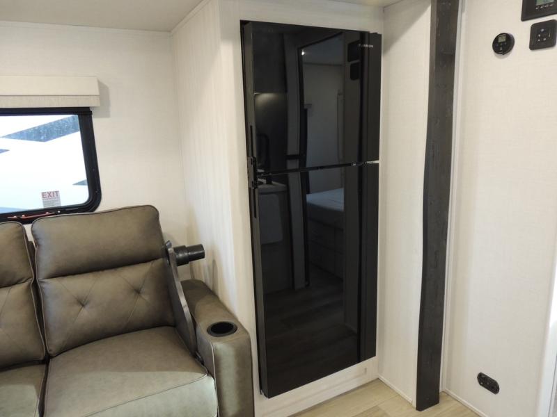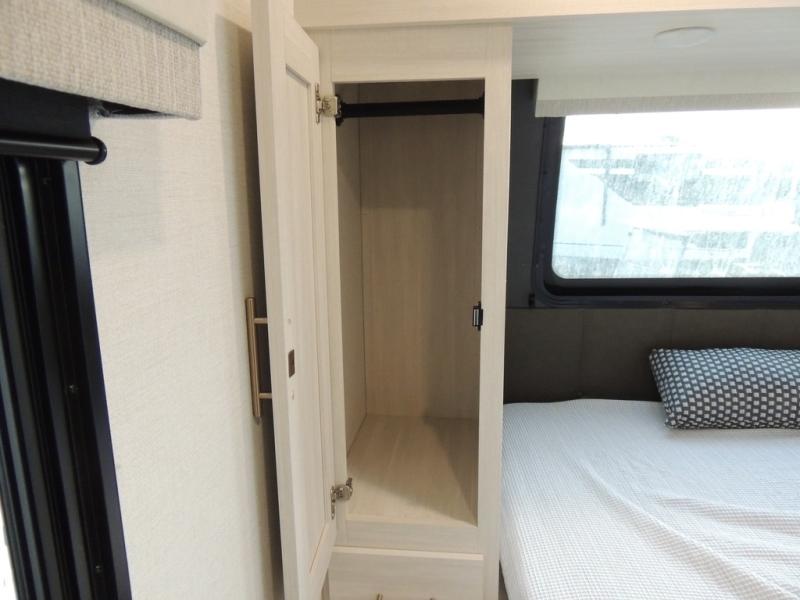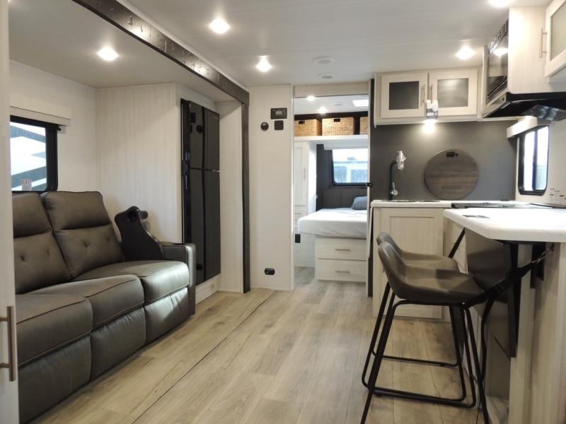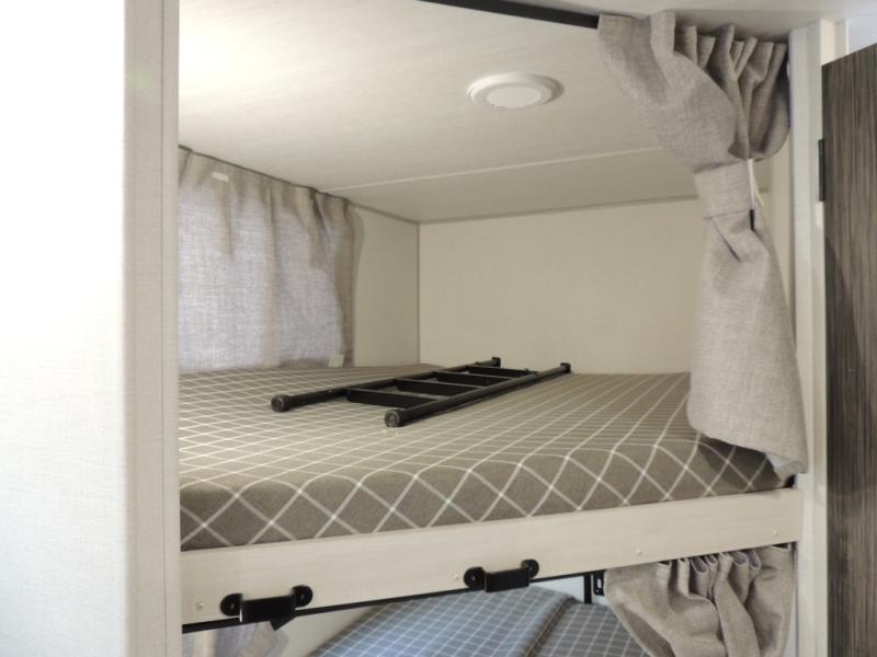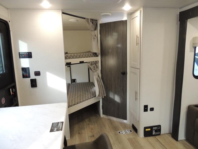 Discover ultimate comfort and functionality in travel with this incredible travel trailer. The full bathroom is a practical and functional space for personal care, ensuring comfort on every journey. Double bunk beds are ideal for families or travelers seeking additional cozy sleeping options. You can cook like a Michelin-star chef with the complete kitchen that comes with a pantry, fridge, an air fryer/microwave, and a countertop extension that adds extra space for culinary prep and serving meals with ease. Further, the dreamy primary bedroom features a custom king bed with wardrobes and end tables on each side of the bed, offering storage and practical spaces for optimal comfort and accessibility.