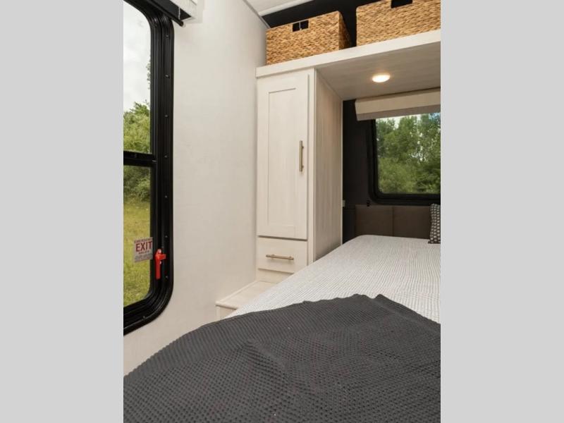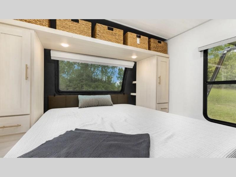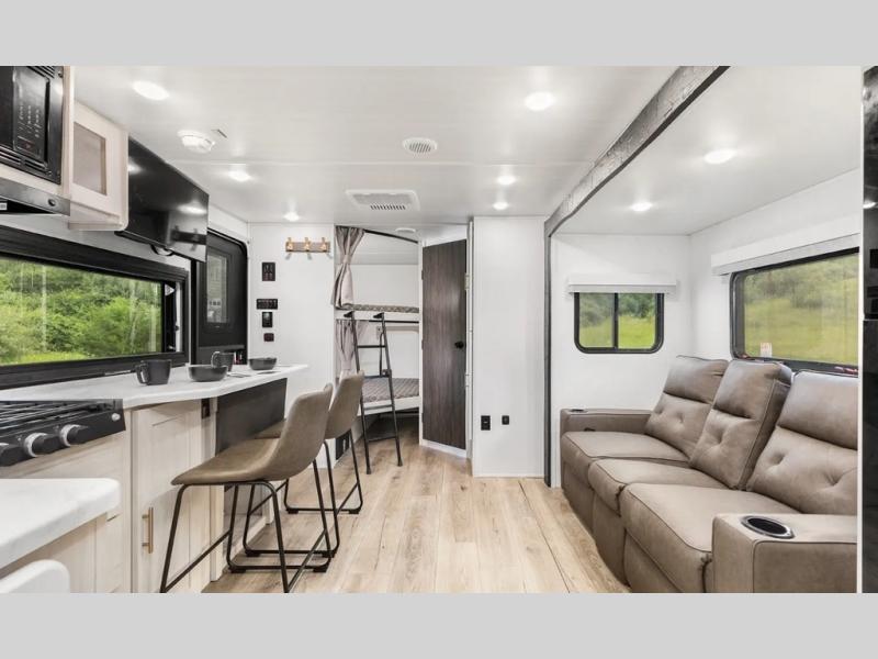 Discover ultimate comfort and functionality in travel with this incredible travel trailer. The full bathroom is a practical and functional space for personal care, ensuring comfort on every journey. Double bunk beds are ideal for families or travelers seeking additional cozy sleeping options. You can cook like a Michelin-star chef with the complete kitchen that comes with a pantry, fridge, an air fryer/microwave, and a countertop extension that adds extra space for culinary prep and serving meals with ease. Further, the dreamy primary bedroom features a custom king bed with wardrobes and end tables on each side of the bed, offering storage and practical spaces for optimal comfort and accessibility.