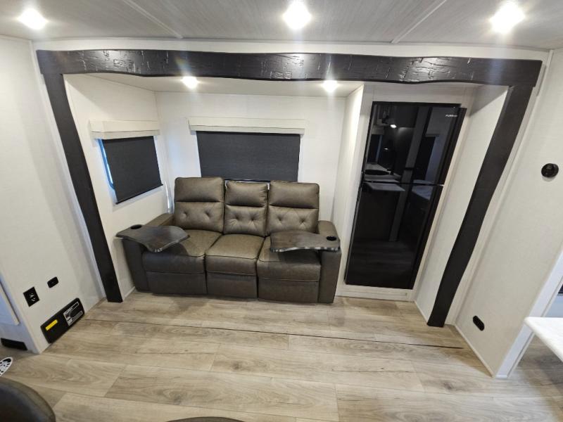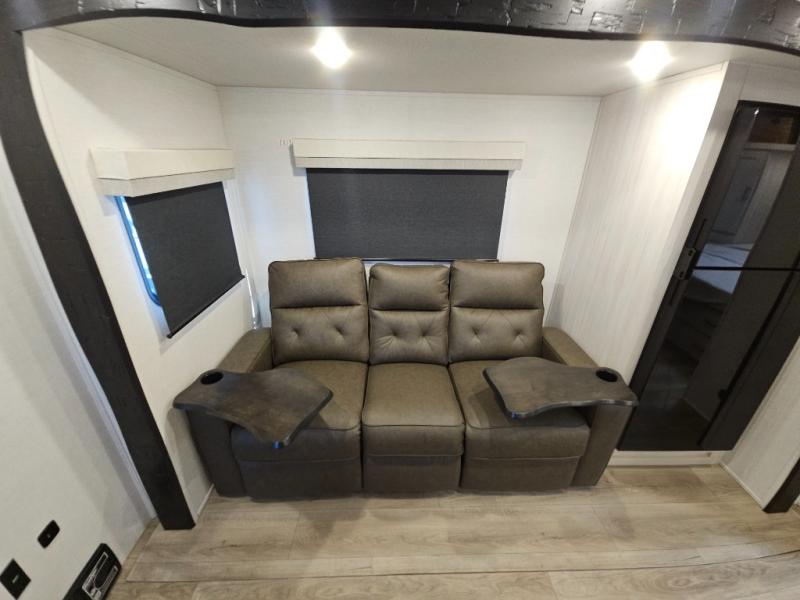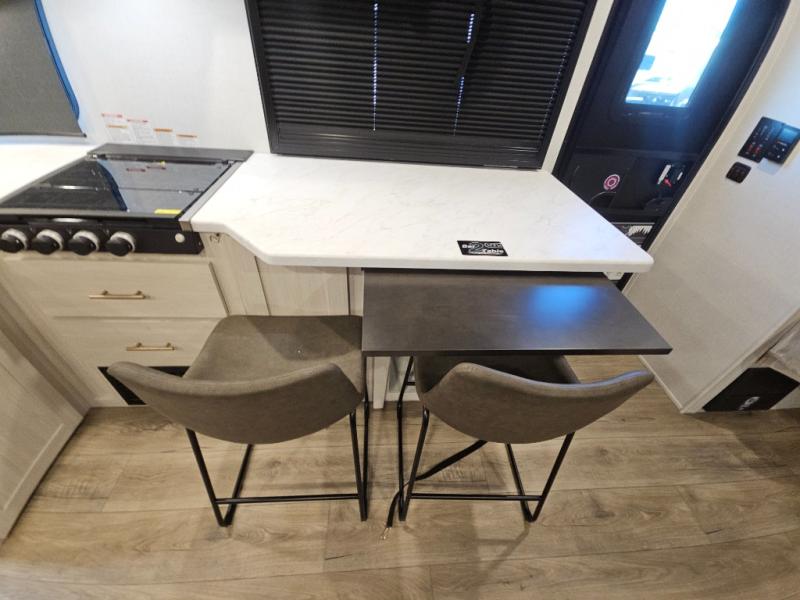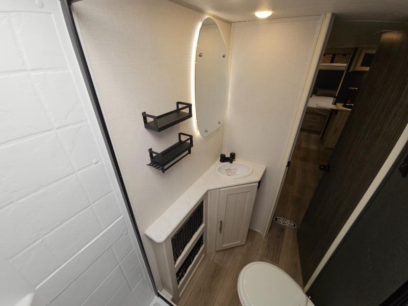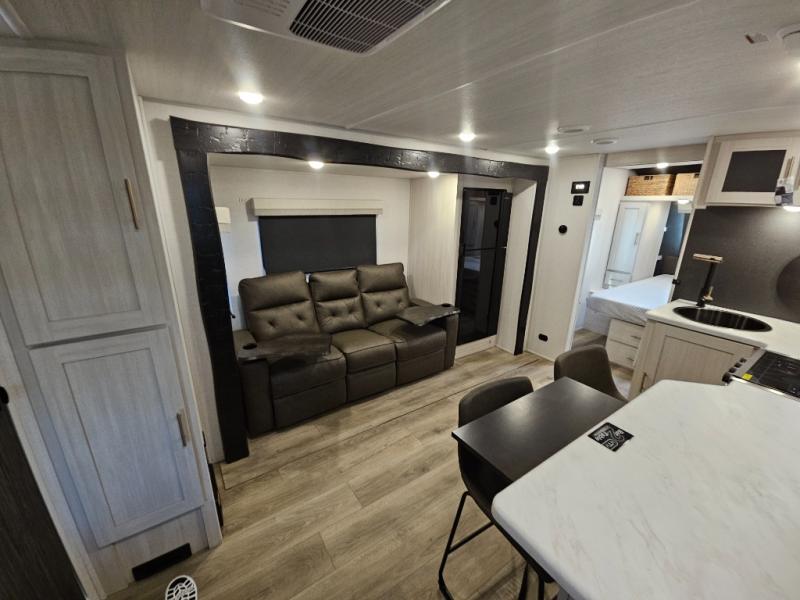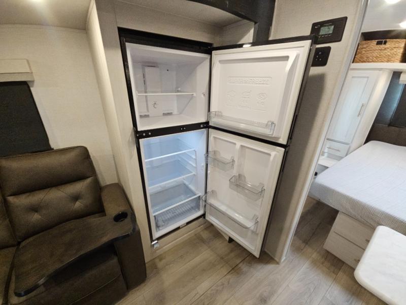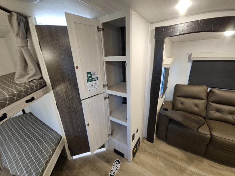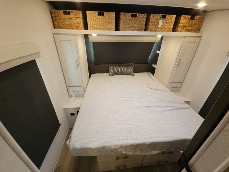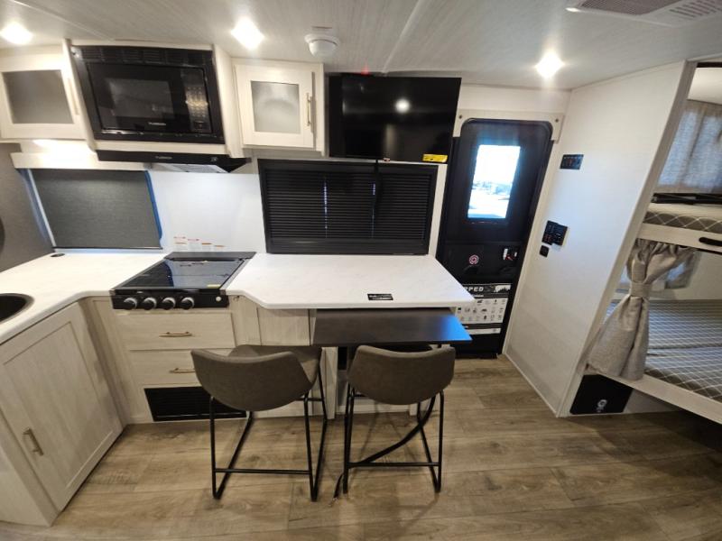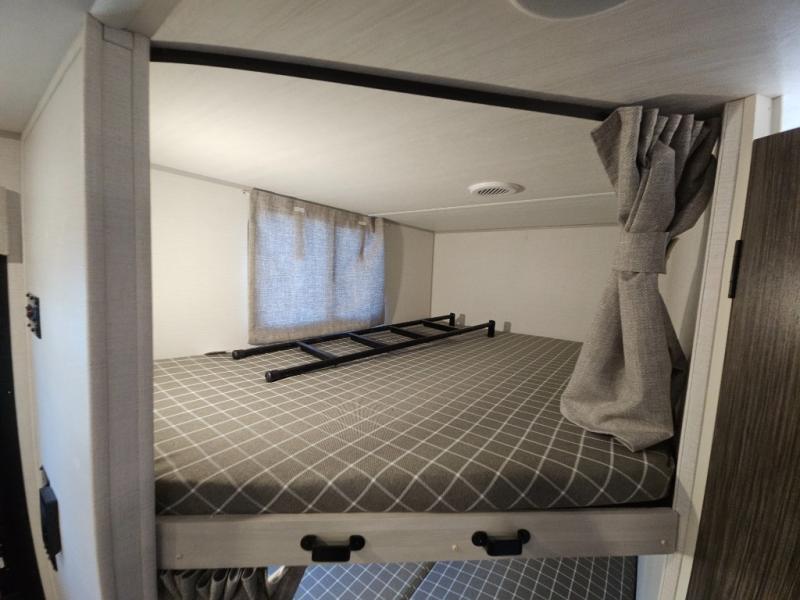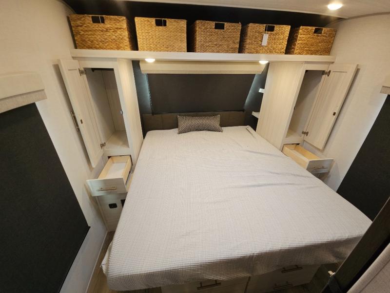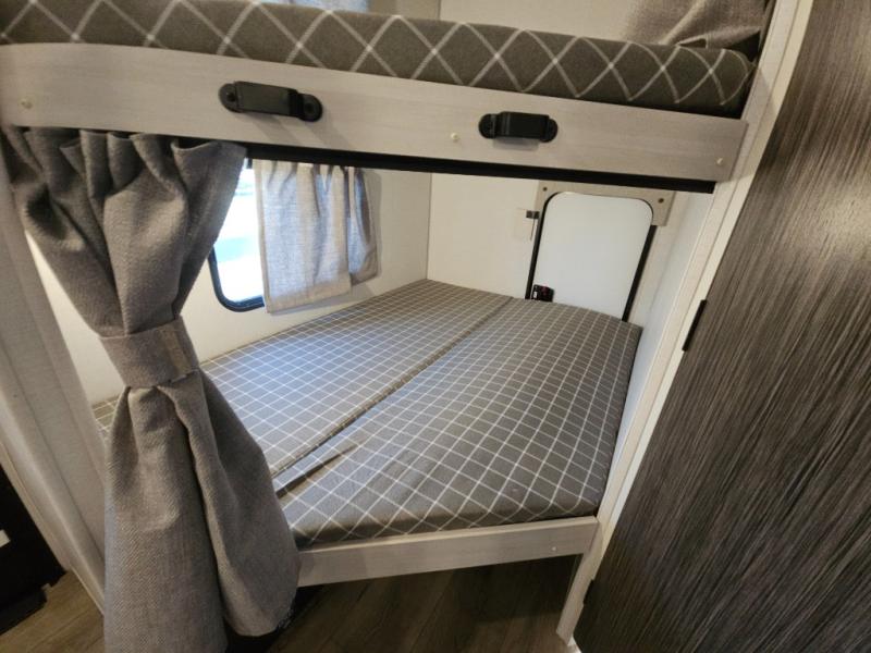 Discover ultimate comfort and functionality in travel with this incredible travel trailer. The full bathroom is a practical and functional space for personal care, ensuring comfort on every journey. Double bunk beds are ideal for families or travelers seeking additional cozy sleeping options. You can cook like a Michelin-star chef with the complete kitchen that comes with a pantry, fridge, an air fryer/microwave, and a countertop extension that adds extra space for culinary prep and serving meals with ease. Further, the dreamy primary bedroom features a custom king bed with wardrobes and end tables on each side of the bed, offering storage and practical spaces for optimal comfort and accessibility.