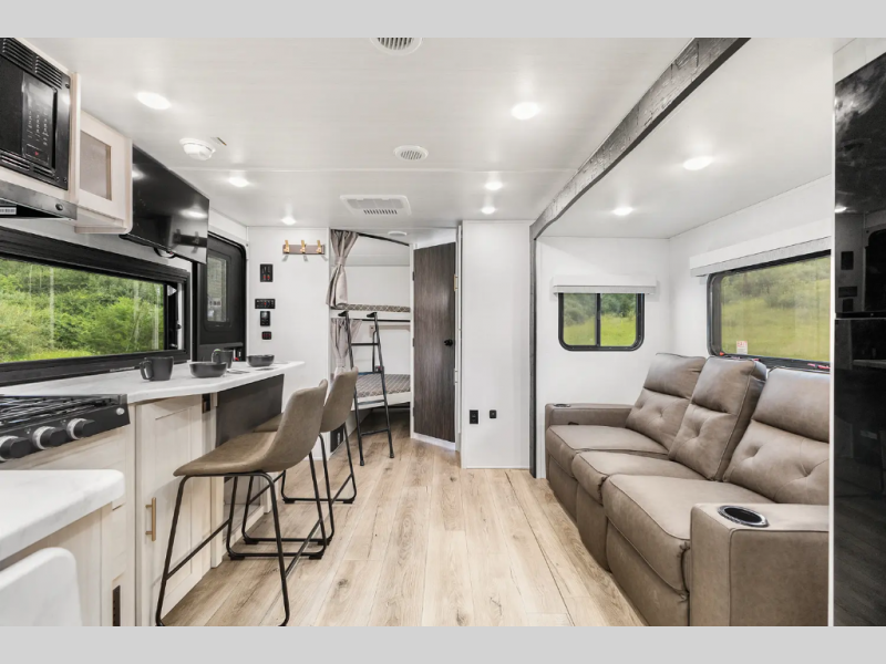 Discover ultimate comfort and functionality in travel with this incredible travel trailer. The full bathroom is a practical and functional space for personal care, ensuring comfort on every journey. Double bunk beds are ideal for families or travelers seeking additional cozy sleeping options. You can cook like a Michelin-star chef with the complete kitchen that comes with a pantry, fridge, an air fryer/microwave, and a countertop extension that adds extra space for culinary prep and serving meals with ease. Further, the dreamy primary bedroom features a custom king bed with wardrobes and end tables on each side of the bed, offering storage and practical spaces for optimal comfort and accessibility.