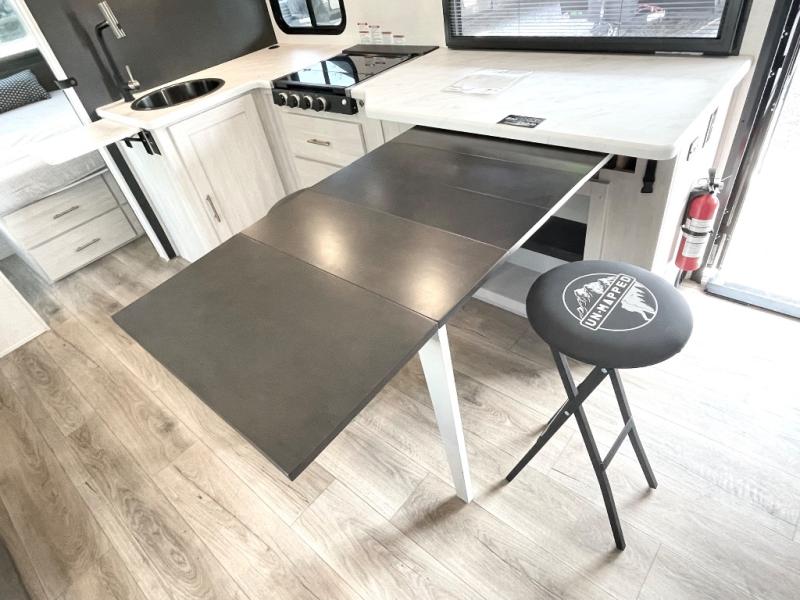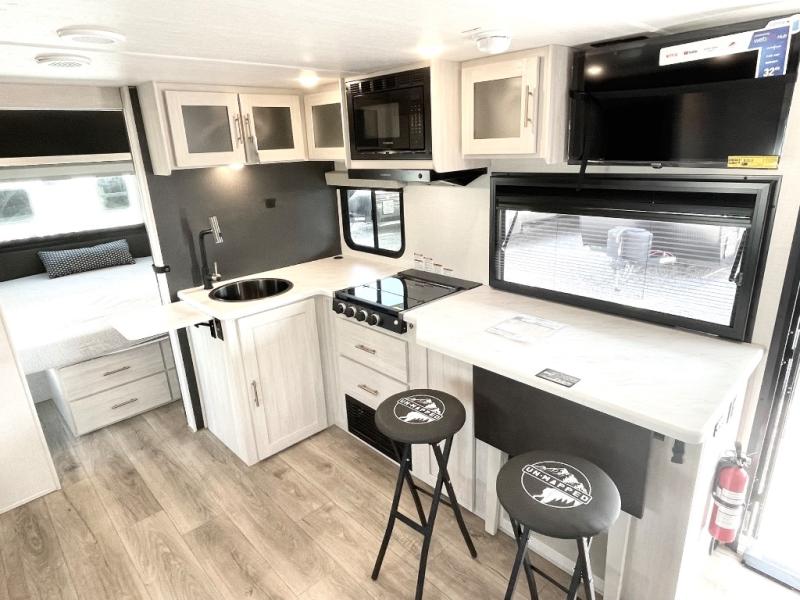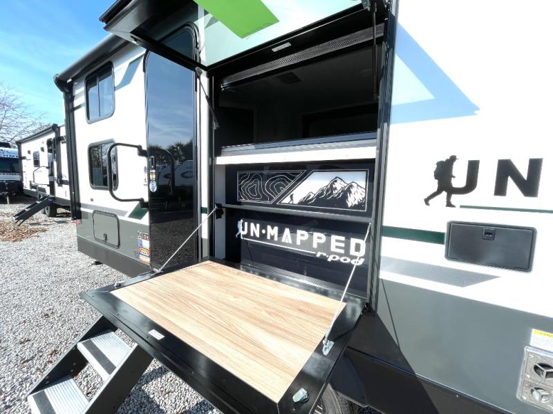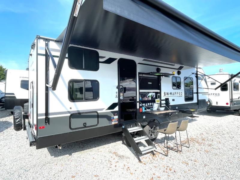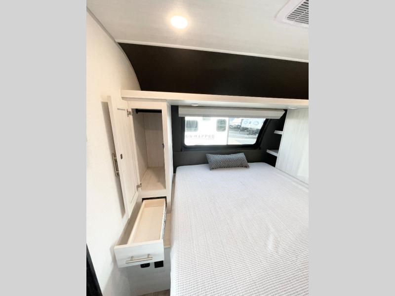 The Forest River Un-Mapped travel trailers deliver an unparalleled travel experience thanks to their incredible features, starting with the aluminum-framed floor with block foam insulation that ensures exceptional structural integrity and thermal efficiency, along with the sealed underbelly with forced heat & radiant foil barrier that provides superior insulation and heat management, and the power tongue jack facilitates easy maneuvering and stabilization of the trailer. Plus, the 30 Amp charge controller with solar inverter prep is ready for integration with solar power systems, catering to eco-conscious travelers seeking off-grid capabilities. Inside, you will find seamless Surf-X kitchen countertops that offer a sleek, durable surface and are easy to maintain for busy travelers. Further, the blackout roller shades will add privacy and light control for restful nights and cozy daytime retreats.