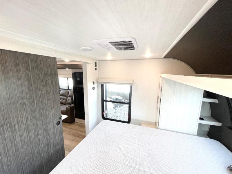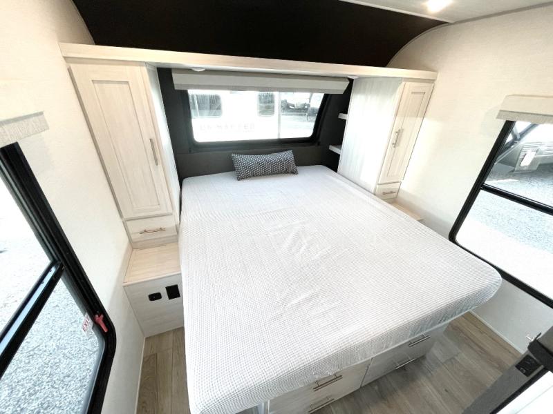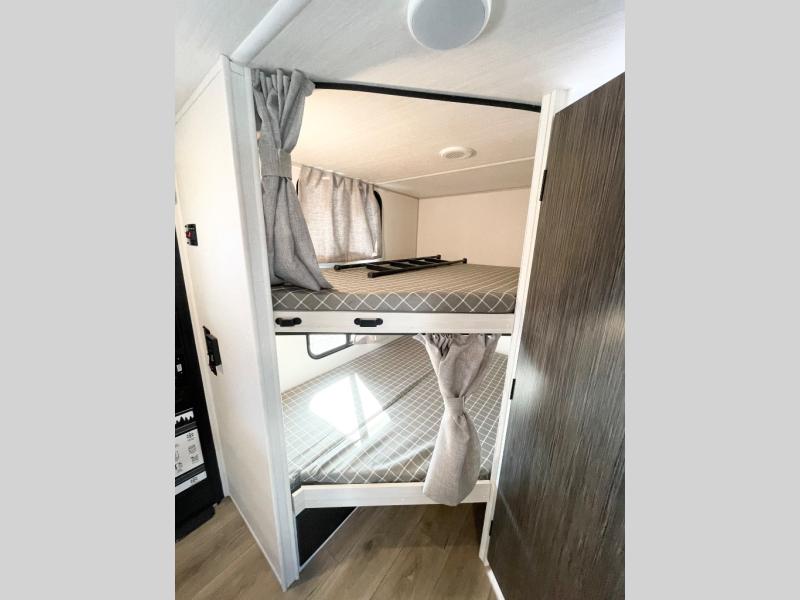 Discover ultimate comfort and functionality in travel with this incredible travel trailer. The full bathroom is a practical and functional space for personal care, ensuring comfort on every journey. Double bunk beds are ideal for families or travelers seeking additional cozy sleeping options. You can cook like a Michelin-star chef with the complete kitchen that comes with a pantry, fridge, an air fryer/microwave, and a countertop extension that adds extra space for culinary prep and serving meals with ease. Further, the dreamy primary bedroom features a custom king bed with wardrobes and end tables on each side of the bed, offering storage and practical spaces for optimal comfort and accessibility.