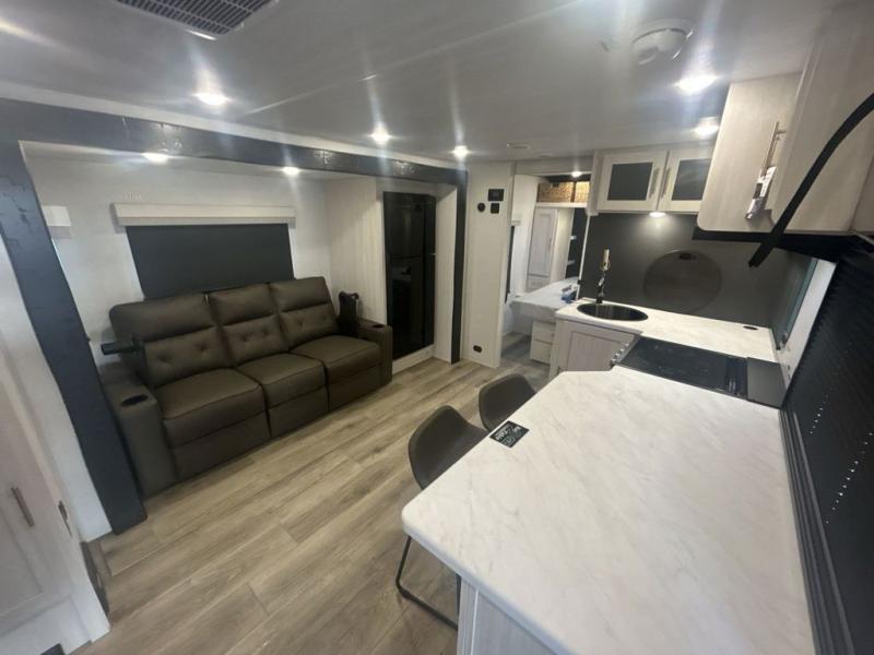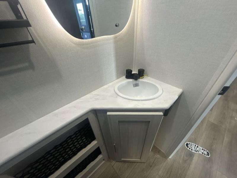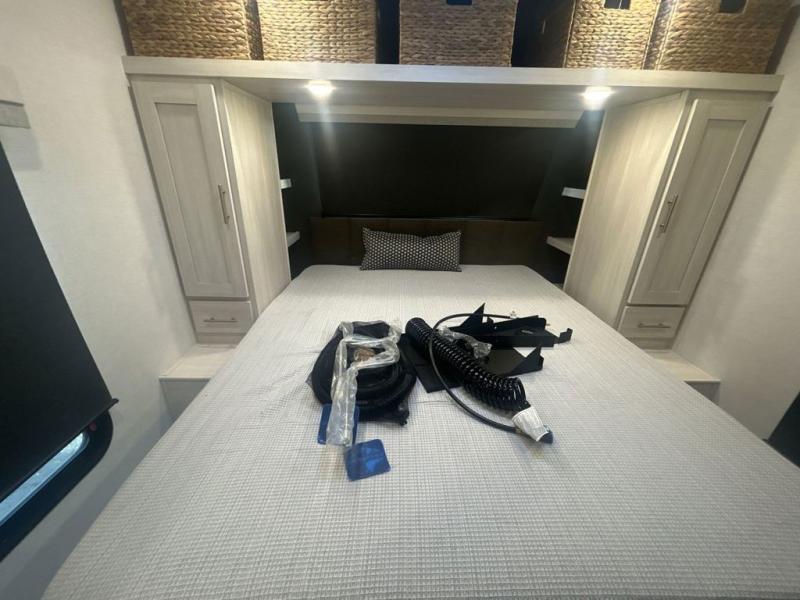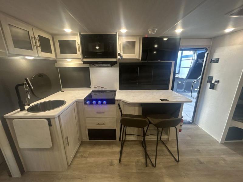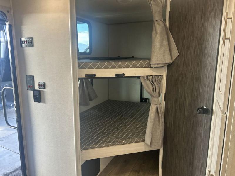 Discover ultimate comfort and functionality in travel with this incredible travel trailer. The full bathroom is a practical and functional space for personal care, ensuring comfort on every journey. Double bunk beds are ideal for families or travelers seeking additional cozy sleeping options. You can cook like a Michelin-star chef with the complete kitchen that comes with a pantry, fridge, an air fryer/microwave, and a countertop extension that adds extra space for culinary prep and serving meals with ease. Further, the dreamy primary bedroom features a custom king bed with wardrobes and end tables on each side of the bed, offering storage and practical spaces for optimal comfort and accessibility.