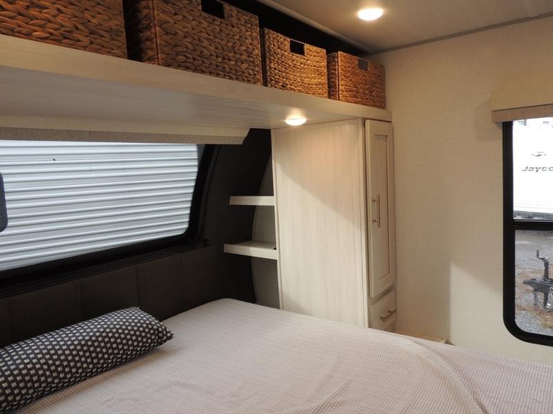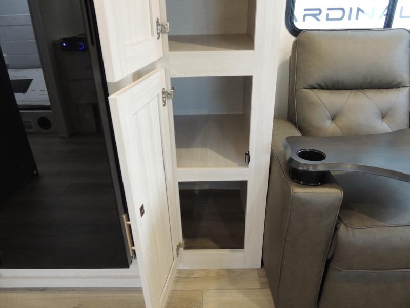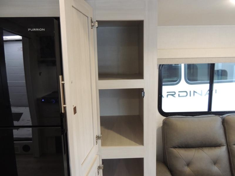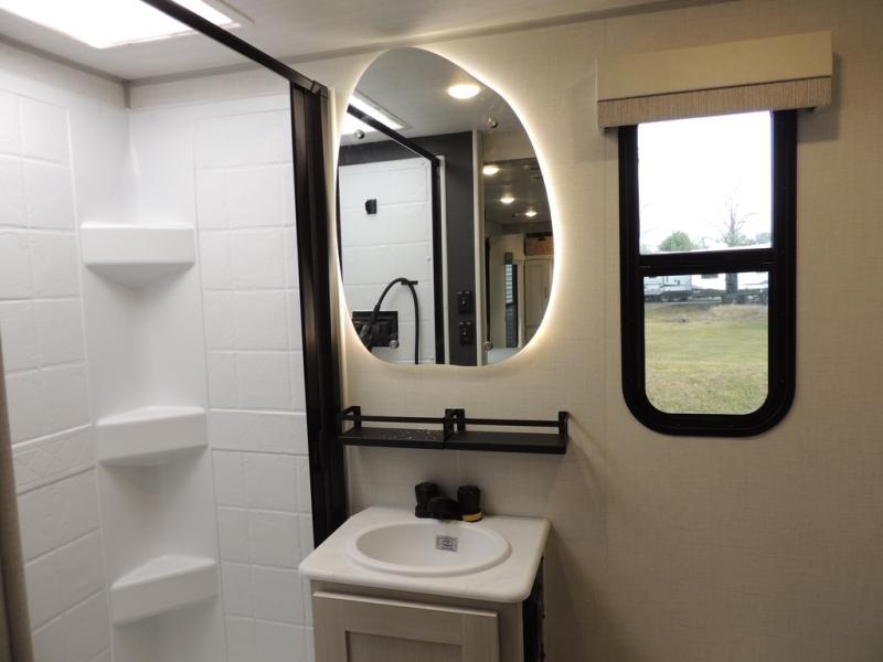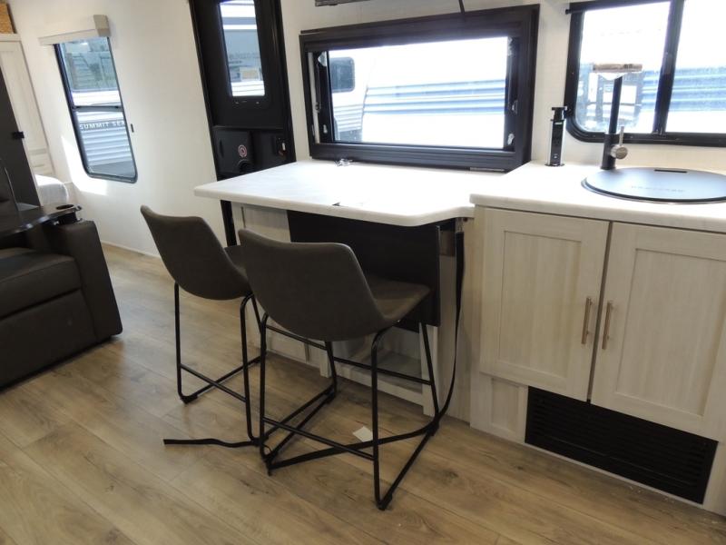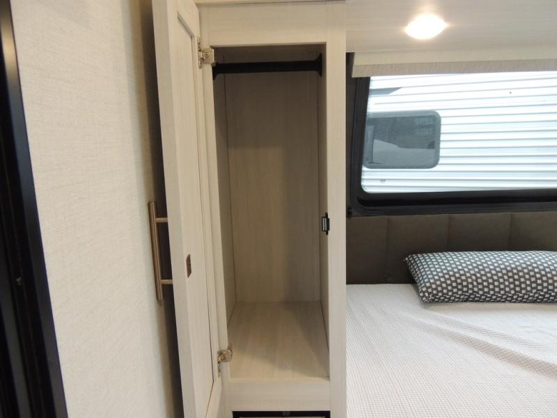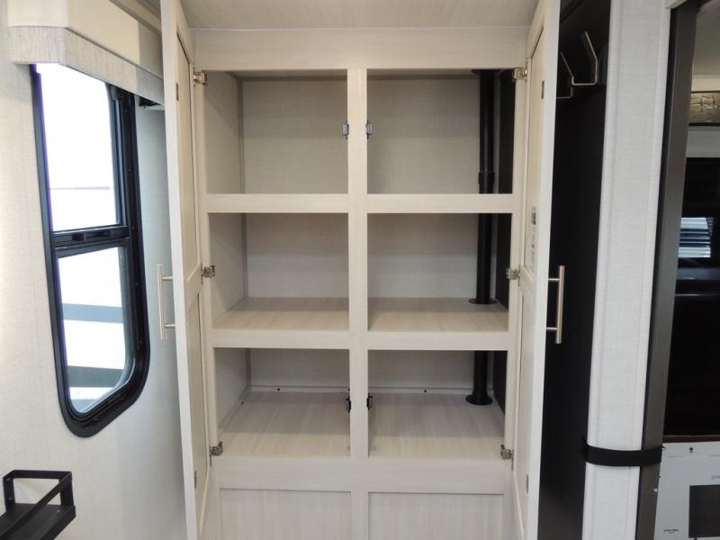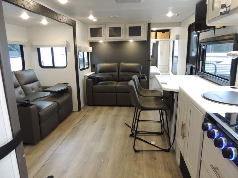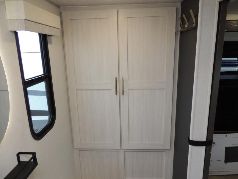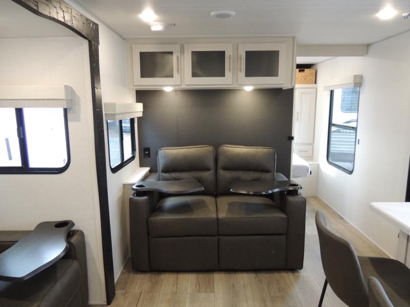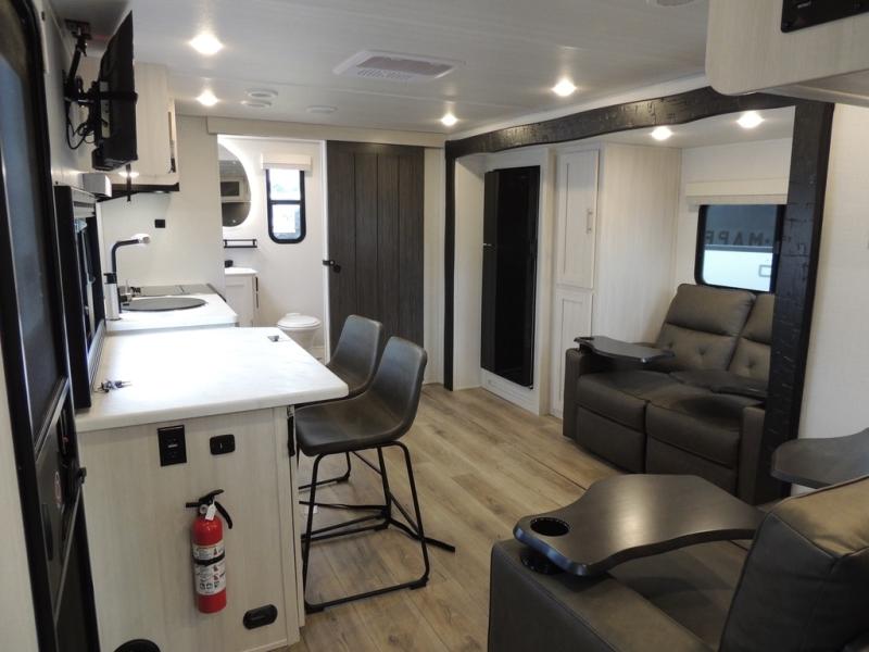 This travel trailer offers a comfortable and convenient layout rear bathroom with a linen closet, a private, well-appointed space for personal care with storage for linens, ensuring comfort on every journey. In the living room/kitchen combined area, you will find theater seating, a tri-fold sofa that offers versatile seating and additional space for guests or relaxation, adaptable to your travel needs, a fridge, a pantry for culinary supplies, an air fryer /microwave, a flip-up window, and overhead cabinets. The front bedroom will be your sanctuary of relaxation after a long day of exploring. The outside kitchen is the cherry on top, since it is ideal for alfresco cooking and dining, perfect for savoring meals amidst scenic surroundings and enjoying the outdoors with loved ones!