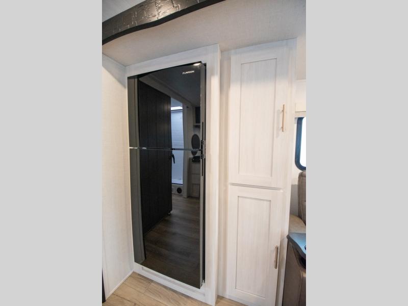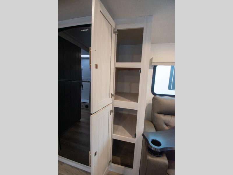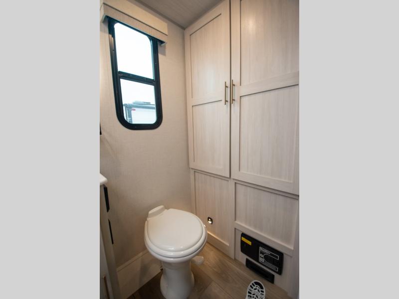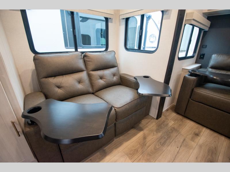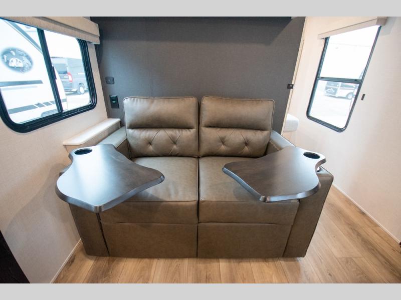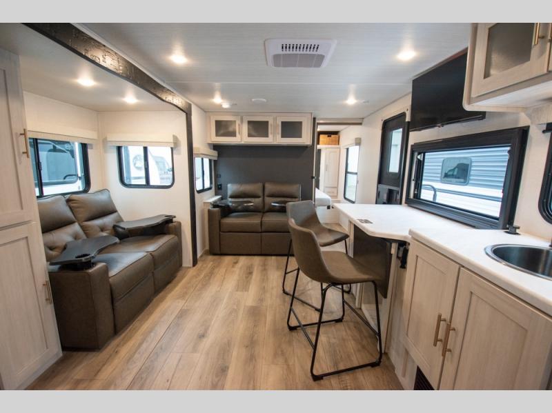 This travel trailer offers a comfortable and convenient layout rear bathroom with a linen closet, a private, well-appointed space for personal care with storage for linens, ensuring comfort on every journey. In the living room/kitchen combined area, you will find theater seating, a tri-fold sofa that offers versatile seating and additional space for guests or relaxation, adaptable to your travel needs, a fridge, a pantry for culinary supplies, an air fryer /microwave, a flip-up window, and overhead cabinets. The front bedroom will be your sanctuary of relaxation after a long day of exploring. The outside kitchen is the cherry on top, since it is ideal for alfresco cooking and dining, perfect for savoring meals amidst scenic surroundings and enjoying the outdoors with loved ones!
